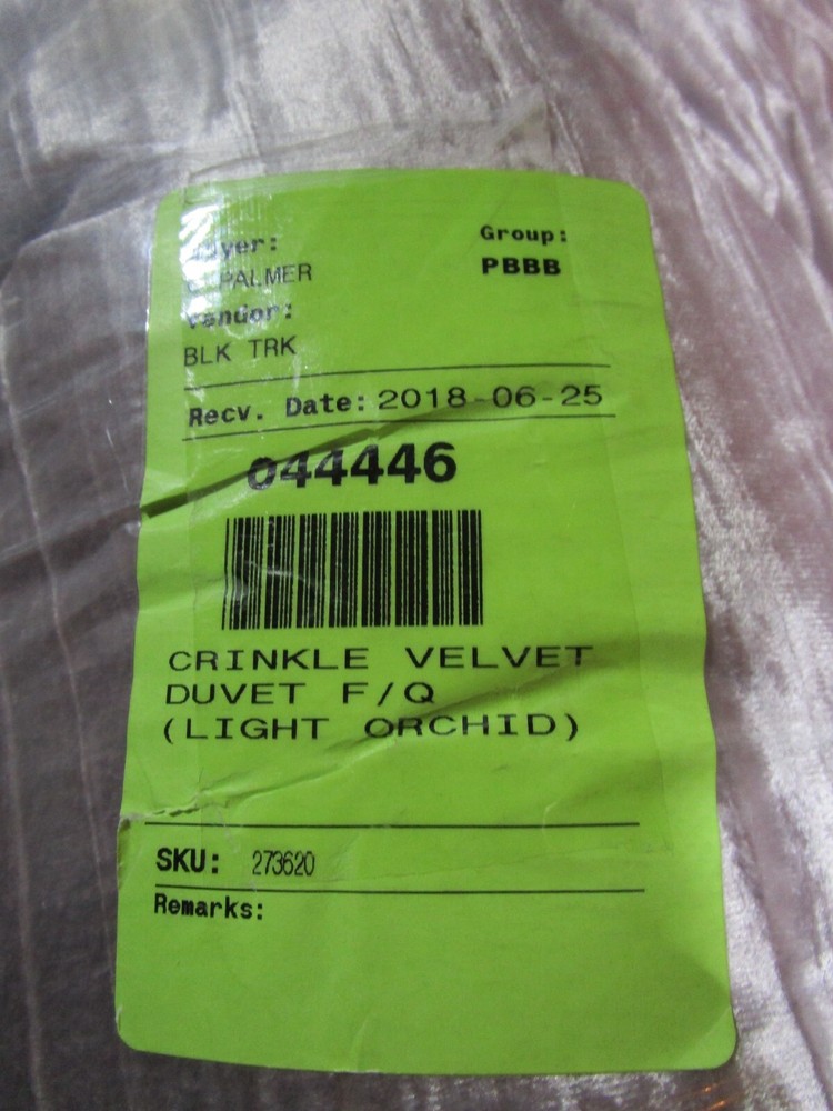 Up For Auction is - Pottery Barn crinkle velvet Duvet Cover full queen ligh orchid photo shoot sample Note duvet was a Pottery Barn Photo shoot sample has numbers on the inside. may be missing all tags Smoke and pet free home. with crinkle velvets