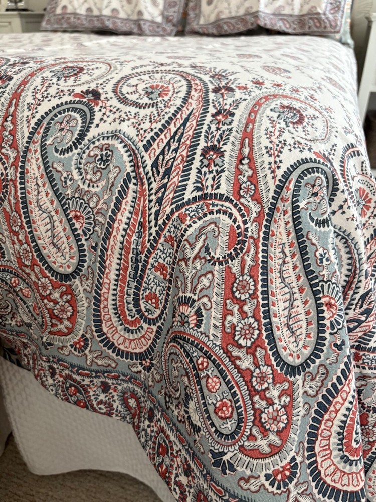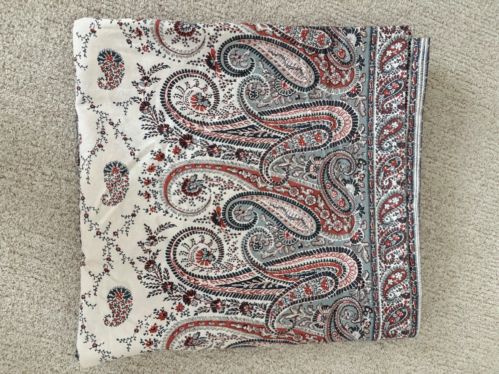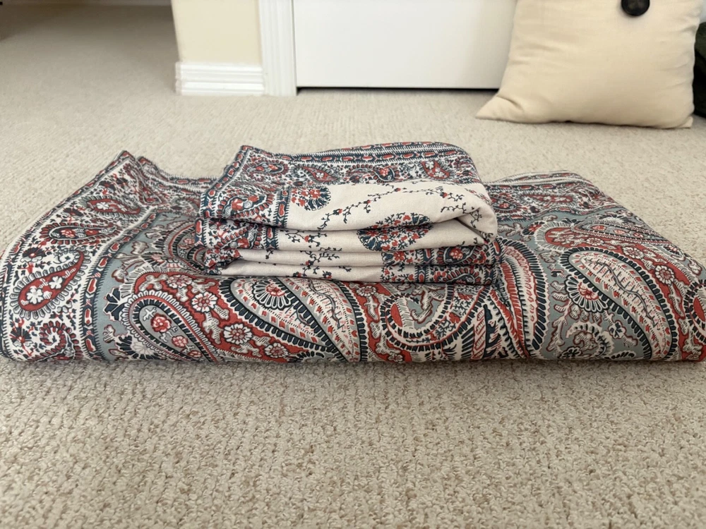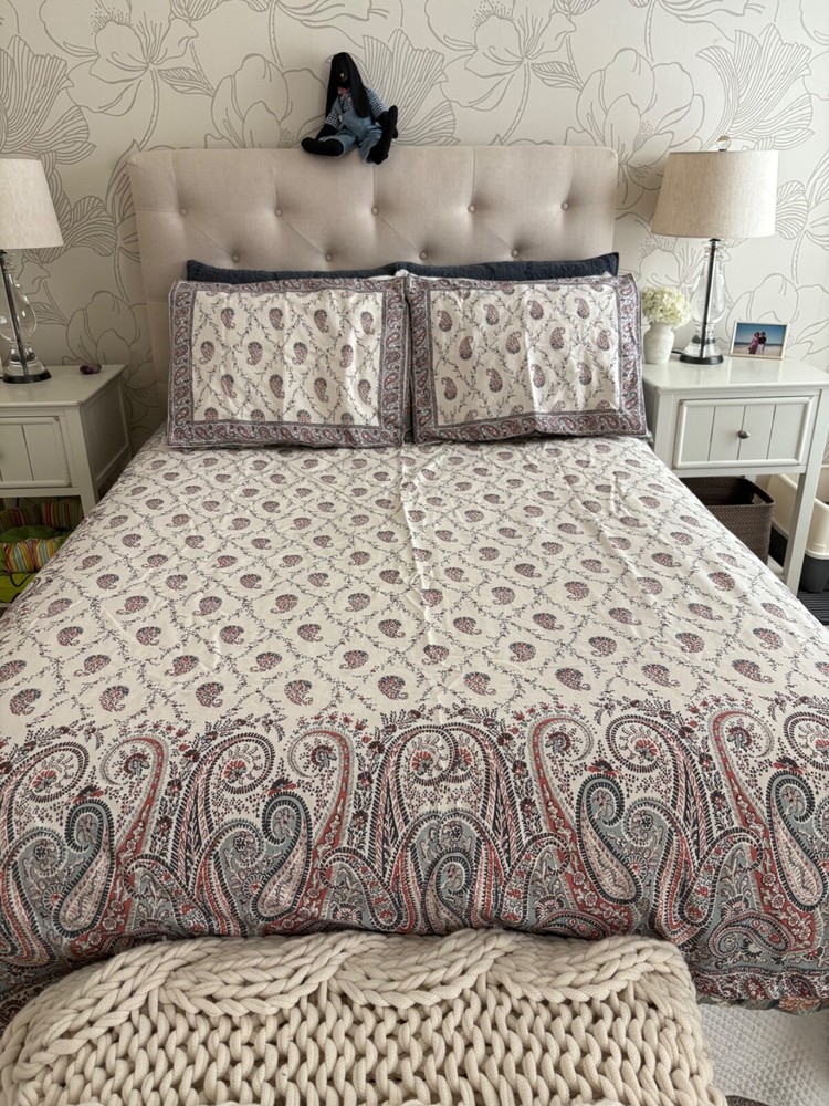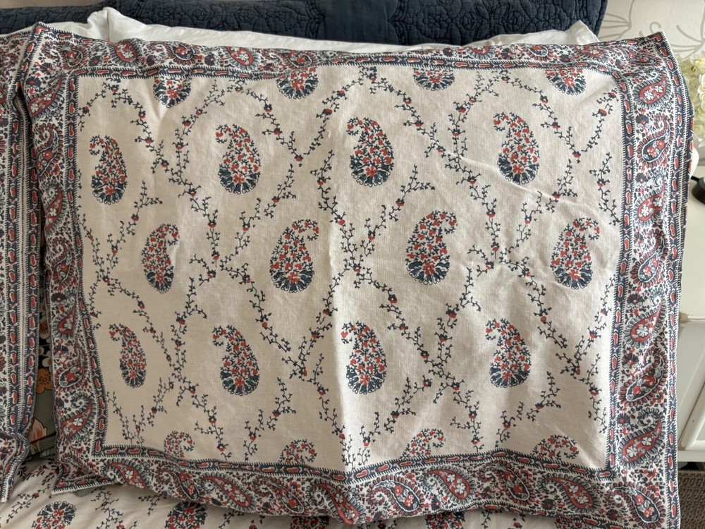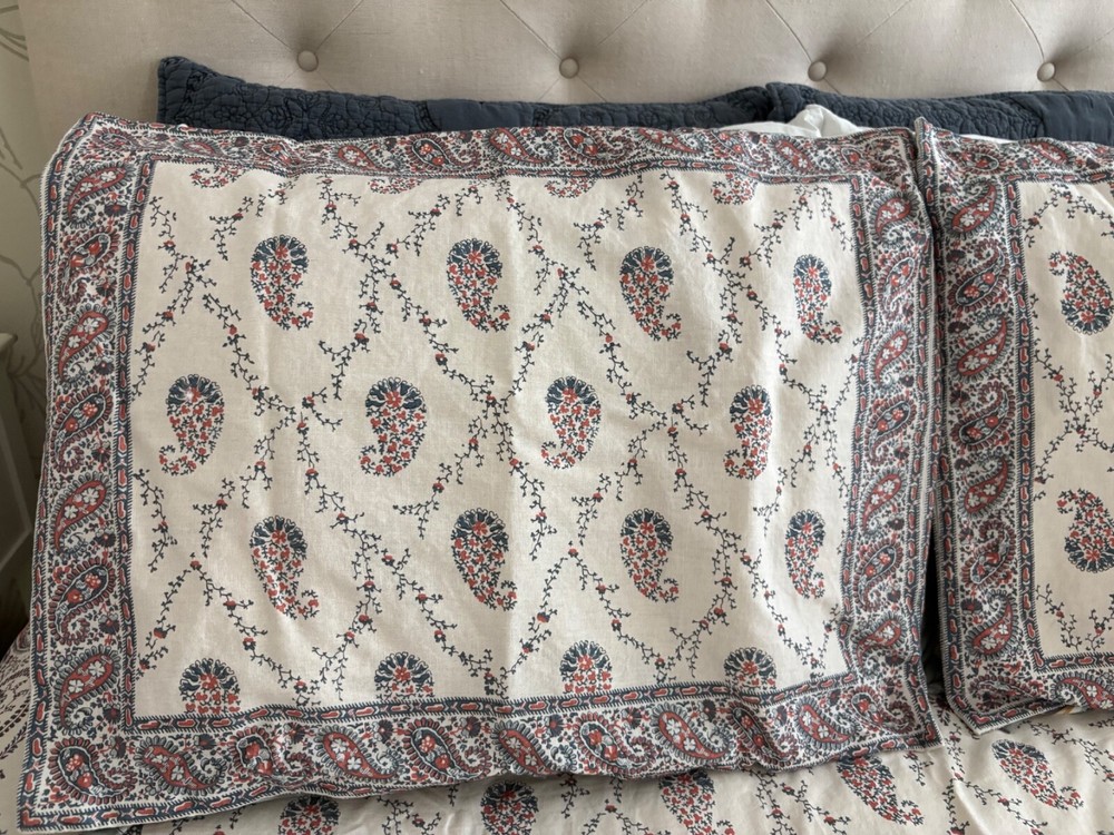 Pottery Barn double/full duvet cover and two standard shams. Cotton/linen blend. Paisley theme. Cream is the dominant color with navy and rust as secondary colors. The duvet cover has a zip closure. Pocket closure shams. These items were never slept on ever. They were on a guest bed that was never used. They are clean and in excellent condition.