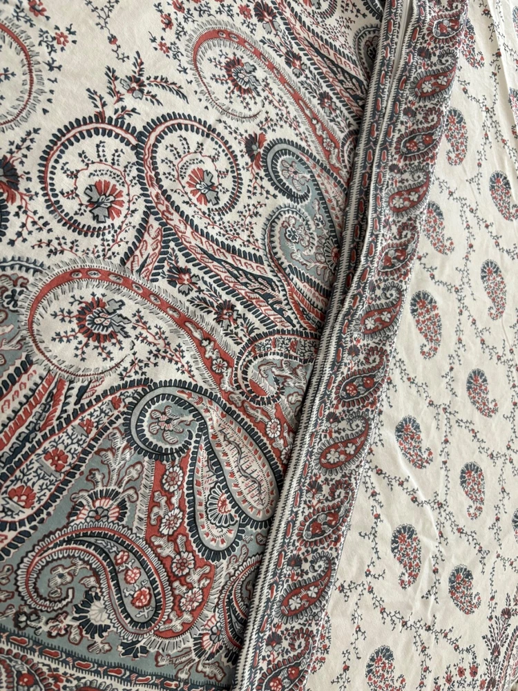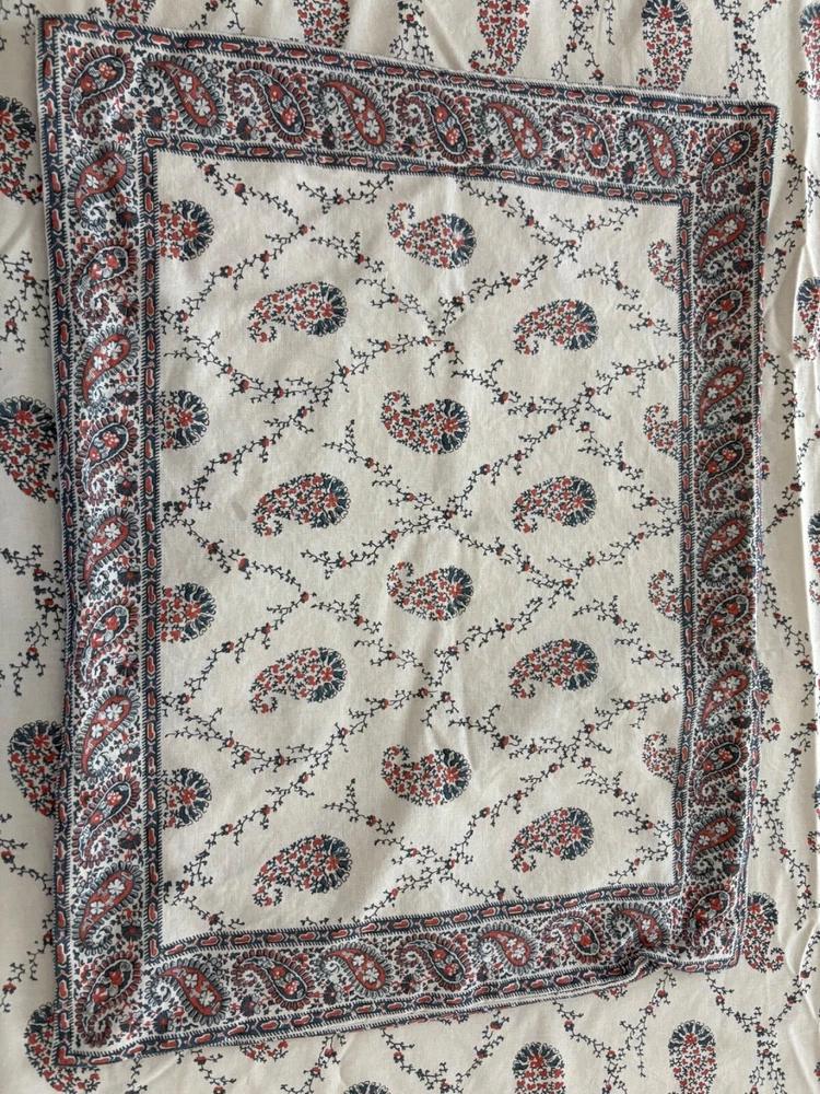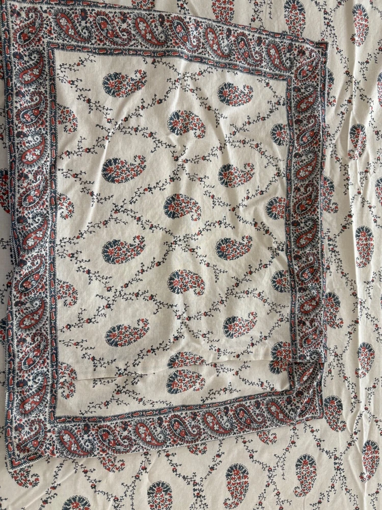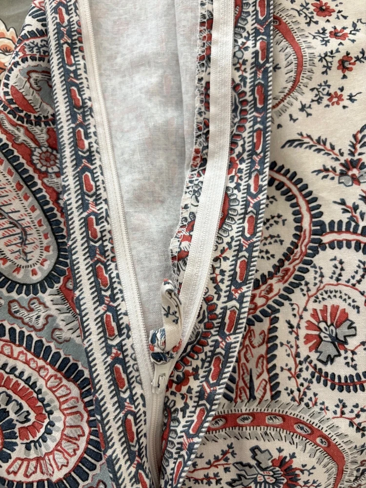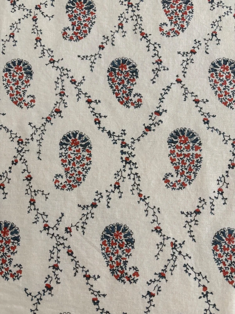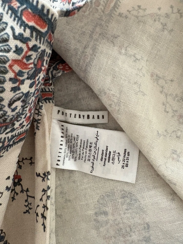Pottery Barn double/full duvet cover and two standard shams. Cotton/linen blend. Paisley theme. Cream is the dominant color with navy and rust as secondary colors. The duvet cover has a zip closure. Pocket closure shams. These items were never slept on ever. They were on a guest bed that was never used. They are clean and in excellent condition.