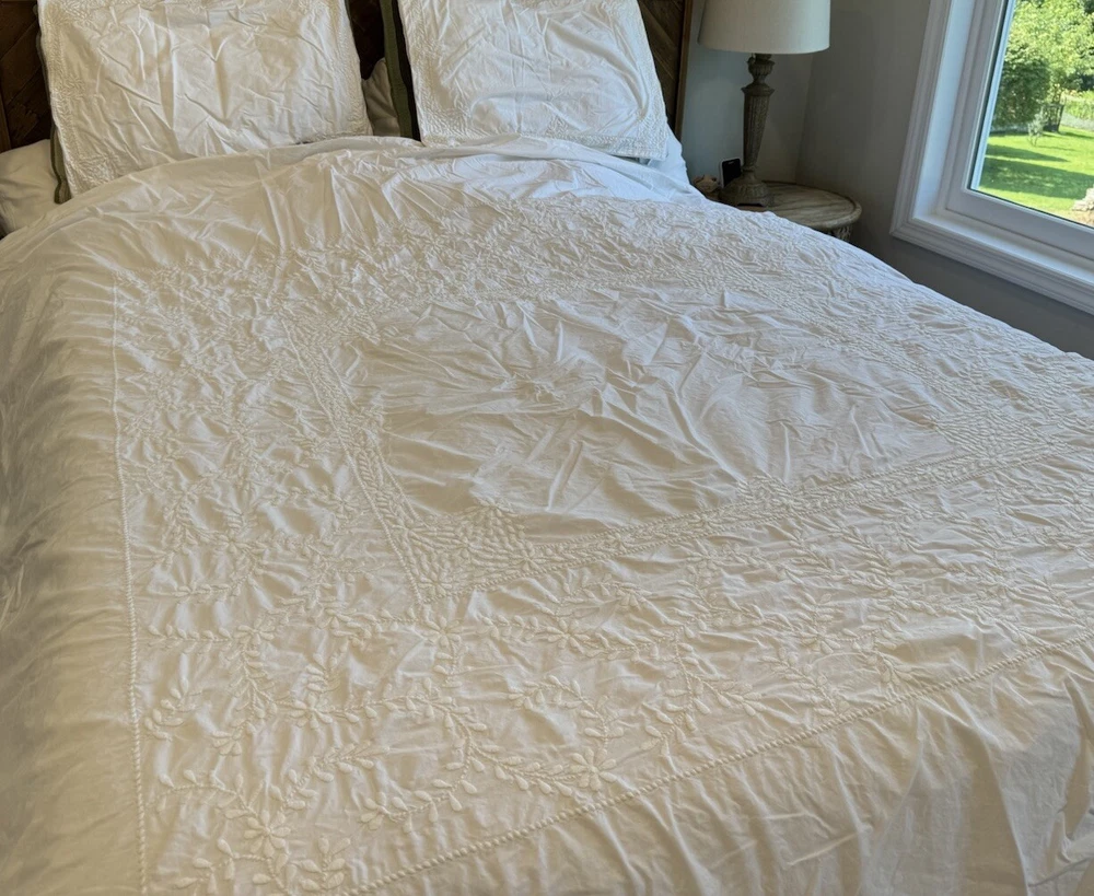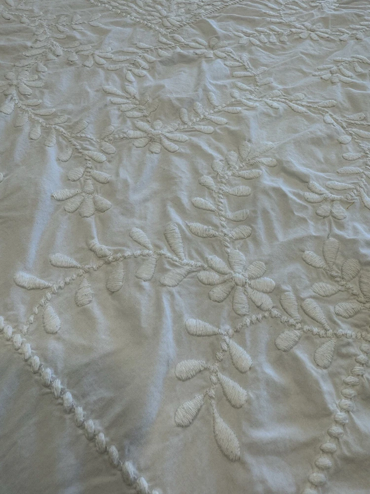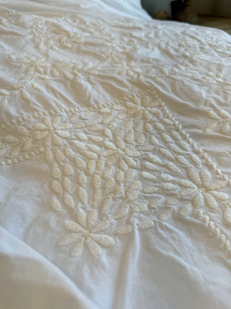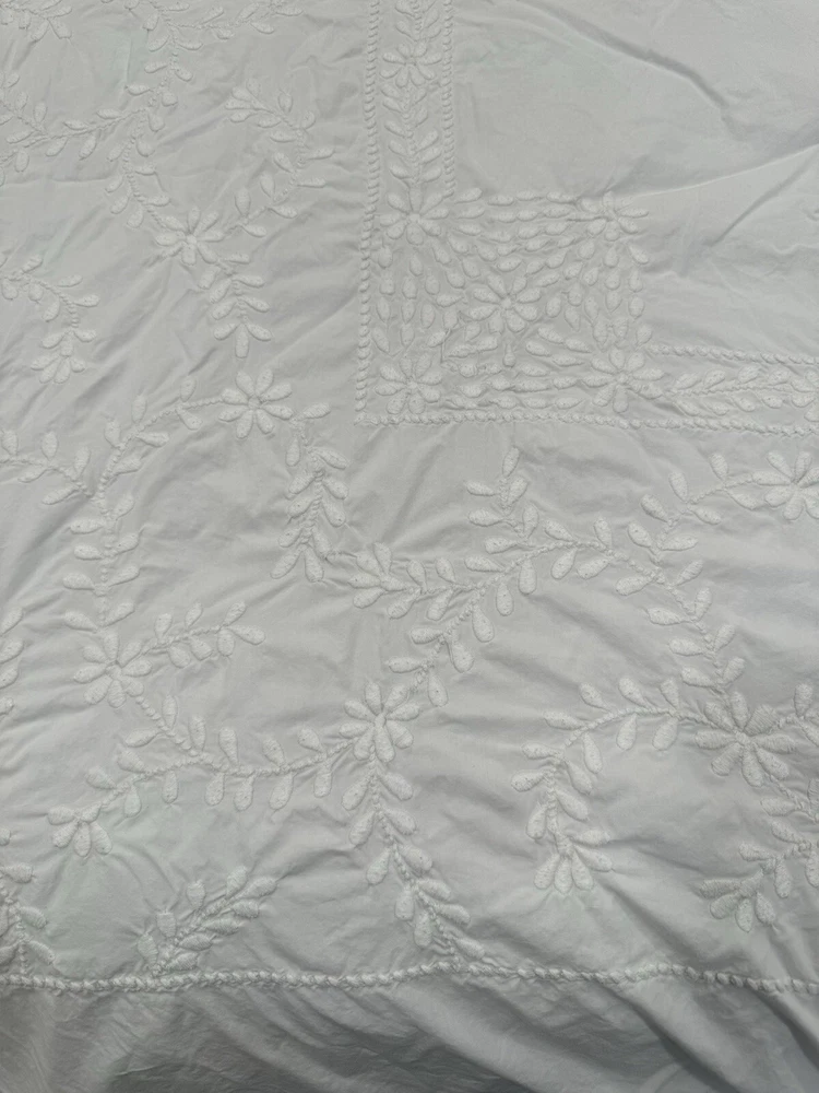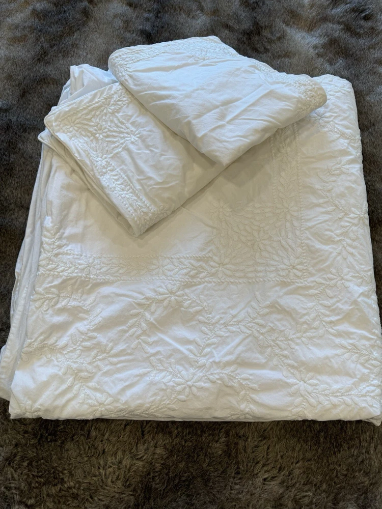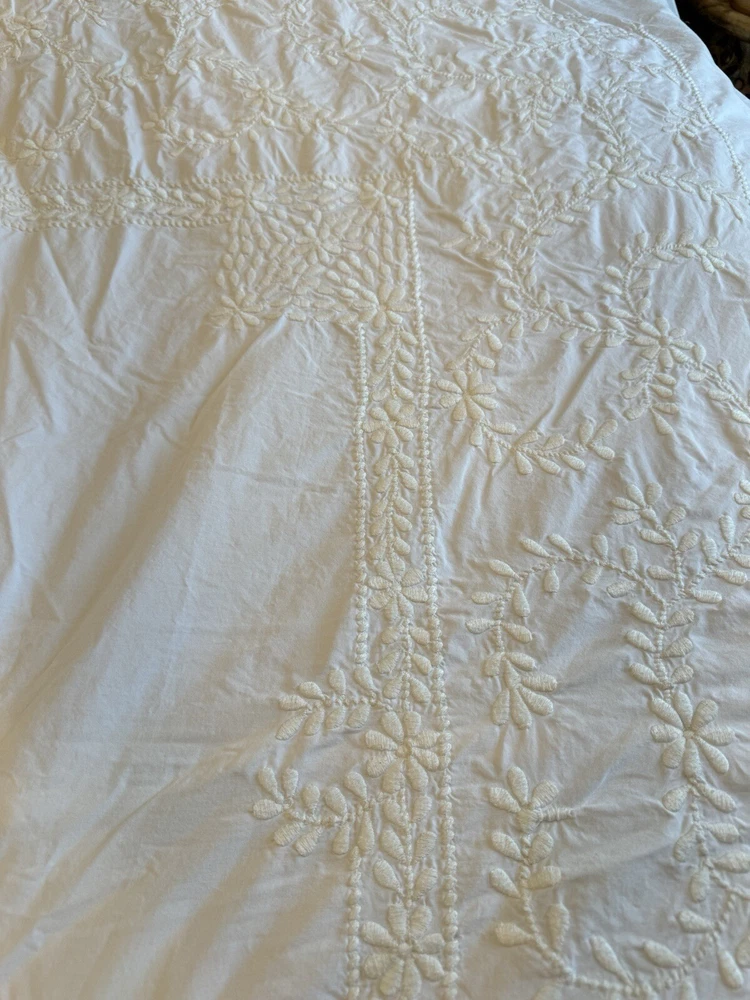 Pottery Barn duvet bed cover creme floral embroidered 100 " wide X 94 " length . (Queen size) overall, very good condition. the back side is plain.and two standard pillows 100% cotton.color is very light cram or white ( it’s not white and not cram . Very little cram please see all pictures . very good condition. updated with better pictures of the light.