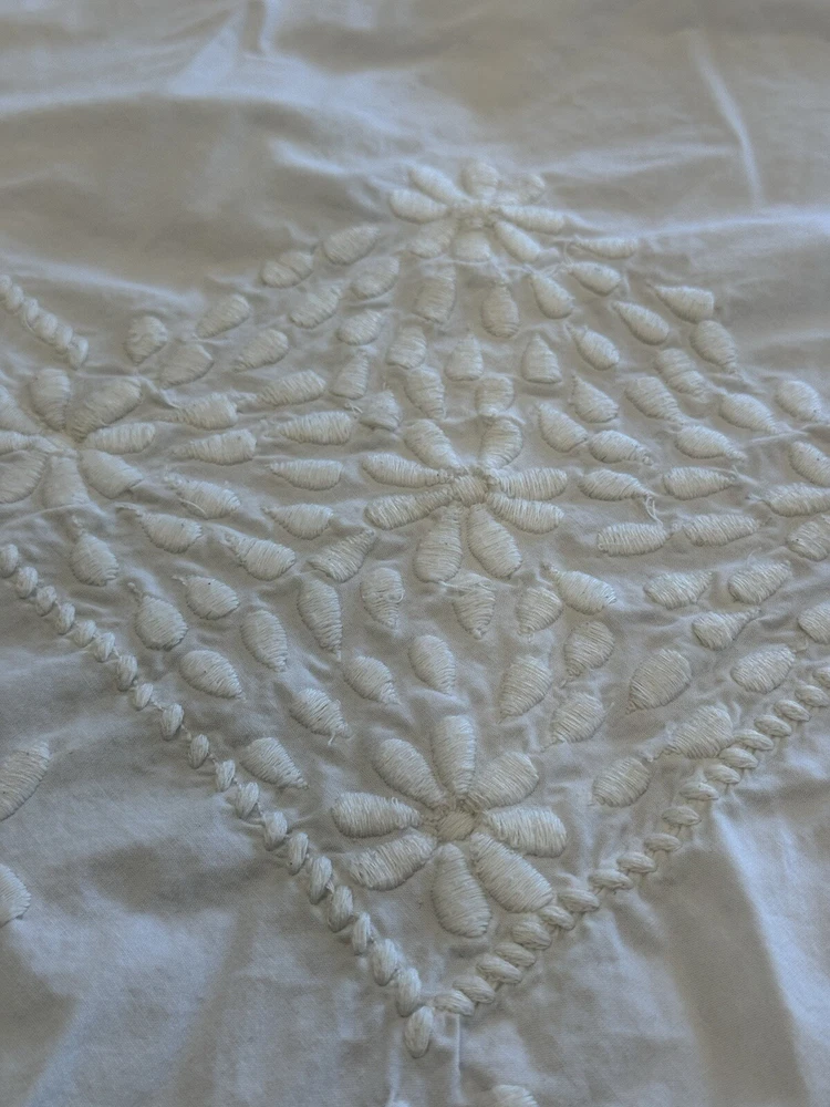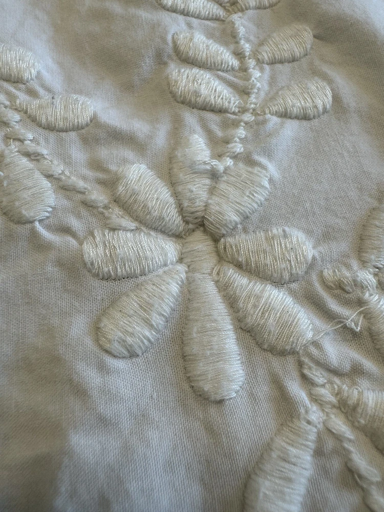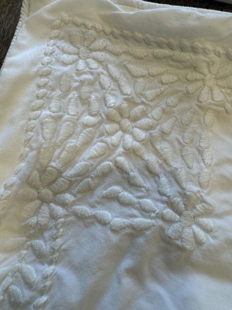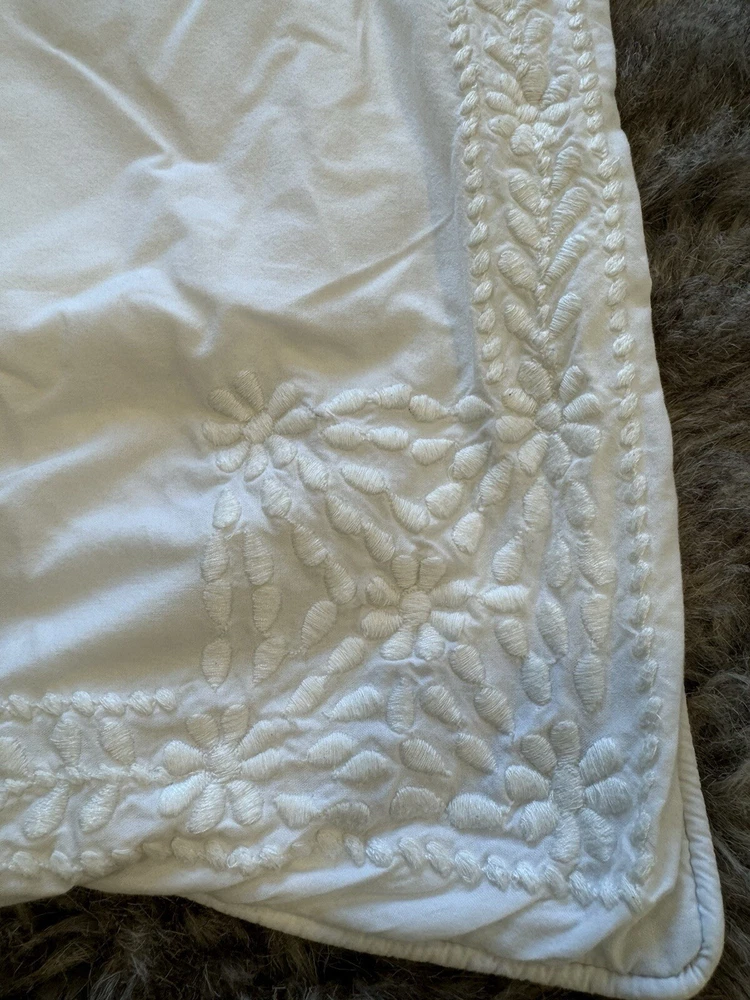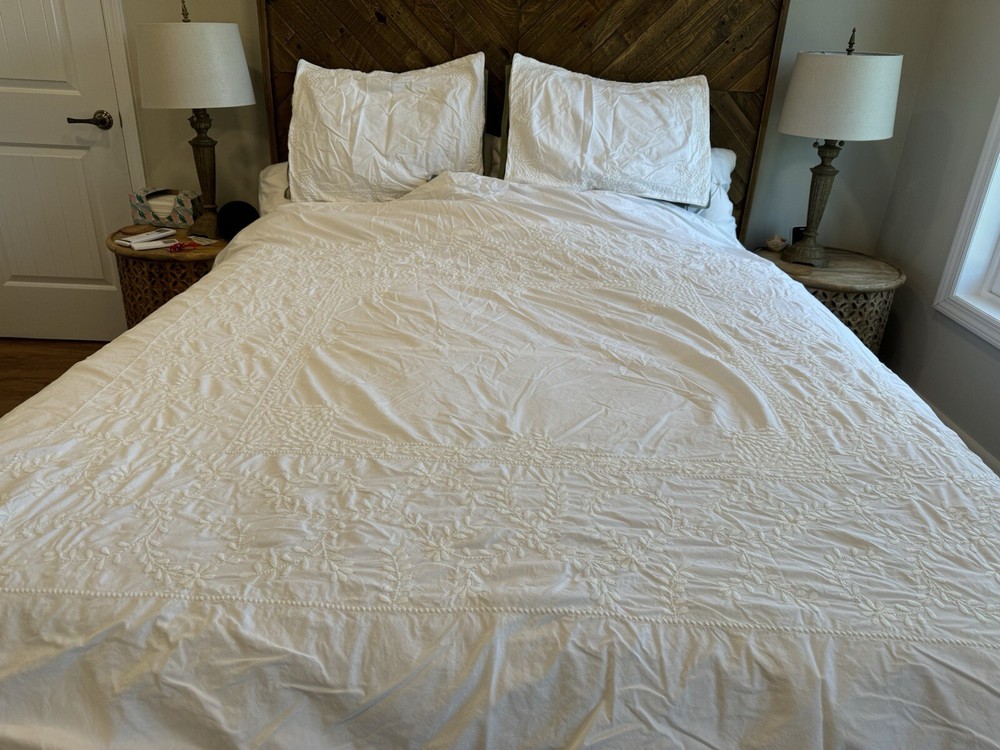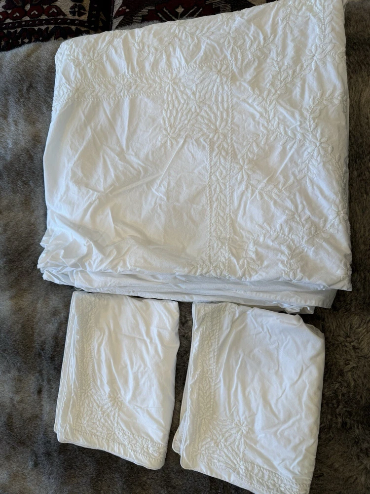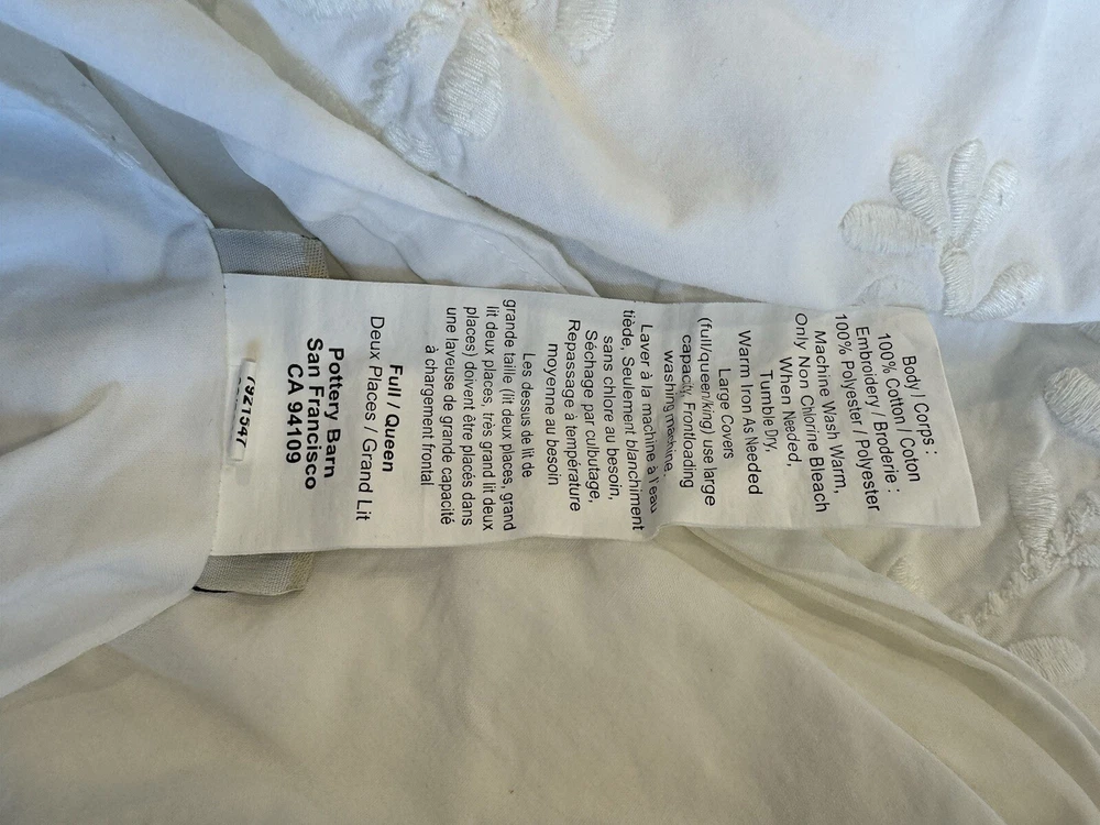 Pottery Barn duvet bed cover creme floral embroidered 100 " wide X 94 " length . (Queen size) overall, very good condition. the back side is plain.and two standard pillows 100% cotton.color is very light cram or white ( it’s not white and not cram . Very little cram please see all pictures . very good condition. updated with better pictures of the light.