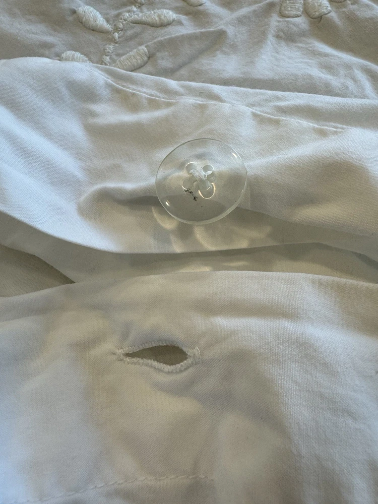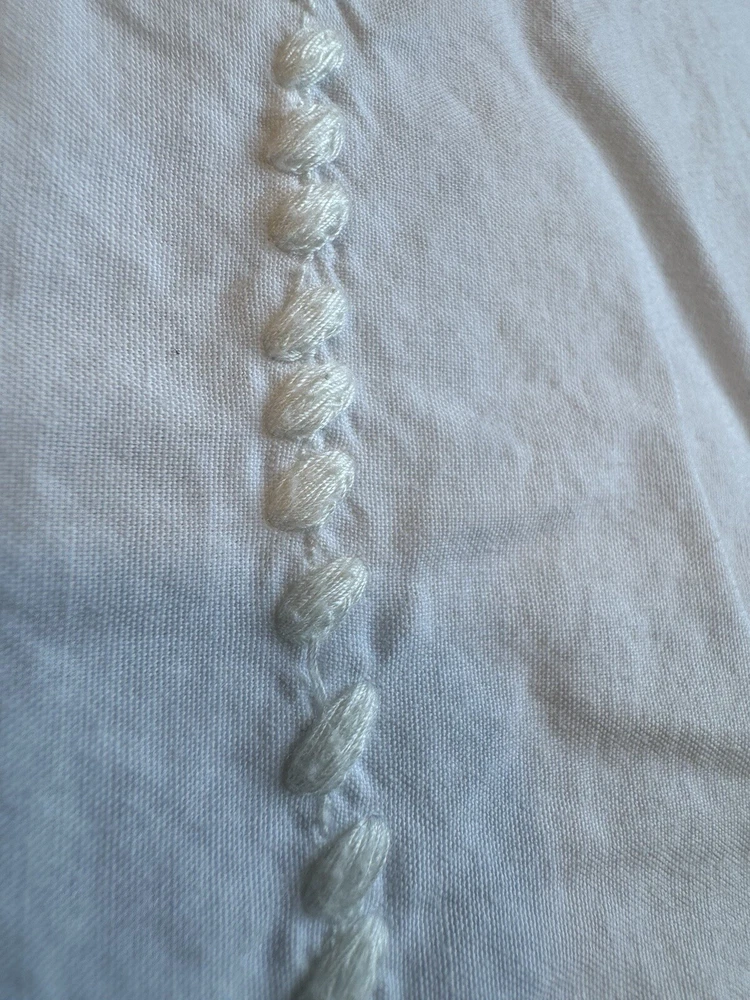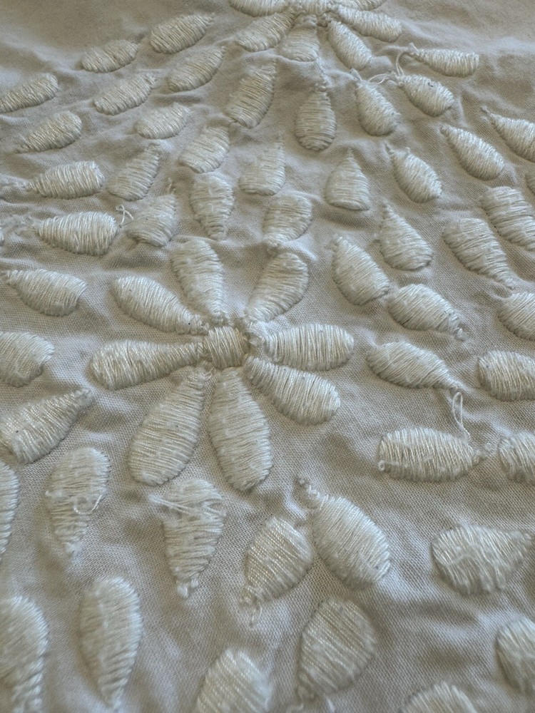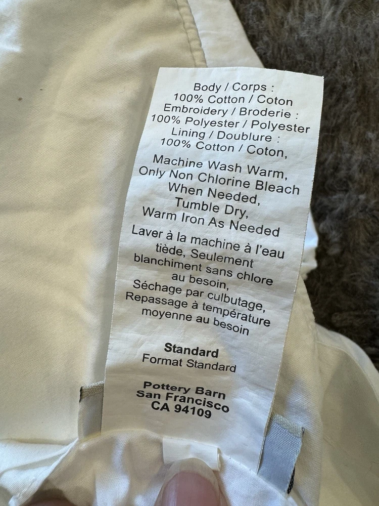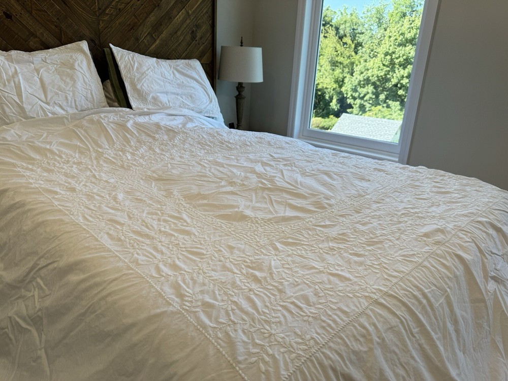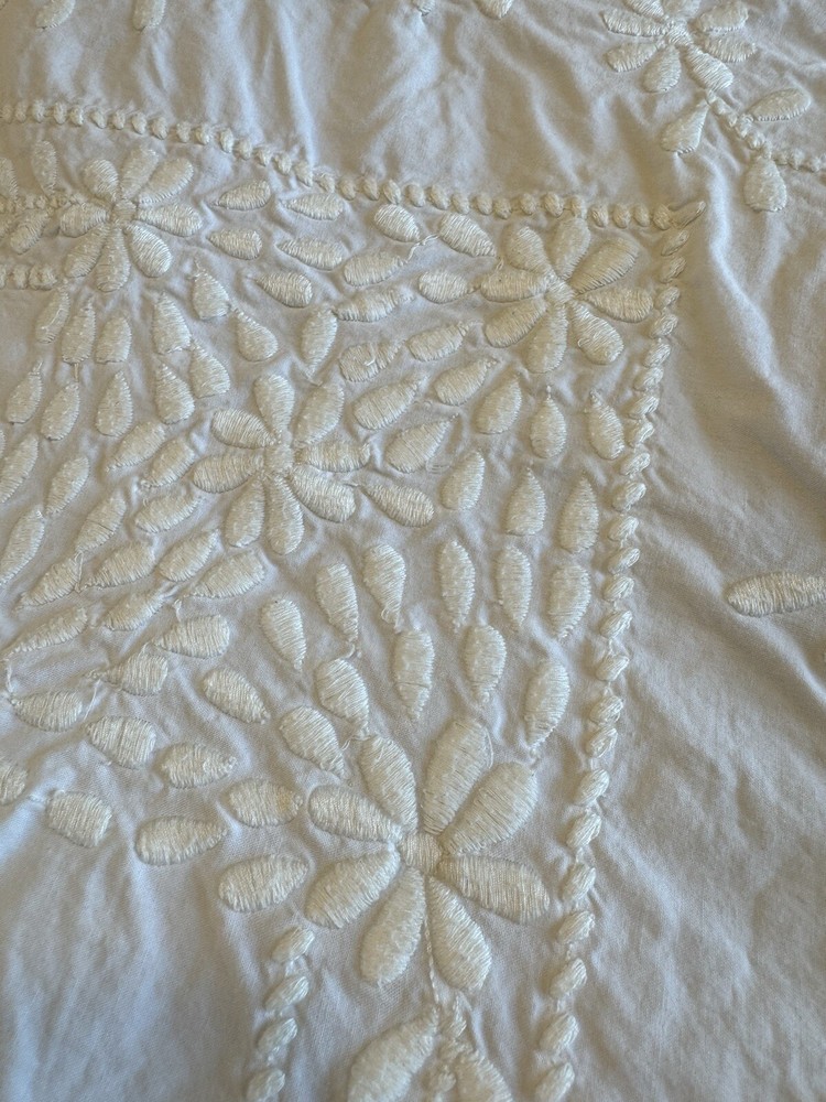 Pottery Barn duvet bed cover creme floral embroidered 100 " wide X 94 " length . (Queen size) overall, very good condition. the back side is plain.and two standard pillows 100% cotton.color is very light cram or white ( it’s not white and not cram . Very little cram please see all pictures . very good condition. updated with better pictures of the light.
