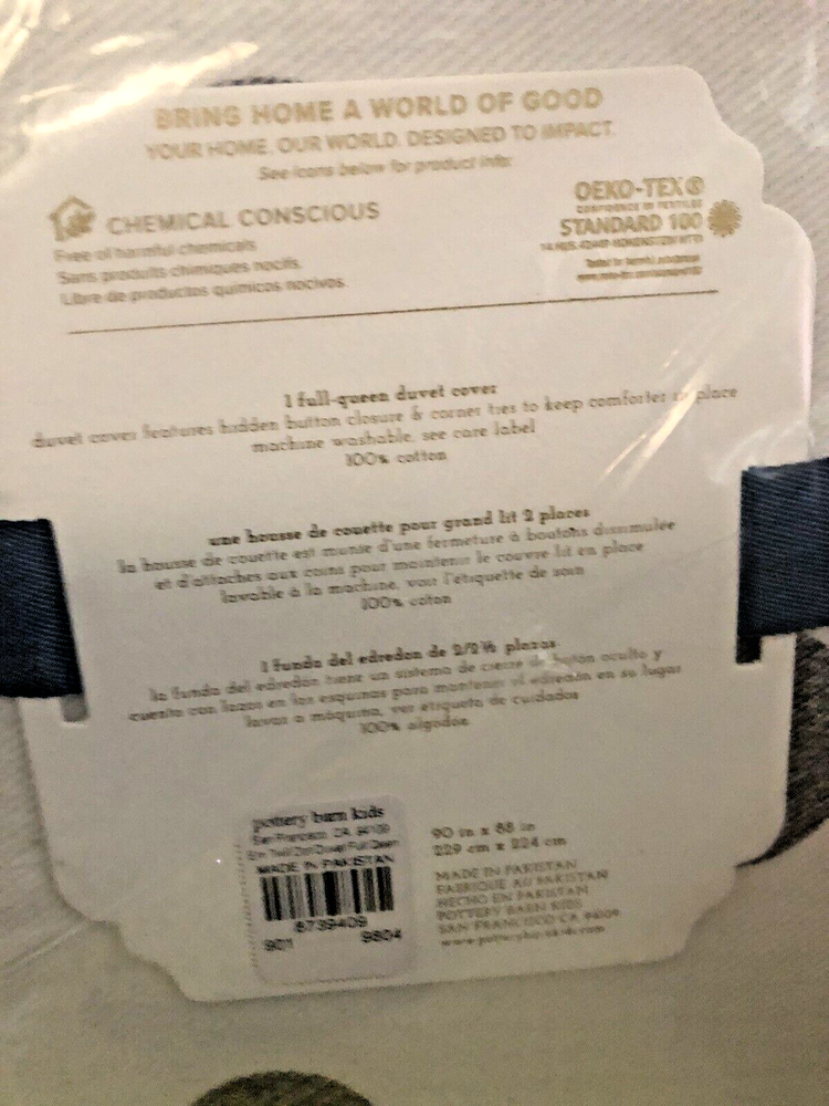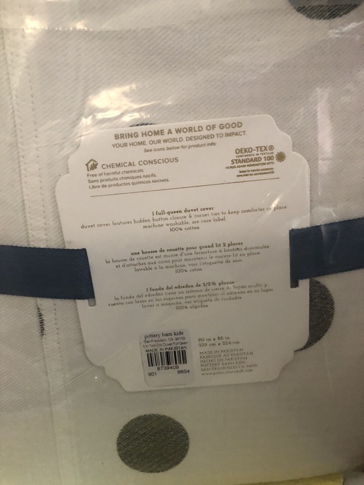 NEW in sealed package, Pottery Barn Kids Twill Extra Washed Denim Gray Polka Dot Duvet Cover Emily&Meritt. Pottery Barn Kids Emily Meritt extra washed twill denmin duvet cover. The white with gray dots duvet cover is made of 100% cotton material, ensuring comfort and durability. The all-season duvet cover is perfect for keeping your child cozy. This duvet cover is designed with buttons for easy closure and is suitable for a Full/queen-sized bed measuring 90 x 88 inches. The gray color of the duvet cover complements any decor theme, making it a versatile addition to your child's bedroom. Purchase this duvet cover today to give your child a comfortable and stylish sleeping experience.