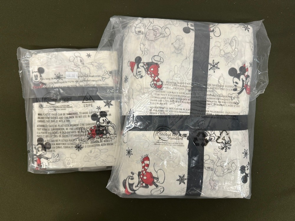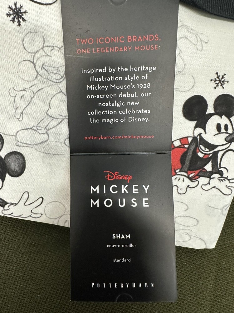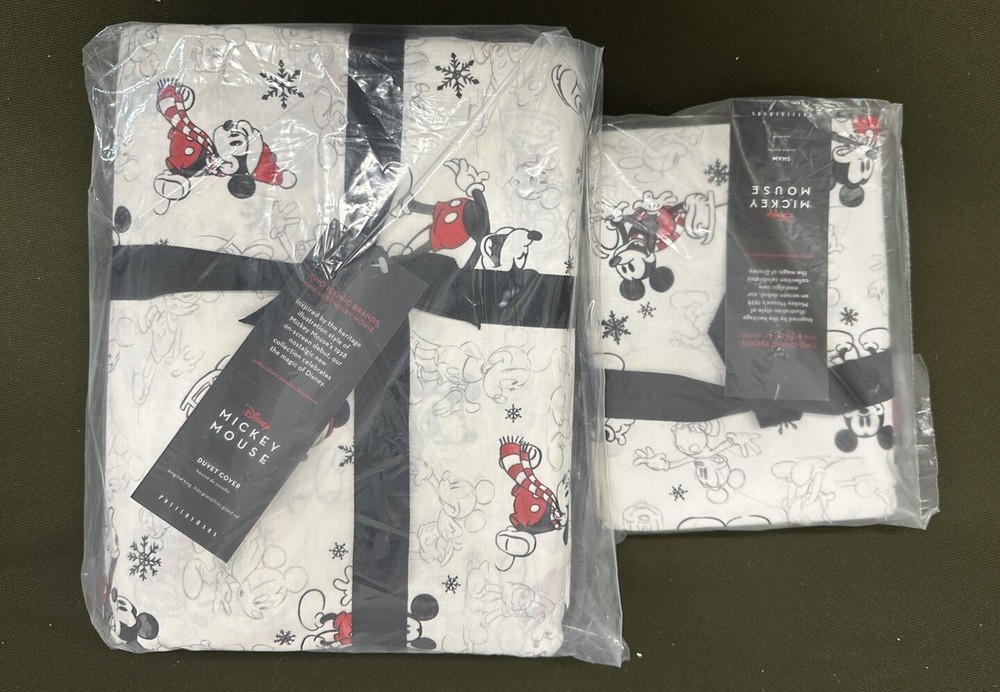 The Pottery Barn Disney Cal King Duvet Cover & 2 Standard Pillow Shams set features a Mickey Mouse pattern, perfect for adding a touch of Disney magic to your bedroom decor. The set includes a duvet cover designed for a King/Cal King size bed and two standard pillow shams in a cream color. This three-piece set is ideal for fans of Disney looking to create a cozy and stylish bedroom space with a touch of whimsy. Please see photos for details