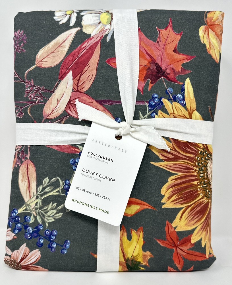 New~Pottery Barn~Laurel Fall Botanicals Reversible Duvet Cover~Full Queen & 2 Standard Shams Full/Queen: 88" l x 92" w 2 Standard Shams: 20" h x 26" w Inspired by our favorite fall botanicals, our in-house artists designed this look to bring the seasons to life in your home. Each piece reverses to a contrasting floral design that's perfect for dressing up a guest room or updating your current bed spread. Woven of 100% cotton percale. Duvet features a button closure with inner ties that keep insert in place Reverses to a coordinating pattern. Machine wash. Please read our RETURN POLICY before you purchase: We take pride in our business, and we strive to do our best. We purchase brand new items and we do our best to give accurate descriptions and photos. If you have any questions about an item, please contact us through eBay prior to your purchase. We try our best to resolve any issues as fast as possible. If there are any issues with your item, please contact us right away. All items being returned must be returned with the price tag attached or new in package. No used items can be returned. When we receive the returned item, inspect it, and it is found to be in the same condition that we shipped it in (brand new, unused and in the original packaging) your refund will be given. The buyer is responsible for paying the return shipping. Thank you! Feedback: We strive to give you the best service. If you have any issues regarding your item, please contact us right away. Customer satisfaction is our priority. See my other listings for more great items! We accept Visa, Mastercard, Discover, American Express, Apple Pay and Google Pay. We will ship to the address provided at payment. We provide fast shipping! Your item will be shipped within 2 business days via UPS or USPS priority mail. Fed Ex and UPS can NOT deliver to PO boxes, so please provide us with a physical street address. Once your item is shipped, you will receive an email with your tracking number. Free Shipping is excluded for HI, PR and AK. Please email us for shipping rates to HI, PR and AK. Additional Shipping required for HI, PR and AK. Shipping rates don't include HI, PR and AK. Please contact us for shipping prices before you purchase. Thank you. txzj pxzj5515 txzj39