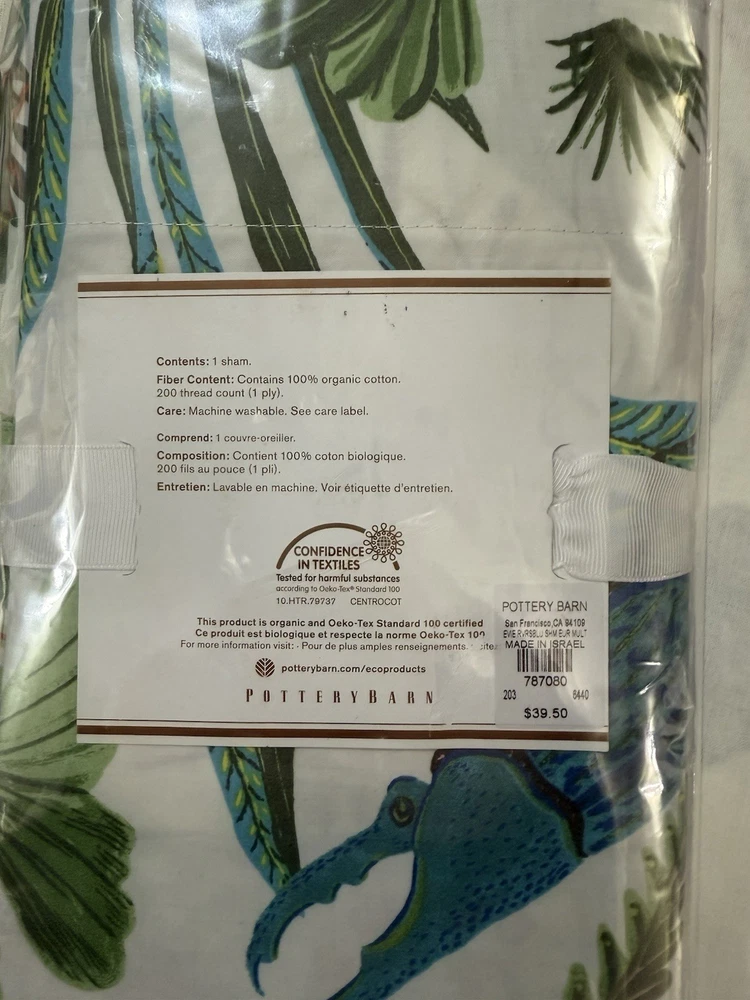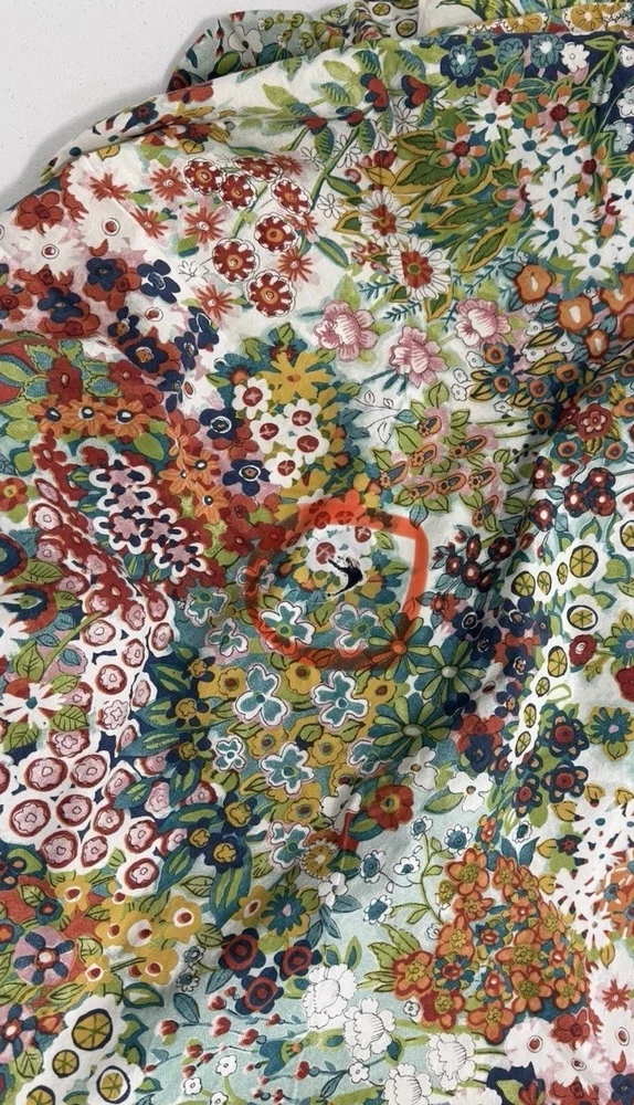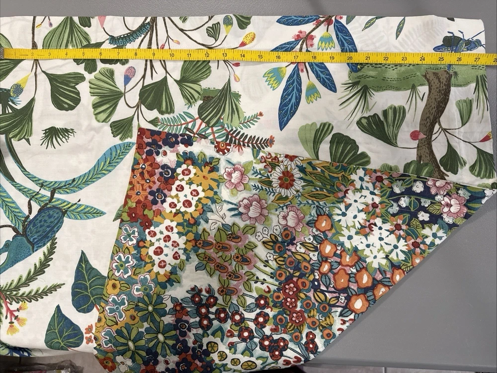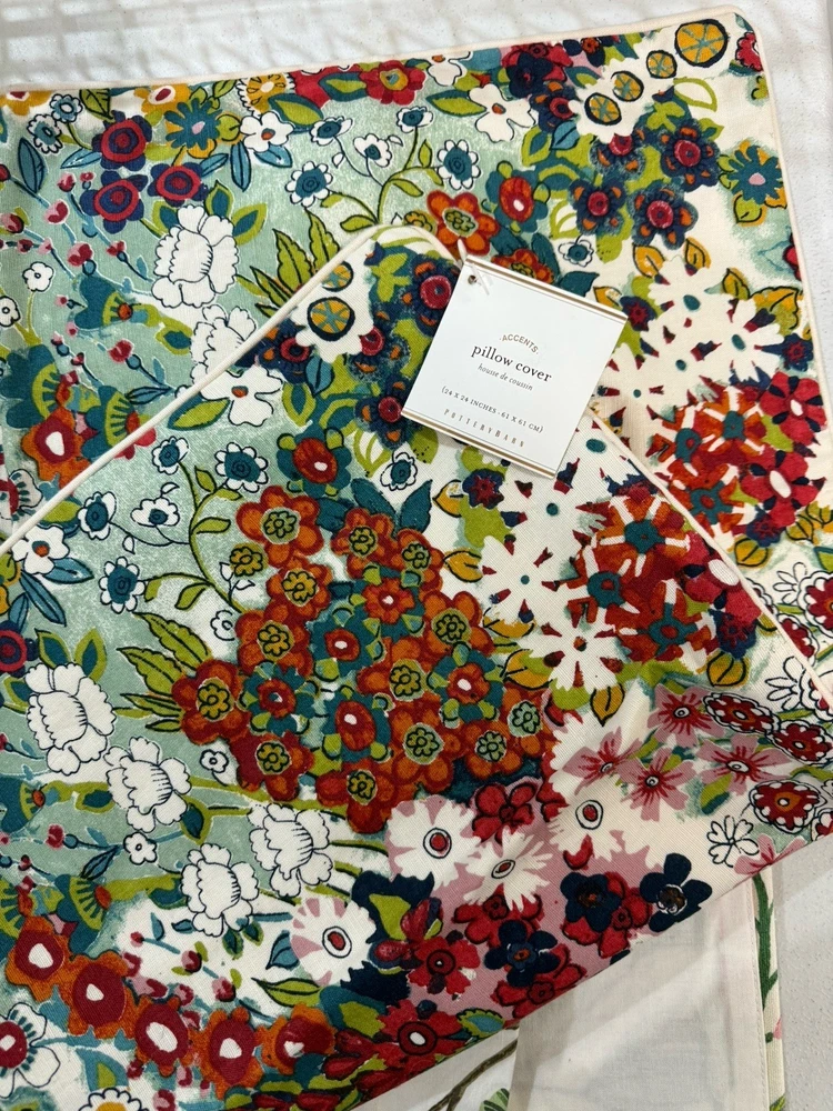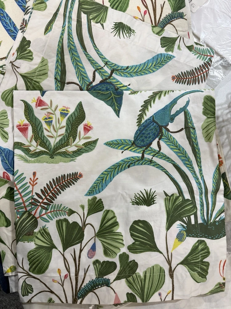 NLA and rare, King size Pottery Barn “Evie” reversible duvet cover with button closure, 3-euro shams (one is new in package) with a 26x26 pillow insert opening, 29.5” overall square, 1- decorative pillow cover (new with tags) and 1-table runner measuring 18”x108”which I used under glass on my dresser. The duvet has a small patch as you can see in the photos but is really hard to notice when it’s on the bed. My dog got a toy stuck in it and tried to bite through it. Please see all photos as I enlarged them so you can judge the size of the patch. It’s about the size a quarter. It is on the busier side of the duvet so it harder to detect.