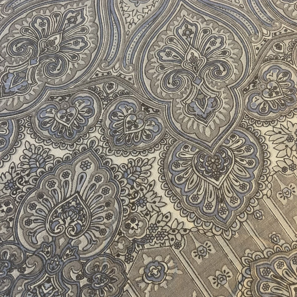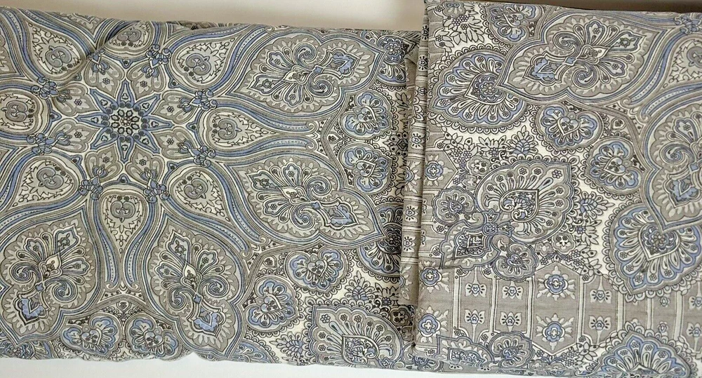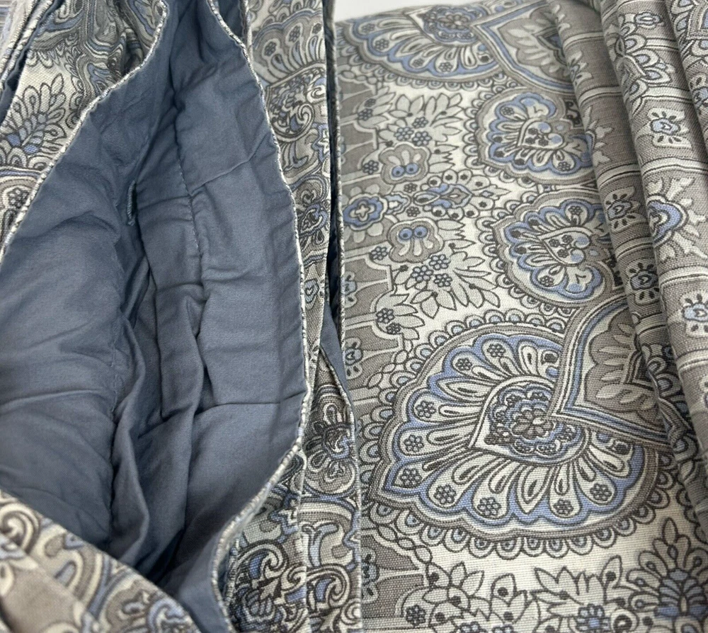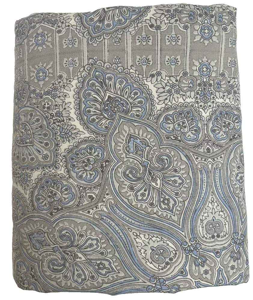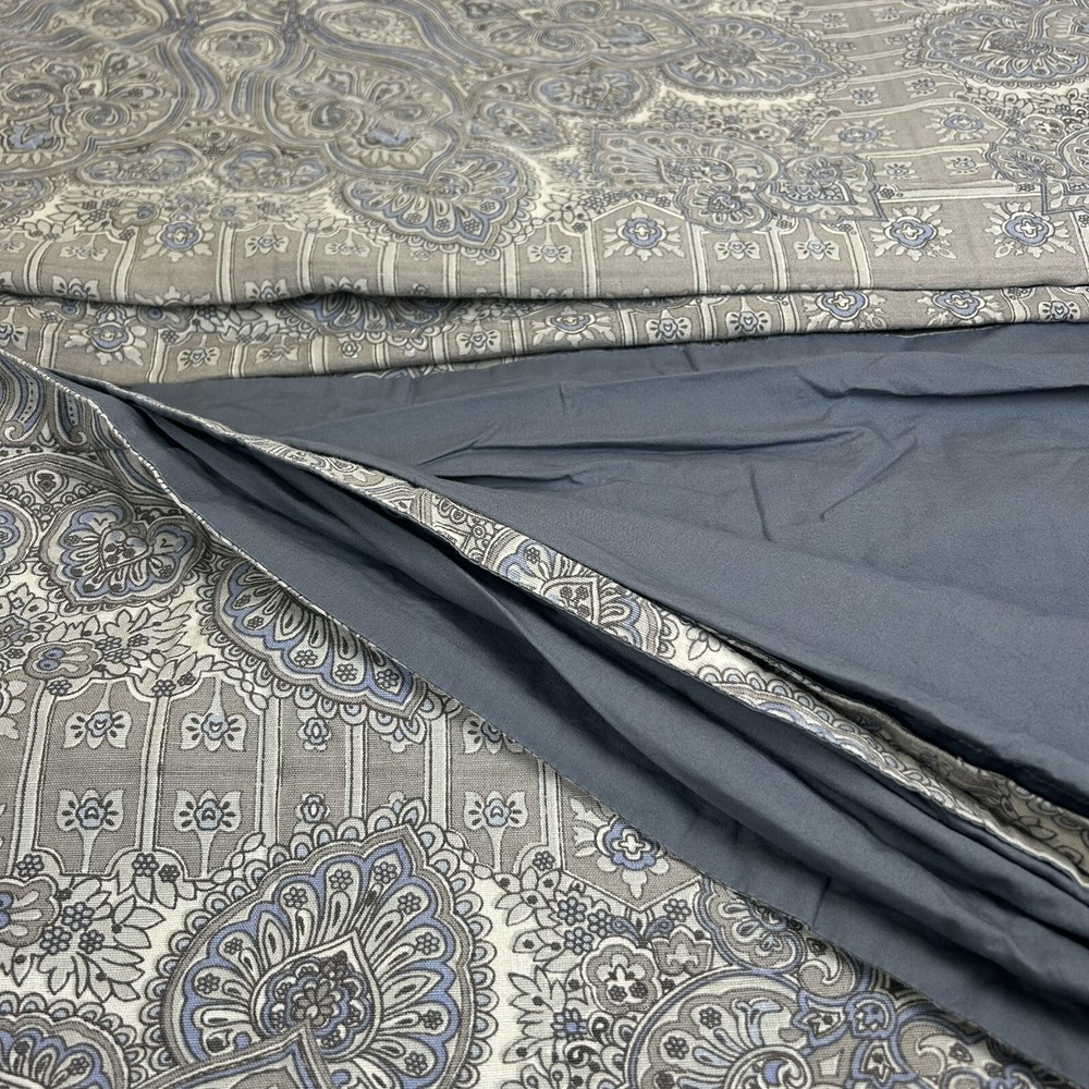 Beautiful Pottery Barn King Duvet Cover. Front is Indian print paisley in shades of grey, periwinkle and off-white Linen/cotton blend. Reverse is dusty blue solid 100% Cotton. Button Closure and interior ties to hold duvet in place. Excellent preowned condition; nonsmoking environment