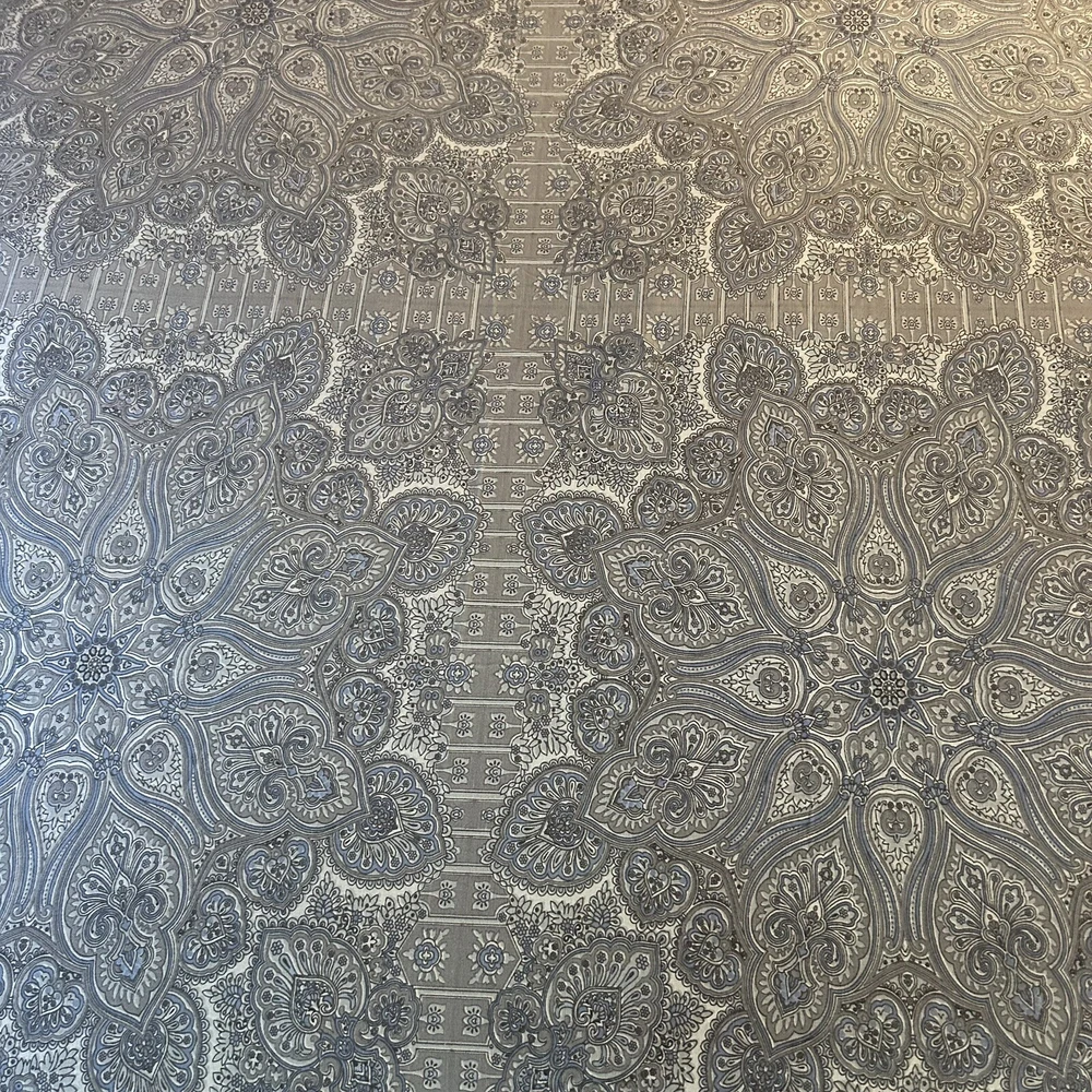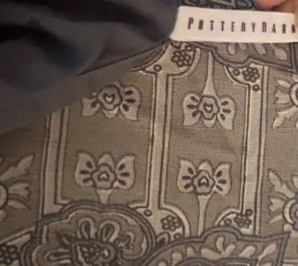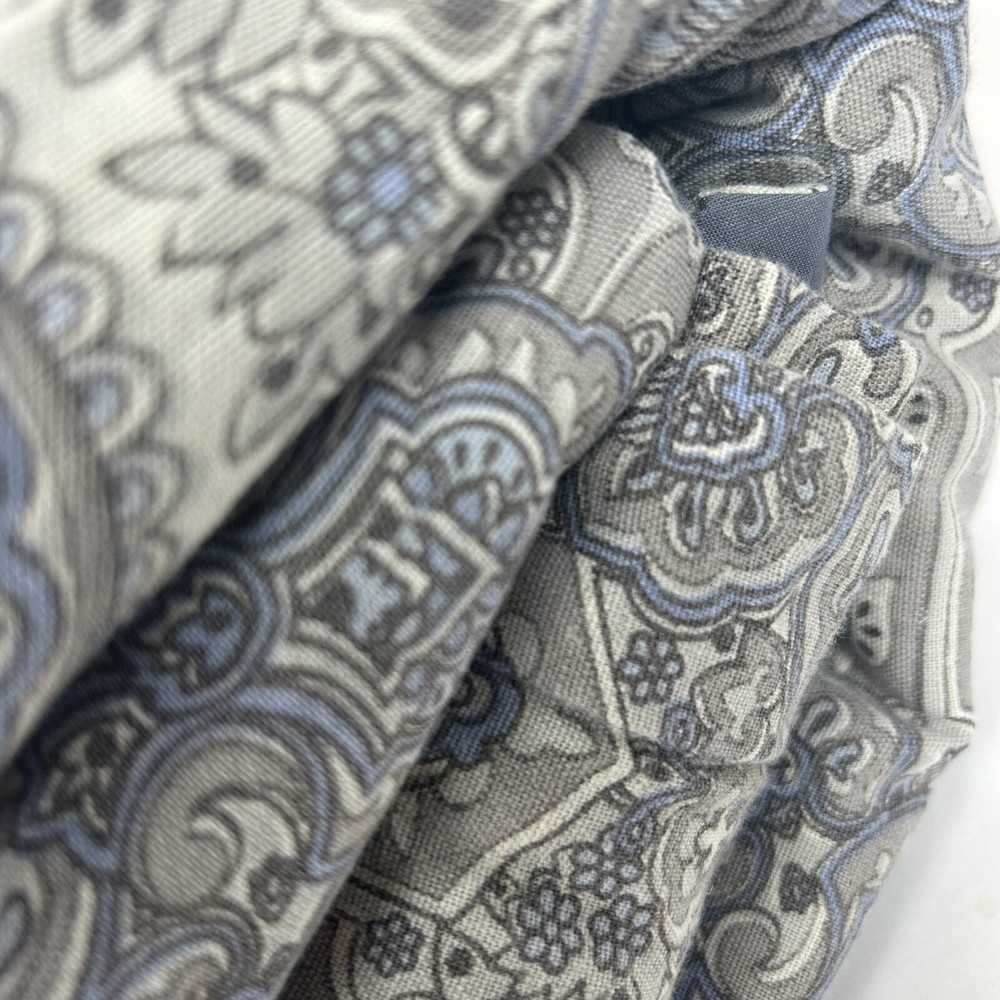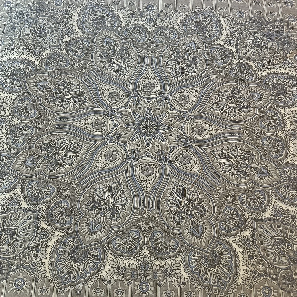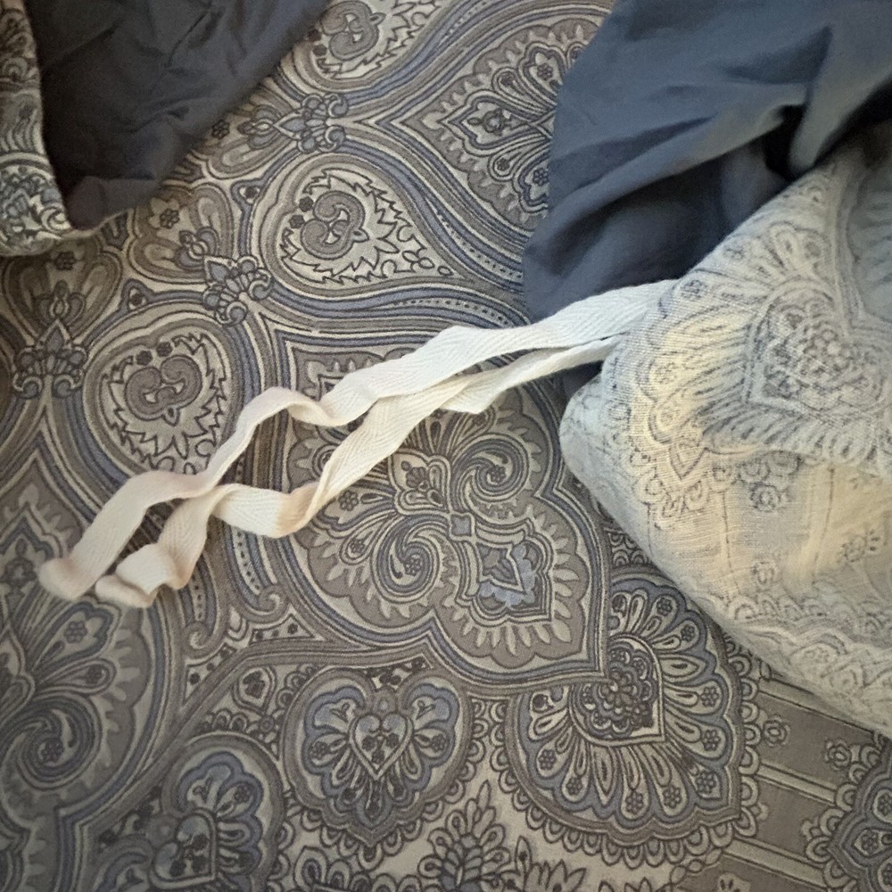 Beautiful Pottery Barn King Duvet Cover. Front is Indian print paisley in shades of grey, periwinkle and off-white Linen/cotton blend. Reverse is dusty blue solid 100% Cotton. Button Closure and interior ties to hold duvet in place. Excellent preowned condition; nonsmoking environment