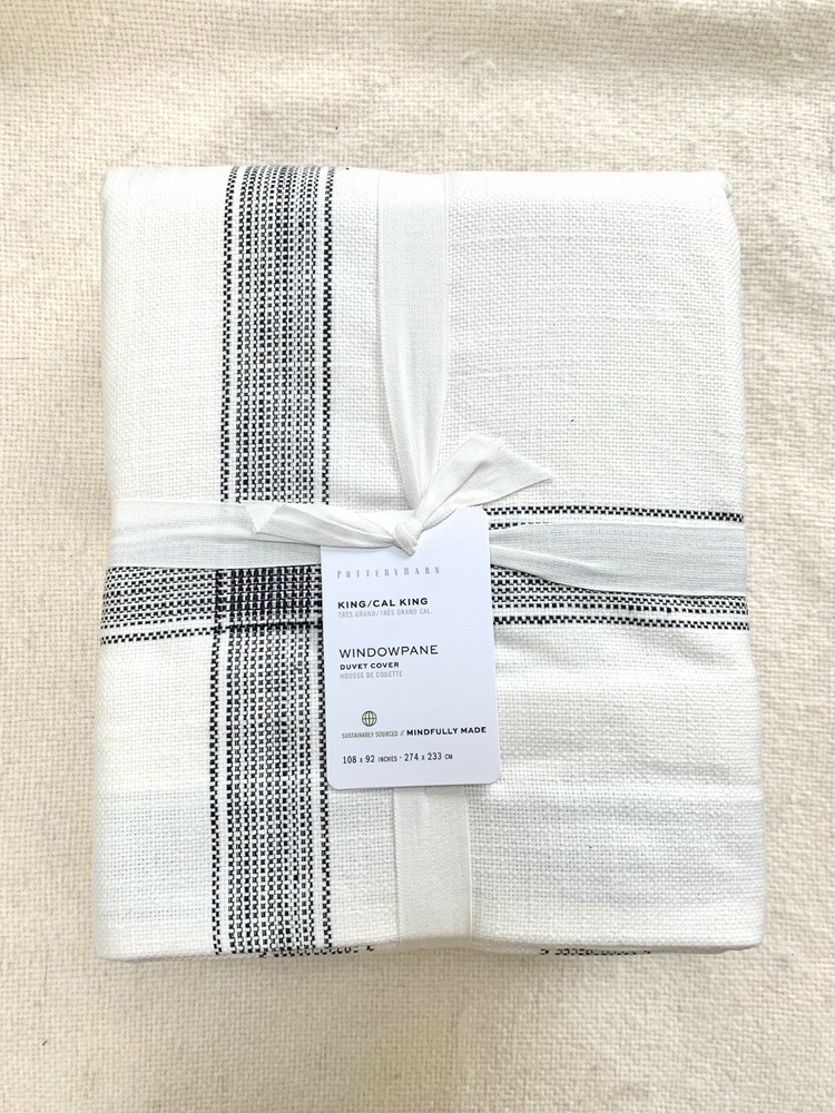 Pottery Barn Windowpane Cotton Duvet Cover only 100% cotton color: Charcoal / Snow White (see picture) size: King/Cal. King: 108" x 92" Check all the style boxes with our windowpane-patterned bedding. Its versatile tattersall design looks crisp and modern when layered atop solid-colored sheets, but also mixes easily with repetitive prints or ticking stripes for an appealing contrast of visual textures. Duvet cover reverse to solid snow white. Duvet cover has a button closure. machine wash imported New in Original Packages from a smoke free, pet friendly home!