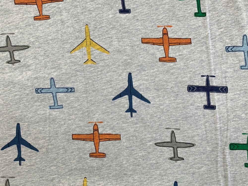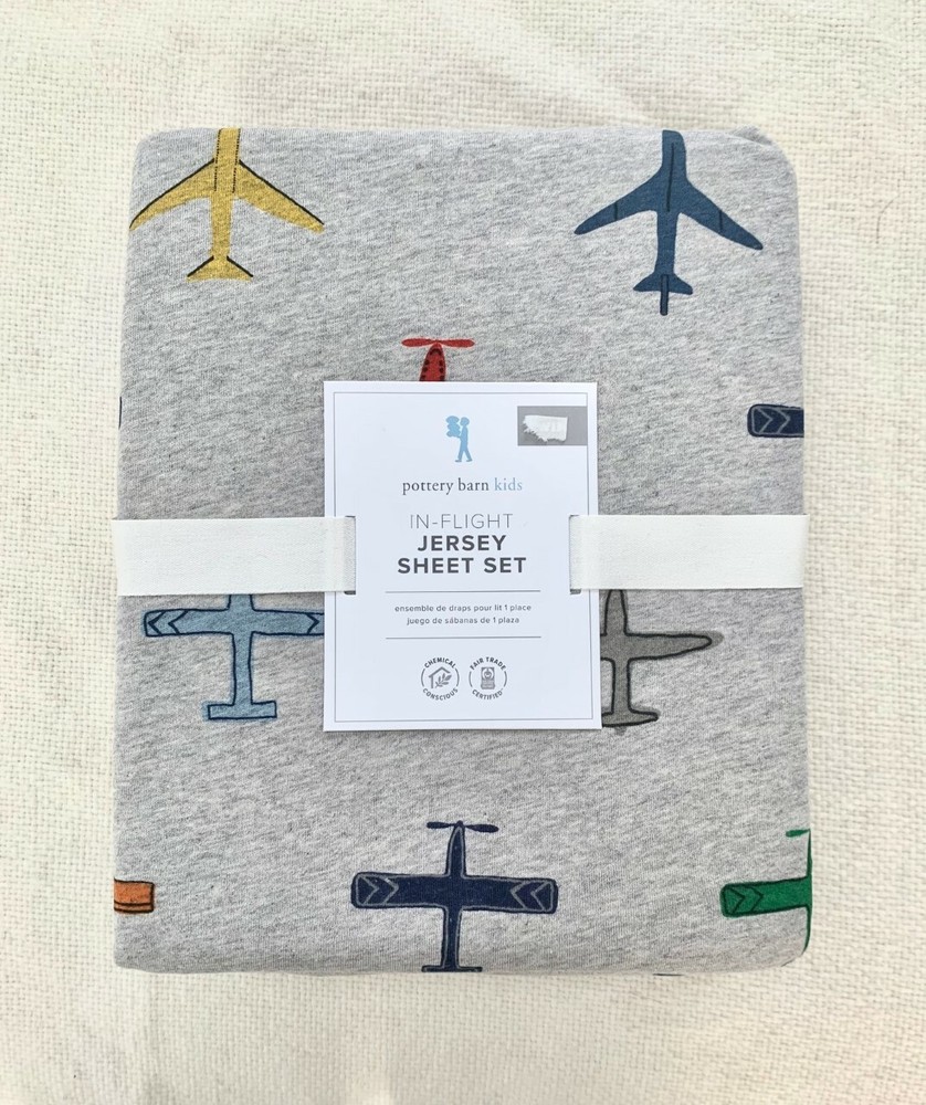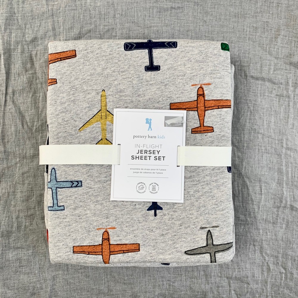 Pottery Barn Kids Jersey In Flight Sheet Set Twin Air Plane Grey Blue (twin PBK# 5510194) size: twin color: blue, orange, yellow, grey, green ..., see pictures! 100% Jersey Knit cotton , feels so soft! Fitted Sheet: 39 x 75"; fits mattresses up to 12" deep Flat Sheet: 66 x 96" One Standard Pillowcase (1): 20 x 30" Decorate your little pilot’s sleep space in our colorful Jersey In-Flight Sheet Set. Planes of all shapes and sizes adorn this super soft jersey knit bedding. Plus, it’s GOTS Certified to be both safe and free from harmful chemicals for a healthier night’s sleep. Made of 100% jersey knit cotton; 200-thread count. Jersey knit fabrics promote natural air flow, making sleep more comfortable. Percale weave cotton is the benchmark for comfortable and breathable bedding. It is easy to care for and gives the fabric a soft matte finish. Fitted sheet has universal elastic (elastic around the entire edge) for a snug, secure fit. Pillowcases have inside flap to keep pillows from slipping. Certified to GOTS (Global Organic Textile Standard): This product meets the gold standard of textile production – it exceeds organic fiber requirements, contains no restricted chemicals and meets strict social responsibility standards. Made in a Fair Trade Certified™ facility. Machine wash. Imported. New in Original Packages from a smoke free, pet friendly home!