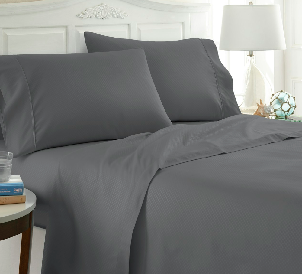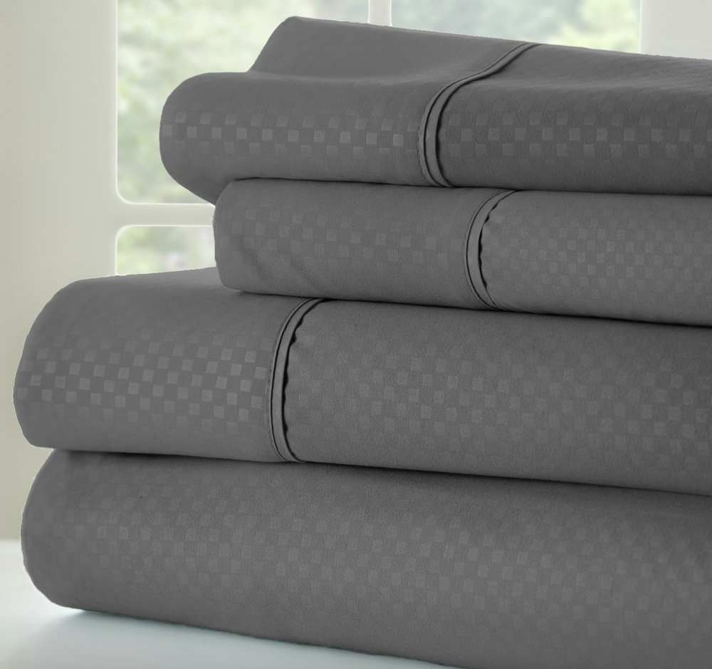Luxury Linens Premium Checkered Embossed 4 Piece Bed Sheet Set - Queen - Gray Treat yourself to a fresh new set of sheets with this embossed 4 piece sheet set. Our premium set is twice as durable as cotton, wrinkle resistant and an ideal choice for those with sensitive skin or allergies. Featuring a subtle embossed checkered design, each piece is double brushed for an ultra-soft and cozy feel, making it the perfect new addition to your room! Features Made from 100 percent imported 95 GSM Microfiber 4 piece set includes: 1 flat sheet, 1 fitted sheet, and 2 pillowcases 16 in. deep pocket fitted sheets, perfect for oversized mattresses Easy Care: Machine wash cold, tumble dry low, fade resistant, wrinkle resistant, no ironing necessary; do not bleach, or use fabric softener Superior weave for durability and a breathable soft touch Perfect option for those with allergies or sensitive skin Suitable for a wide range of styles such as, coastal, beach house, modern farmhouse, children's room, farmhouse, country, shabby chic, boho chic, boho, eclectic, mid century modern, traditional, modern, industrial, Scandinavian and transitional What's Included 1 Fitted Sheet: 60" W x 80" L + 14" 1 Flat Sheet: 90" W x 102" L 2 Standard Pillowcases: 20" W x 30" L