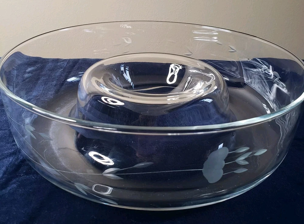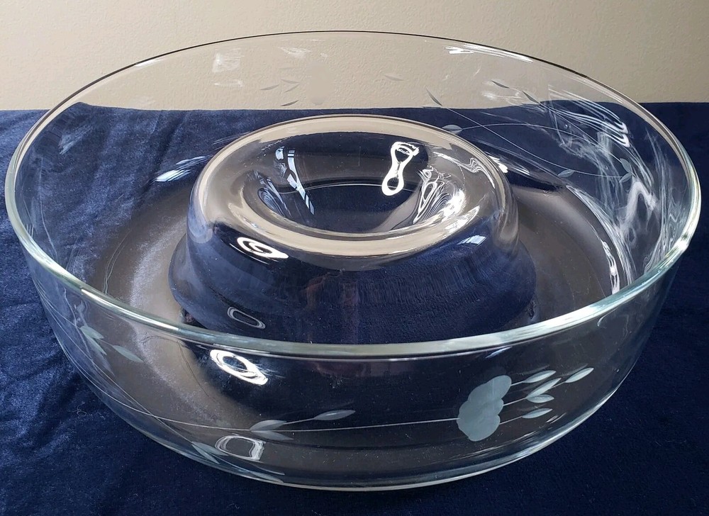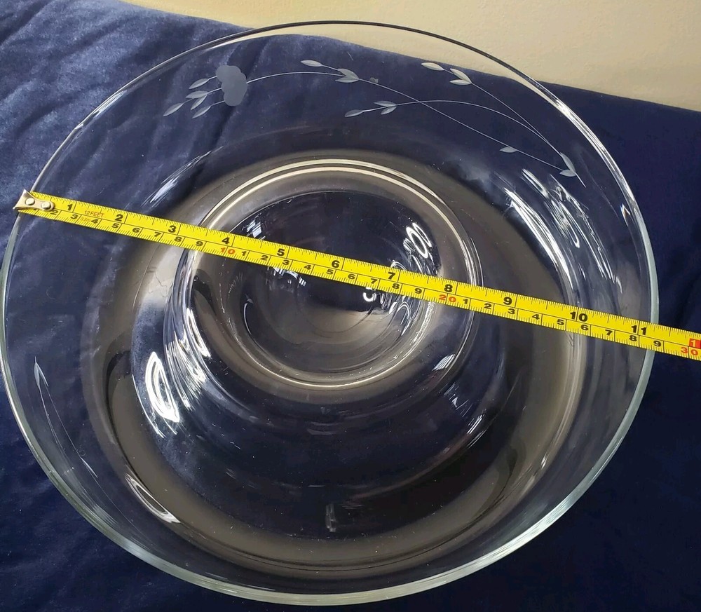 Princess House Heritage Etched Crystal Chip and Dip Large Server. Previously used with minor visible sign of wear, no cracks or chips, Measures 11 1/4" D × 3 1/4" Thank you...