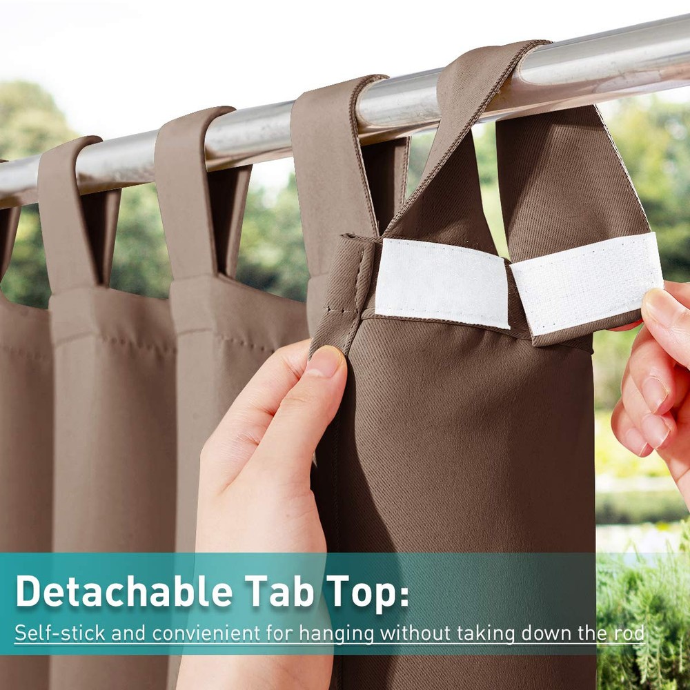 PRODUCT INFO: Sold by 1-panel outdoor waterproof curtain. The detachable loops can slide directly over a drapery rod under 1.9" diameter. Both sides of the curtain is the same fabric and color. SUPER MATERIAL: Outdoor curtains adopts triple weave technology with waterproof effect, which thick enough for windbreak and has a good performance on sunblock, as well as to be a shower curtain. DETACHABLE TAB TOP: adopts self-stick tab top to make it detachable so that you needn't take down the rods while hanging these outdoor curtains and you won't bother on grommet rust. GOOD PERFORMANCE: sticky tab top outdoor curtain will fit both indoor and outdoor living which will be a safe and privacy divider of public such as porch, balcony, patio, cabana or garden. EASY CARE: Good Quality to withstand years usage. Machine washable with water temperature below 86F. Mild detergent no bleaching. Low-temperature ironing. 30 days money-back on return policy.