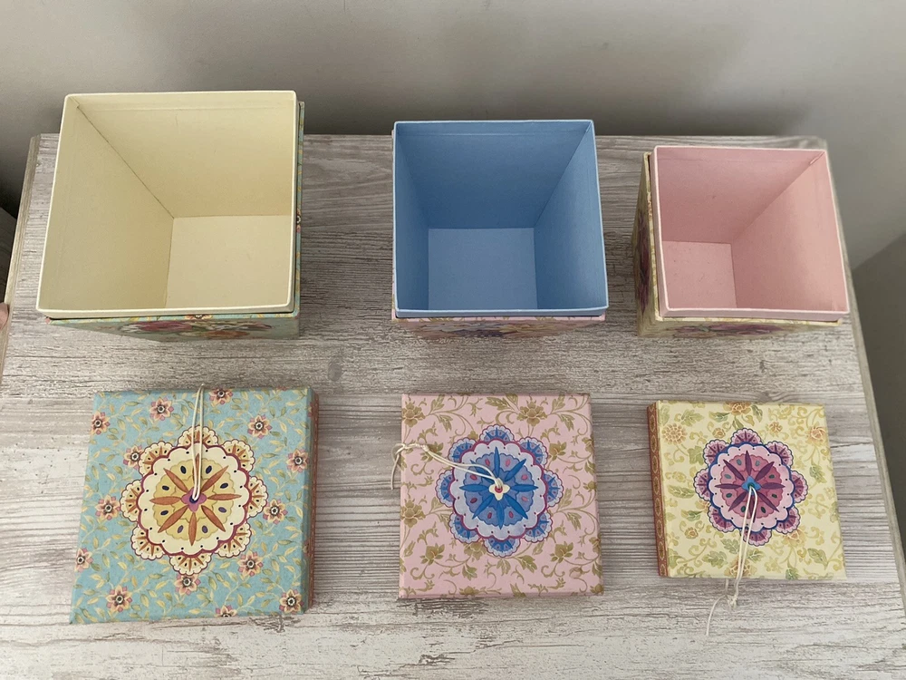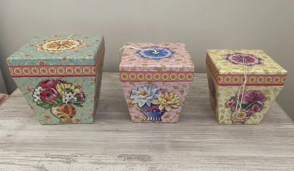 Punch Studio Flowers Theme Embellished Trinket Nesting Stacking Boxes Set of 3 1-st box size 5.5'' x 5.5'' x 5.5'' 2-nd box size 5'' x 5'' x 5'' 3-nd box size 4.5'' x 4.5'' x 4.5''...