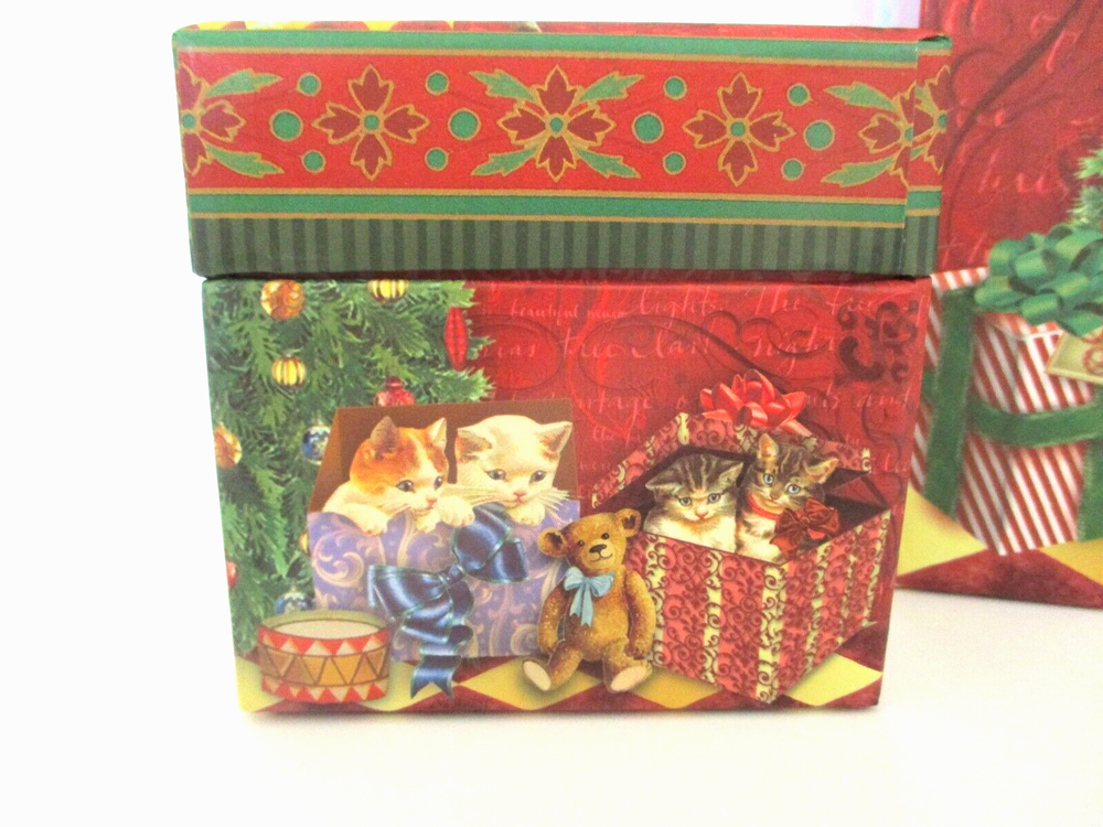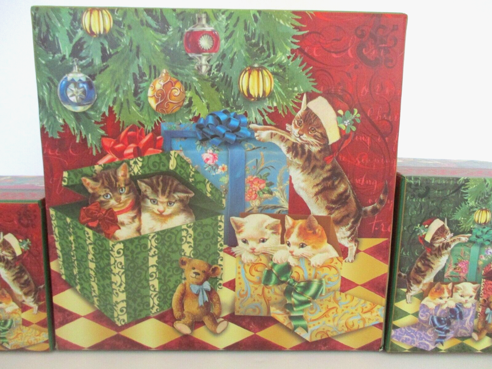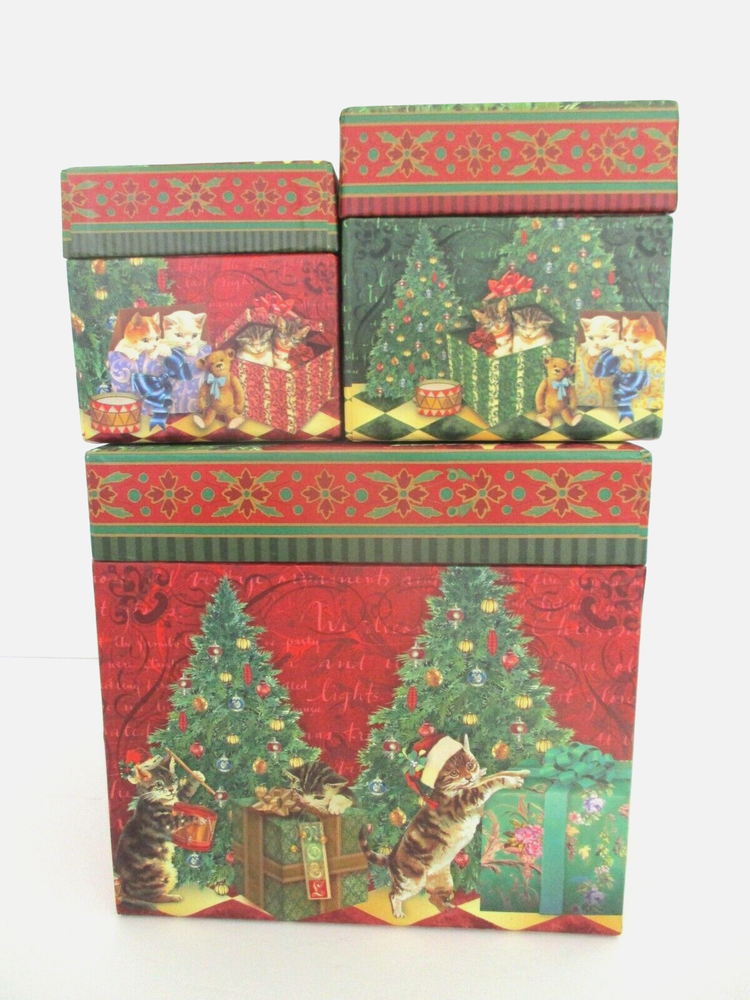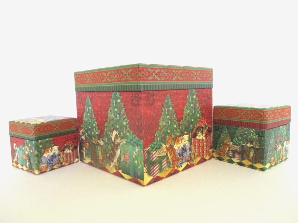 This Punch Studio Set of 3 Kitty Cat Holiday Nesting Boxes is a charming addition to your home decor. The boxes are made of decorative covered paperboard and come in a square shape. The set includes three small boxes with varying sizes, perfect for storing small items or as a decorative piece on its own. The boxes feature a delightful cat design and a removable lid for easy access to the contents inside. Add a touch of cuteness to your home decor with these Punch Studio Kitty Cat Holiday Nesting Boxes.