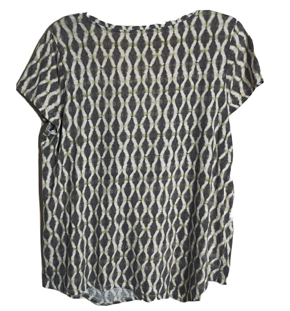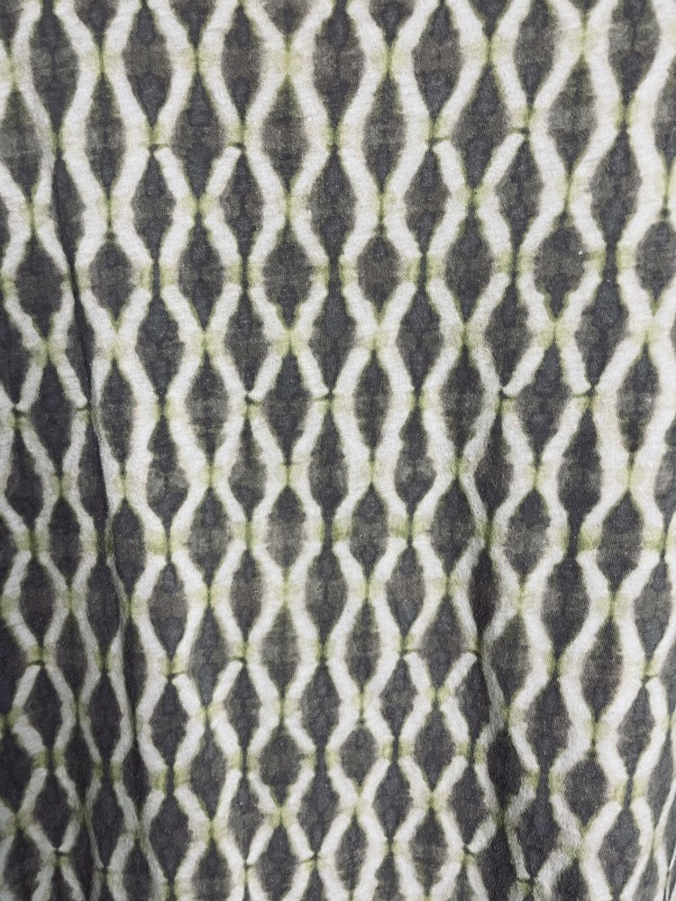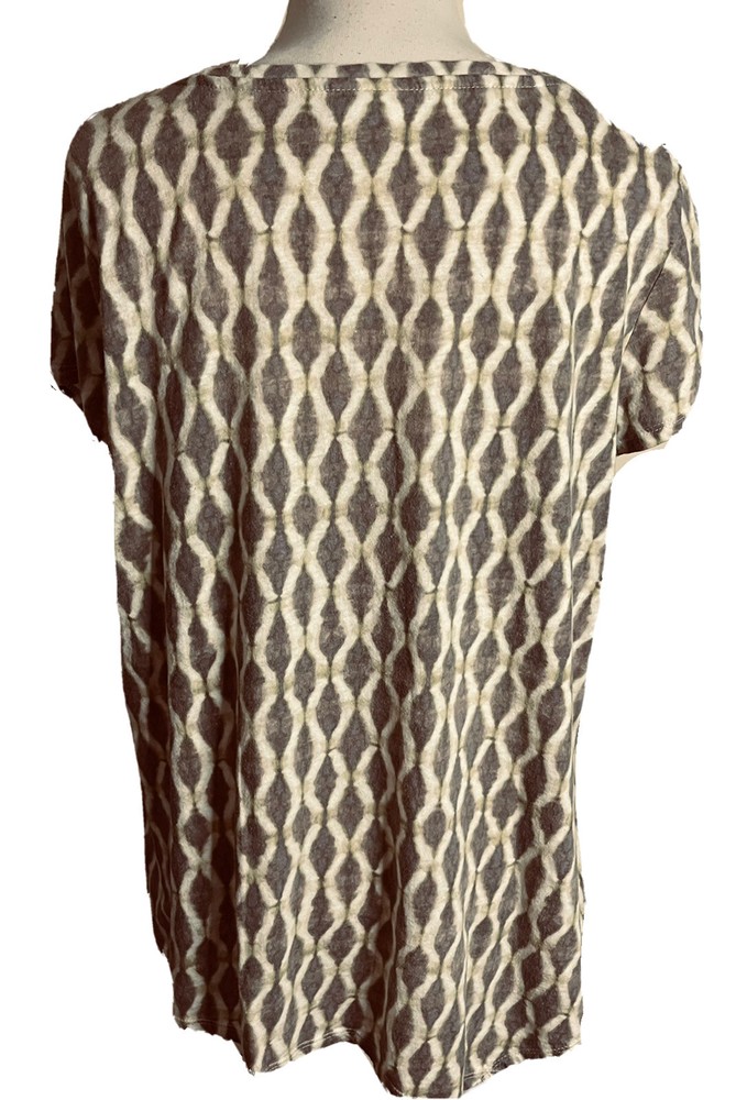 Absolutely love this top! The ikat print in earthy brown and green is gorgeous, and the dipped hemline adds a stylish touch. The relaxed fit is super comfy, perfect for layering or wearing on its own. The cap sleeves keep it breezy, and the length is just right. Great condition—looks almost new! Highly recommend for a boho-chic vibe.