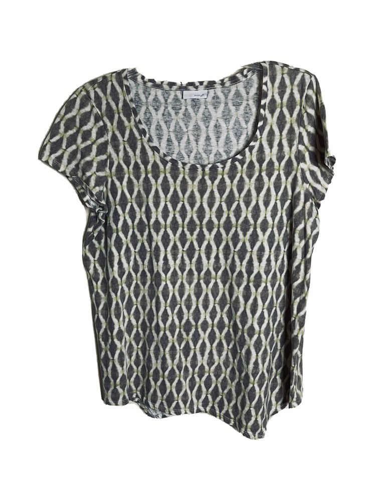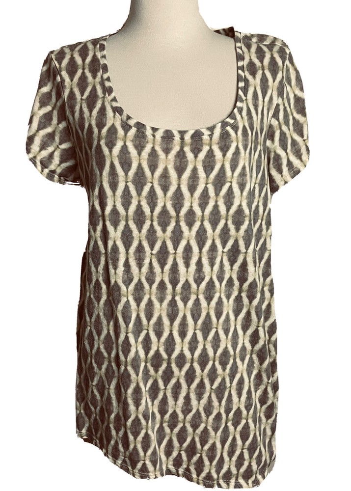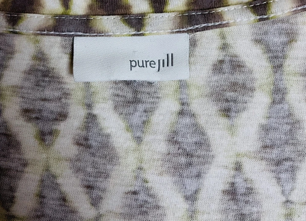 Pure Jill Womens Top Tee multi Color ( colors of Brown and Green) Ikat Relaxed fit Lagenlook Cap Sleeve Dipped Hemline! Size Large (Tag Removed) Please go by measurements Hand measurements Length 26" Pit to Pit 21" (42") Sleeve 6" Preowned very good condition. Ships inside sealed protective bag
