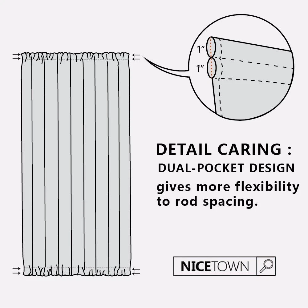 We all love French door curtains for the way they make our doors elegant and welcoming. With BLACKOUT FRENCH DOOR PANELS , there is more to it. FIT NICELY: Single panel per package. Order 2 if you have double doors. Dual-pockets design on each end allows you to adjust the size slightly upon your window needs. PERFORMANCE: Curtains adopt triple weave technology. Unlike other curtains where the middle layer is black, the middle layer in this curtain is white yarn. So you don't have to worry that white has impurity. Both sides are the same color. These curtains are not blackout. They only can block out 50% sunlight while still providing privacy. These ecurtains can complement any decor. OUR BRAND Invite products into your home for their form and function, and experience their style, craftsmanship, and value. We travel the world to find the best materials and designs for our products and use the most sensible manufacturing methods. We thoroughly test each item and rely on feedback from our customers to help us deliver the highest quality. With a selection that continues to grow, the brand is set to become a game-changer in your shopping cart and part of your lifestyle. NOTE : Due to different screen displays, the color of the actual item may vary slightly from the above images. Product Info.: The door curtain package comes with 1 panel. Each panel measuring 25 inches wide by 40 inches long comes with matching adjustable TIEBACK. 2 rod pockets (diameter: 1" each) on both top and bottom sides give the curtain a nice fit. Nice Function: These french door curtains are made of triple weave blackout material, which can block 85%-95% of harmful lights and UV rays out. By a special weaving way, the curtain prevents hot air in summer and cold wind in winter from entering the room. Stylish & Privacy: Designed for sidelight glass / glazed doors. Pure color is suitable for most home decoration styles. Adjustable tie backs can flexibly control the light enter into the room, you can tie up for decorating room or full shade for keeping privacy. Hassle-Free: All the door panels are thread trimmed and pre-ironed. You can easily install them right out of the package with your sash rods. Double - rod pockets at both ends provide a variety of options for hanging your door curtain. Easy Care: blackout curtains are made to last. Machine washable in normal temperature water, use mild detergent, no bleaching, tumble or natural dry. Steam ironing can easily remove wrinkles or any fold marks.