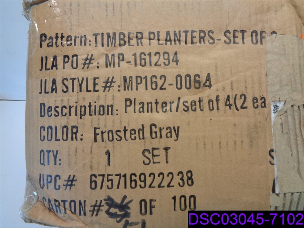 This item is:__Qty = 1 set of 2: Madison Park Frosted Gray Stone Planter Model MP162-0064__________________________________________________________________ This item is new, however, The original packaging may be missing or imperfect. See photos. Includes only what is shown in the picture. Warehouse Location:___Warehouse #1_Shelf_2261_________________________________ Sales tax will be added to items shipping to locations in Kansas. _____________________________________________________________________ _____________________________________________________________________ _____________________________________________________________________ By bidding and or purchasing this item(s) you (the buyer) agree to the following terms and conditions: 1. An “item†is defined as the following: The unit or units purchased in the ebay listing, (it could be a single unit, multiple units, a mixture of units, a variety of units, the incorrect unit or any combination of units not mentioned). It also includes the packaging, or lack thereof, the shipping label, and any contents place in the package by error. 2. The “Seller†is defined as seller and/or consigner. 3. The “buyer†is defined as the entity that purchased the item from seller and/or consigner. 4. If the buyer does not agree to these terms and conditions then do not purchase from us. 5. All items are sold “AS IS†No warranty or liability is expressed or implied. 6. The buyer agrees that: All items are shipped without insurance. It is the responsibility of the buyer to let us know if they want insurance on the item. Insurance cost is $2.00 for every $50 insured, in $50 increments. The buyer agrees that if no insurance is purchased and the item is not received or received damaged that no claim shall be brought against the seller. 7. We only ship to PayPal confirmed street addresses, no exceptions. No PO Boxes, APO, FPO or similar addresses. 8. The buer agrees that the sale is considered complete once the carrier has picked up the item from the seller. 9. The buyer agrees that if there is a dispute that arises that the dispute will be settled in the State of Kansas under the laws of Kansas. 10. The buyer agrees that the item fits the buyers purpose prior to bidding. 11. The buyer agrees to indemnify and hold harmless the seller from any and all claims arising out of any conditions or defects for the item or items that they purchased 12. We only ship to the continental United States. The shipping price quoted is for the continental United States Only. All other locations will be charged extra. Out of county buyers agree to pay any additional charges that we ask them to pay including but not limited to import duties, shipping costs, packaging costs, time costs, and other costs. If the item is shipped via ebay global shipping program these terms and conditions still apply. 13. Claims made against the carrier for non-delivery, lost in transit or any other reason shall be made solely by the buyer without aid from the Seller. 14. In the event that any clauses or phrases contained here within are ruled out by a judge, the law, a lawyer, jurors, and or any other entity all others remain in effect. 15. If any claim is brought against the Seller the buyer agrees to pay for any and all costs including legal fees, travel, time, accommodations, and other costs. Late payment will result in the seller charging interest at the maximum legal rate. 16. In any event or circumstance the maximum liability to the Seller is the purchase price plus cost of shipping plus sales tax if applicable. This amount is not subject to inflation, interest, inconvenience fee or any other price adjustment. 17. The buyer agrees there will be no refunds for any reason outside of Ebay’s return policy. 18. The buyer understands that our items are wholesale, overstock, unclaimed, foreclosure purchase or salvage goods. Most boxes have been opened for inspection and photos. If items are listed as new they may not come with original packaging. 19. The buyer agrees that they are trained, licensed, qualified, and understand how to properly use, dispose of and handle the product in accordance with law and regulations. 20. The buyer agrees that if any part of these terms and conditions is determined to be void that it does not void or alleviate the enforcement of the remainder of this contract.