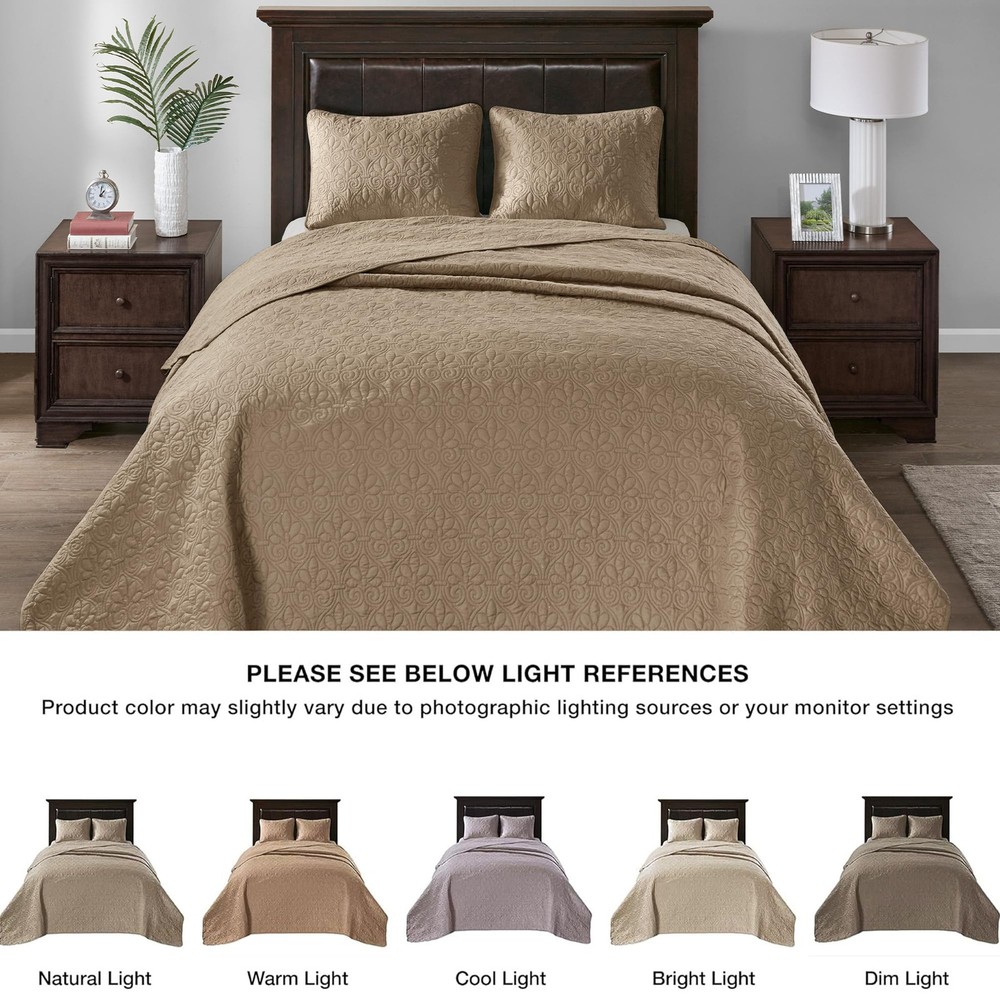 The Quebec Reversible Bedspread Set offers a charming cottage-inspired update to your bedroom. The reversible bedspread and shams (1 in Twin/TwinXL) flaunt a classic stitch pattern that creates a rich depth and texture on the face of the bedding set. Prewashed cotton filling provides added comfort and durability, while the oversized dimensions allow the bedspread to drape better. Quebec Reversible Bedspread Set is the perfect classic update to your bedroom décor. Bedspread dimension is oversized to drape better on high depth mattress The classic stitch pattern pairs easily with your existing decor and will sure to add a new decorative element to your bedroom Naturally lightweight fabric perfect for summer use or layer it on for cold weather Set includes: 1 Bedspread: 120"W x 118"L, 2 King Shams: 20"W x 36"L Care instructions: machine washable