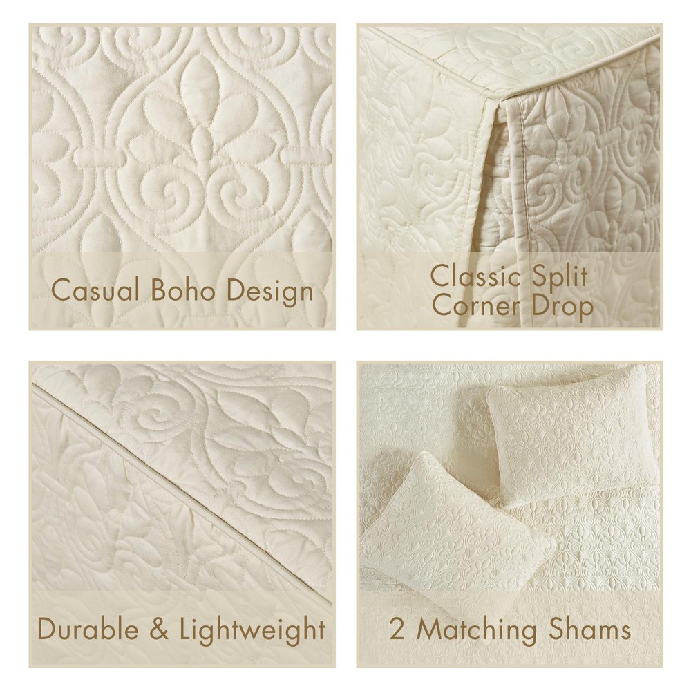 The Quebec 3 Piece Split Corner Pleated Quilted Bedspread offers a chic classic update to your bedroom décor. Solid rich color of sophisticated double sided quilting bohemian pattern complements the lightweight design and luxurious bedding feel. The quilted styling showcase classic French design of quilted box sewing with 24 inch drop on the sides with split corners accents Set includes: 1 Bedspread:60"W x 80"L + 24"D, 2 Standard Shams:20"W x 26"L Care Instructions: Machine washable