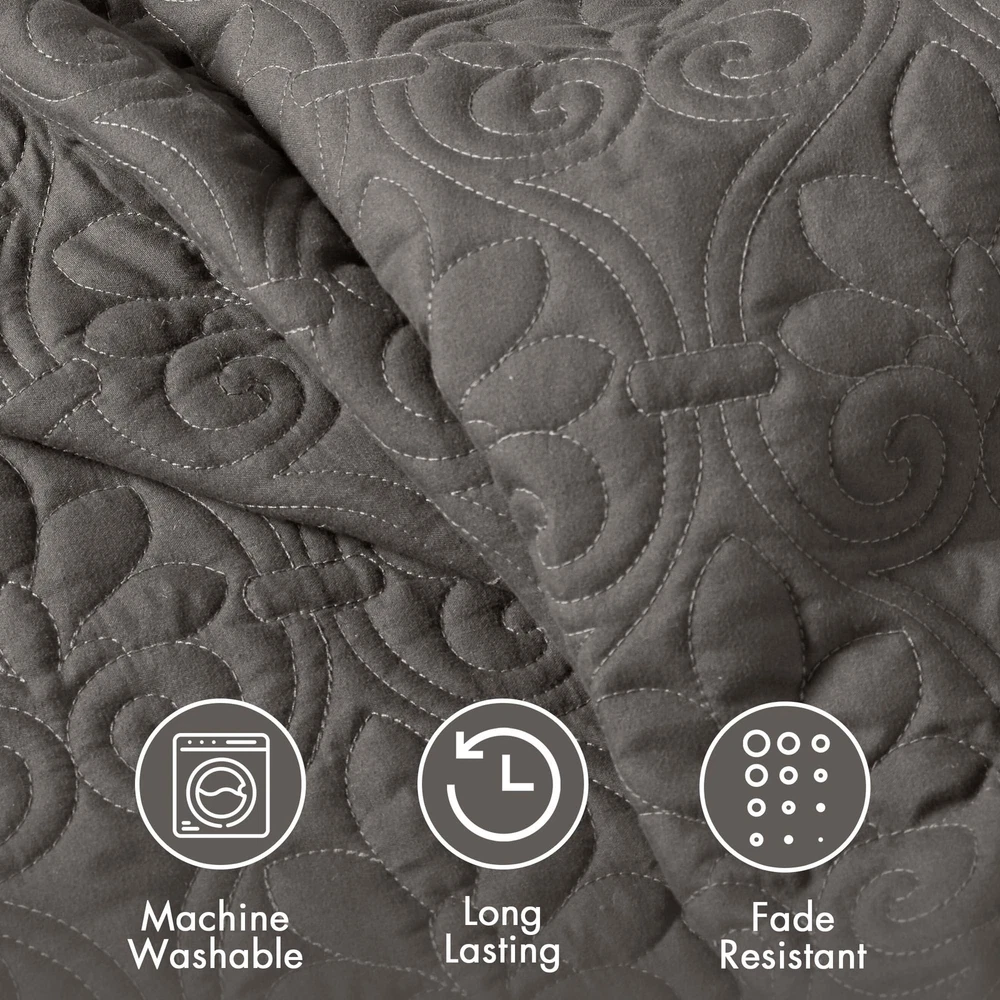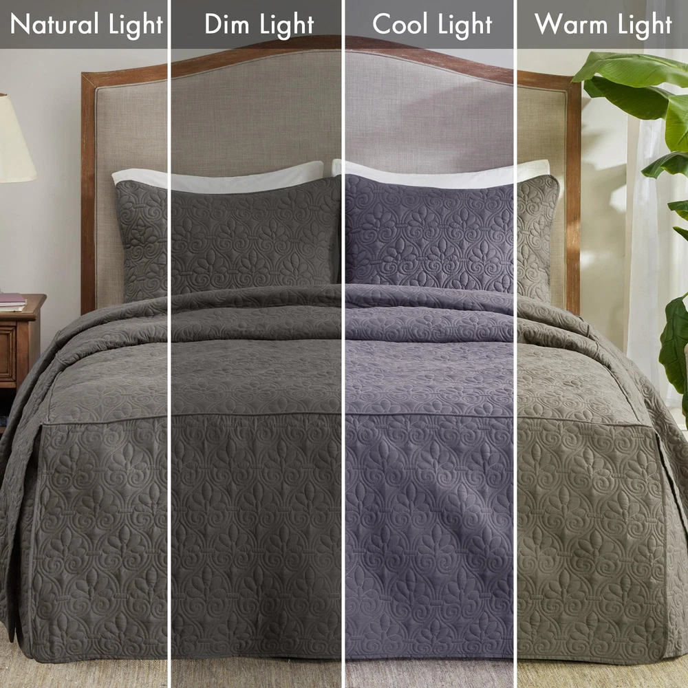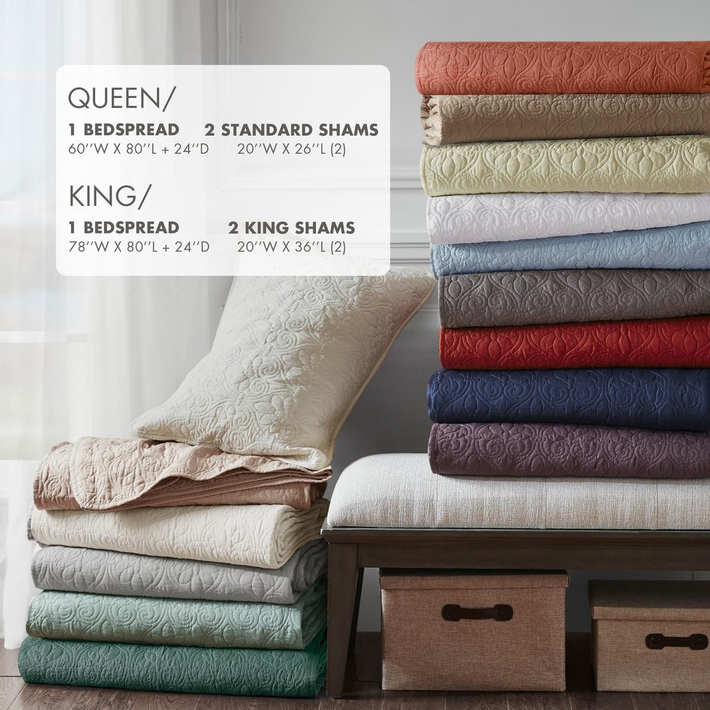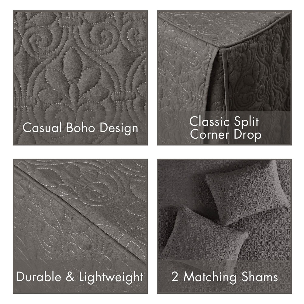 The Quebec 3 Piece Split Corner Pleated Quilted Bedspread offers a chic classic update to your bedroom décor. Solid rich color of sophisticated double sided quilting bohemian pattern complements the lightweight design and luxurious bedding feel. The quilted styling showcase classic French design of quilted box sewing with 24 inch drop on the sides with split corners accents Set includes: 1 Bedspread:78"W x 80"L + 24"D, 2 King Shams:20"W x 36"L Care Instructions: Machine washable