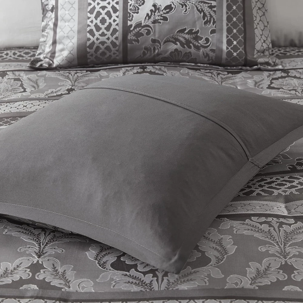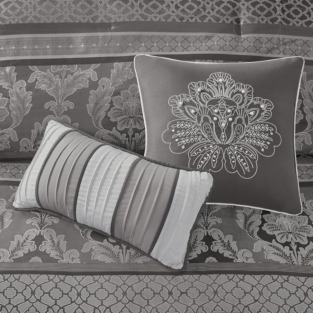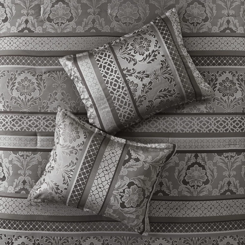 Polyester Imported polyester jacquard woven stripe motif 15"drop bedskirt embroidered dec pillows polyester jacquard, 8oz/sq yard polyester filling, microfiber bedskirt, embroidered decorative pillows ; 1 Comforter:90"W x 90"L 2 Standard Shams:20"W x 26"L + 1"D (2) 1 Bedskirt:60"W x 80"L + 15"D 3 Decorative Pillows:16"W x 16"L/12"W x 18"L/10"W x 18"L machine washable, spot clean pillows To add a touch of richness to your current ,the Madison Park Bellagio 7 Piece Comforter Set offers a luxurious update to your room. Made from polyester jacquard, the comforter and shams share leaf, striping and ironwork motifs that are accentuated by elegant stitching. Pops of silver are also used throughout this collection adding a lavish feeling to your decor. Three decorative pillows feature pleating and embroidery details that correspond back to the comforter, while a rich bed skirt helps bring the entire look together.