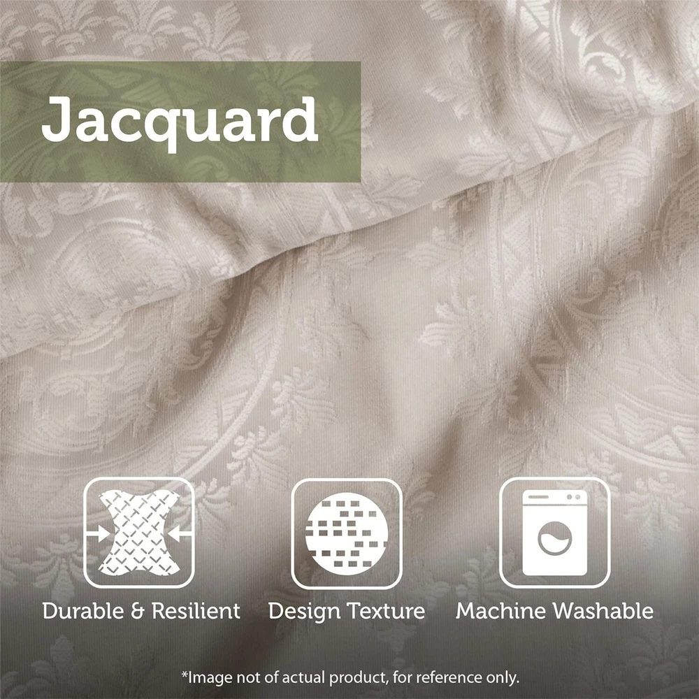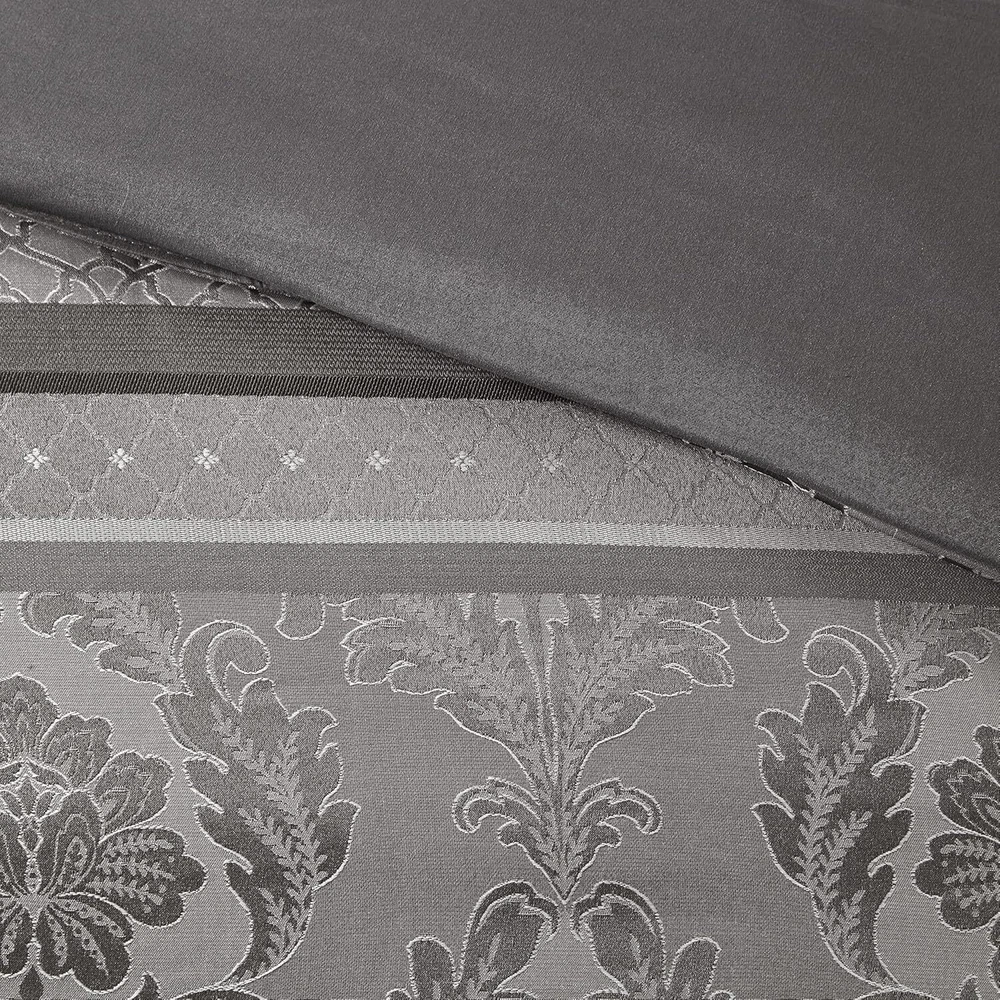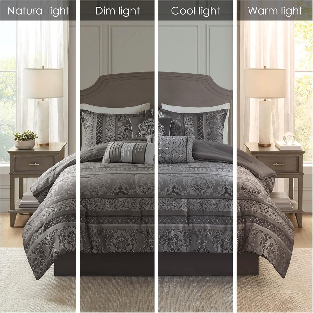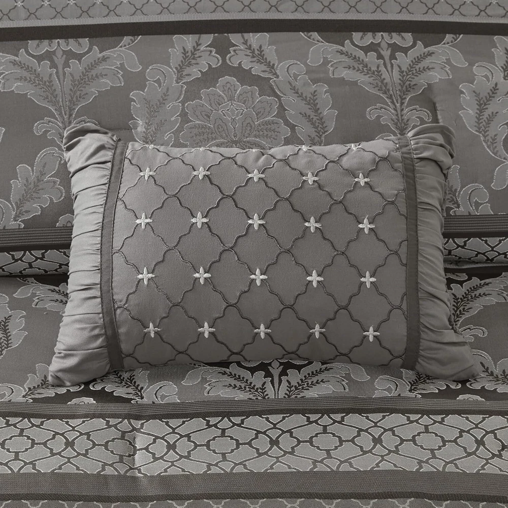 Polyester Imported polyester jacquard woven stripe motif 15"drop bedskirt embroidered dec pillows polyester jacquard, 8oz/sq yard polyester filling, microfiber bedskirt, embroidered decorative pillows ; 1 Comforter:90"W x 90"L 2 Standard Shams:20"W x 26"L + 1"D (2) 1 Bedskirt:60"W x 80"L + 15"D 3 Decorative Pillows:16"W x 16"L/12"W x 18"L/10"W x 18"L machine washable, spot clean pillows To add a touch of richness to your current ,the Madison Park Bellagio 7 Piece Comforter Set offers a luxurious update to your room. Made from polyester jacquard, the comforter and shams share leaf, striping and ironwork motifs that are accentuated by elegant stitching. Pops of silver are also used throughout this collection adding a lavish feeling to your decor. Three decorative pillows feature pleating and embroidery details that correspond back to the comforter, while a rich bed skirt helps bring the entire look together.