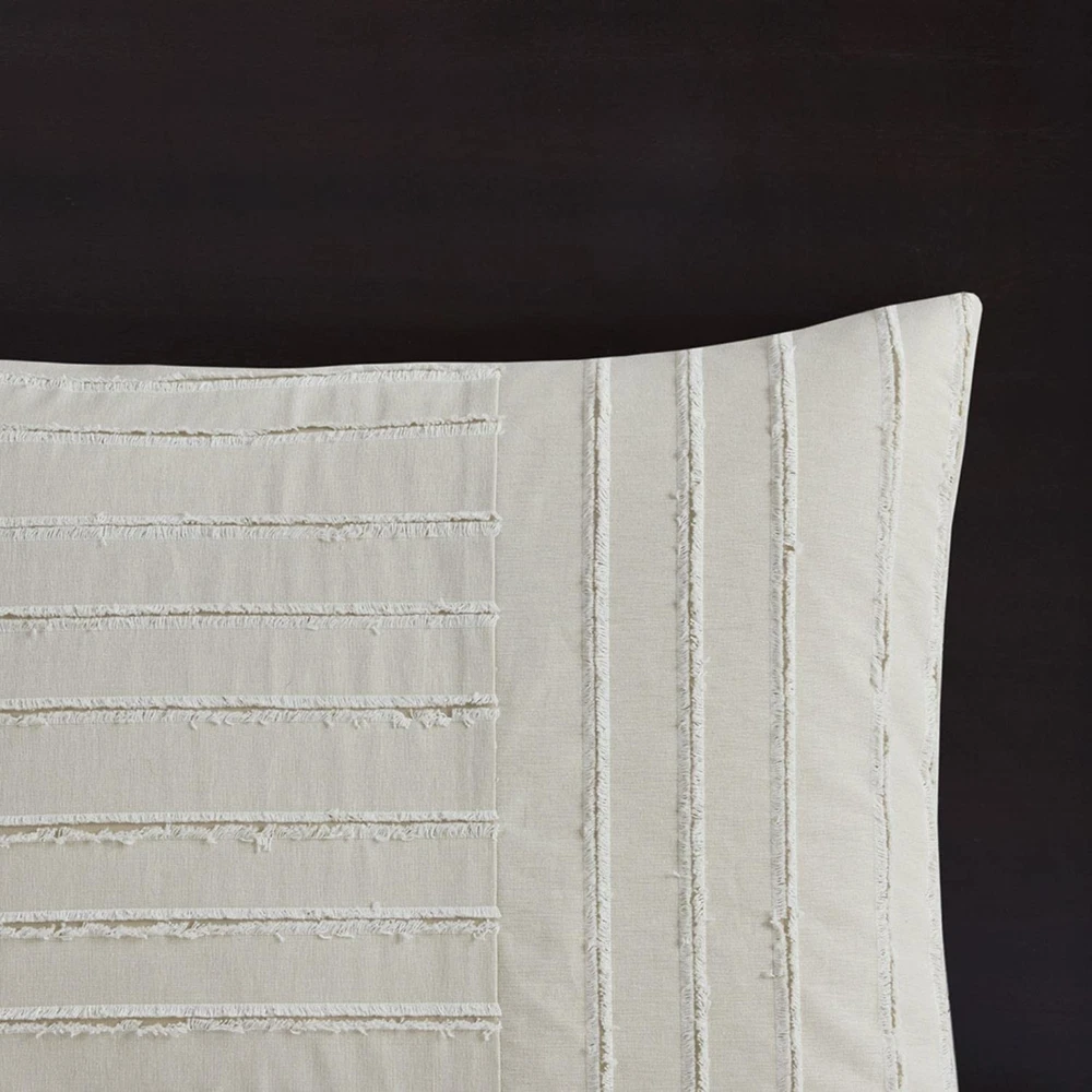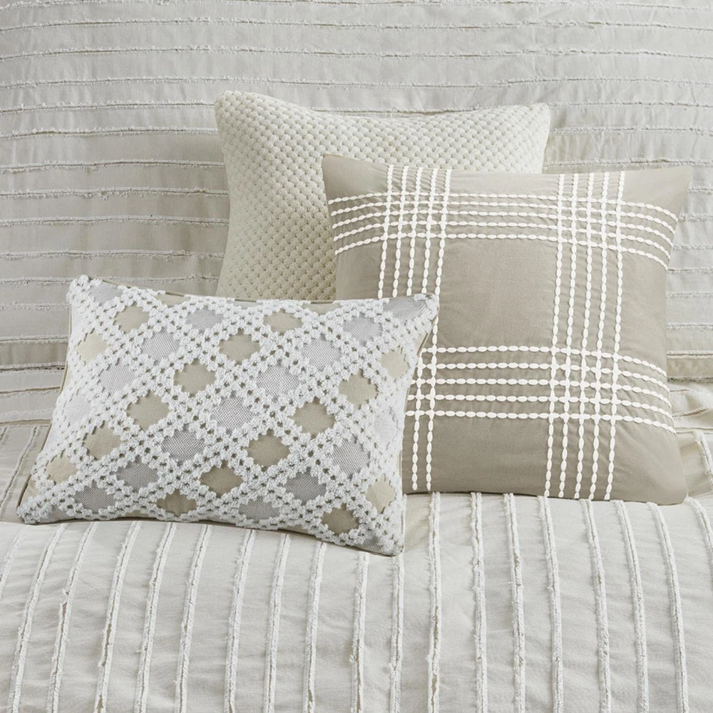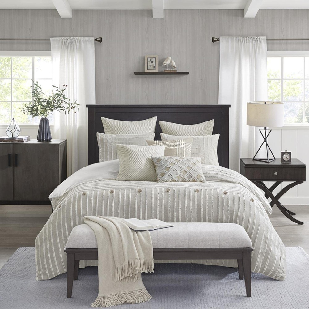 Comforter/Sham Face: 100% Cotton Clip Jacquard Pieced With Decorative Button; Back: 100% Cotton; Removable Seperate Polyester Filler Insert Euro Sham Face: 100% Arylic Knitted Fabric, Back: 100% Cotton Faux Linen Square Pillow 1 Cover: 100% Acrylic Knitted Fabric Square Pillow 2 Cover: 100% Cotton Faux Linen With Embroidery Oblong Pillow Cover: 100% Cotton Faux Line With Embroidery All Pillows With Hidden Zipper and 100% Polyester Filling Cottage Inspired Boho Bed Set - Boho-cottage bedding with clipped jacquard stripes and decorative buttons, offering casual elegance. The comforter's removable cover adds sophistication with non-visible bartack and allows for easy care Cotton Comforter Set - Crafted from breathable cotton, this generously-sized comforter offers enhanced coverage for a cozy night's sleep. Overfilled with skin-friendly down alternative filling for fluffiness ensuring year-round comfort Oversized - Offering enhanced comfort with its oversized coverage and overfilled for extra fluffiness, providing perfect warmth and cloudlike comfort. Conveniently comes with removable cover featuring hidden button closure & inner ties for easy care 8 piece Queen comforter set - 1 Comforter 92"W x 96"L, 2 Standard Shams 20"W x 26"L (2), 2 Euro Shams 26"W x 26"L (2), 2 Decorative Pillows 20"W x 20"L (2), 1 Decorative Pillow 14"W x 20"L