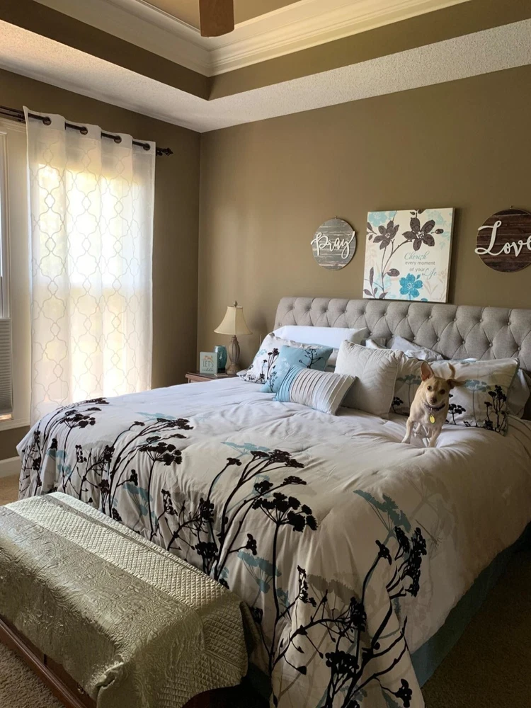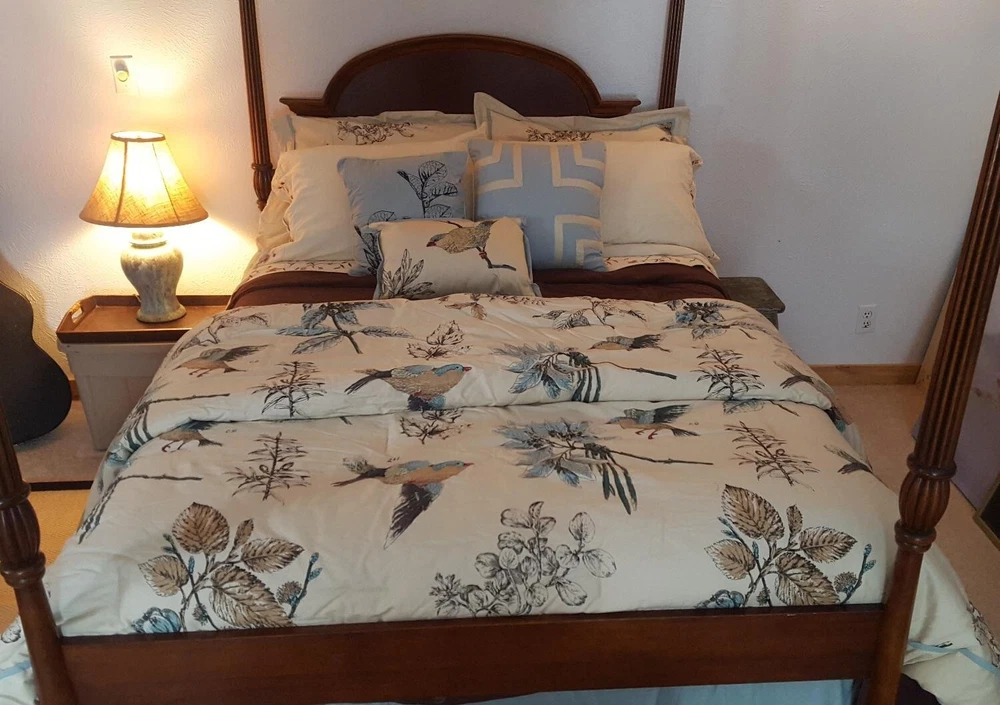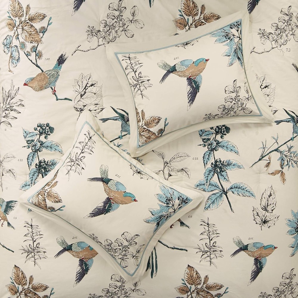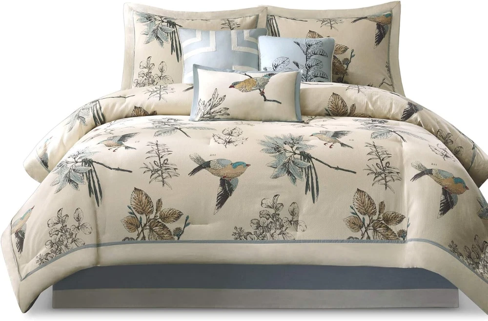 Queen Comforter Set Country Cottage Modern Farmhouse Birds Foliage Charming 7pc This Queen Comforter set is a country inspired seven piece set that will add a touch of elegance to your bedroom. Crafted from high quality cotton twill, this machine washable set features a leaf and bird pattern on the front and solid colored back. This 7-piece set gives you everything you need to start your bedroom makeover Queen Comforter Set Features: Set includes: One comforter, two shams, one bed skirt, three decorative pillows Color: Beige, Brown, Blue Multi Fabric detail: Woven Materials: Cotton Twill Hypoallergenic: Yes Care instructions: Machine washable Embroidery detailing on decorative pillows adds a touch of elegance Comforter dimensions: 90 inches wide x 90 inches long Sham dimensions: 20 inches wide x 26 inches long Bed skirt dimensions: 60 inches wide x 80 inches long with 15 inch drop Pillow dimensions: 18 inches wide x 18 inches long, 16 inches wide x 16 inches long, 12 inches wide x 18 inches long The digital images we display have the most accurate color possible. However, due to differences in computer monitors, we cannot be responsible for variations in color between the actual product and your screen. Queen Comforter Set Customer Reviews: "This beautiful bedding was the perfect shades of light blue. The darker shades of birds added a touch of color" " This lovely comforter set is well made and looks great in our bedroom. " " This set caught my heart the moment I saw it online and it didn't disappoint. " Add country cottage charm to your bedroom with our Queen Comforter Set