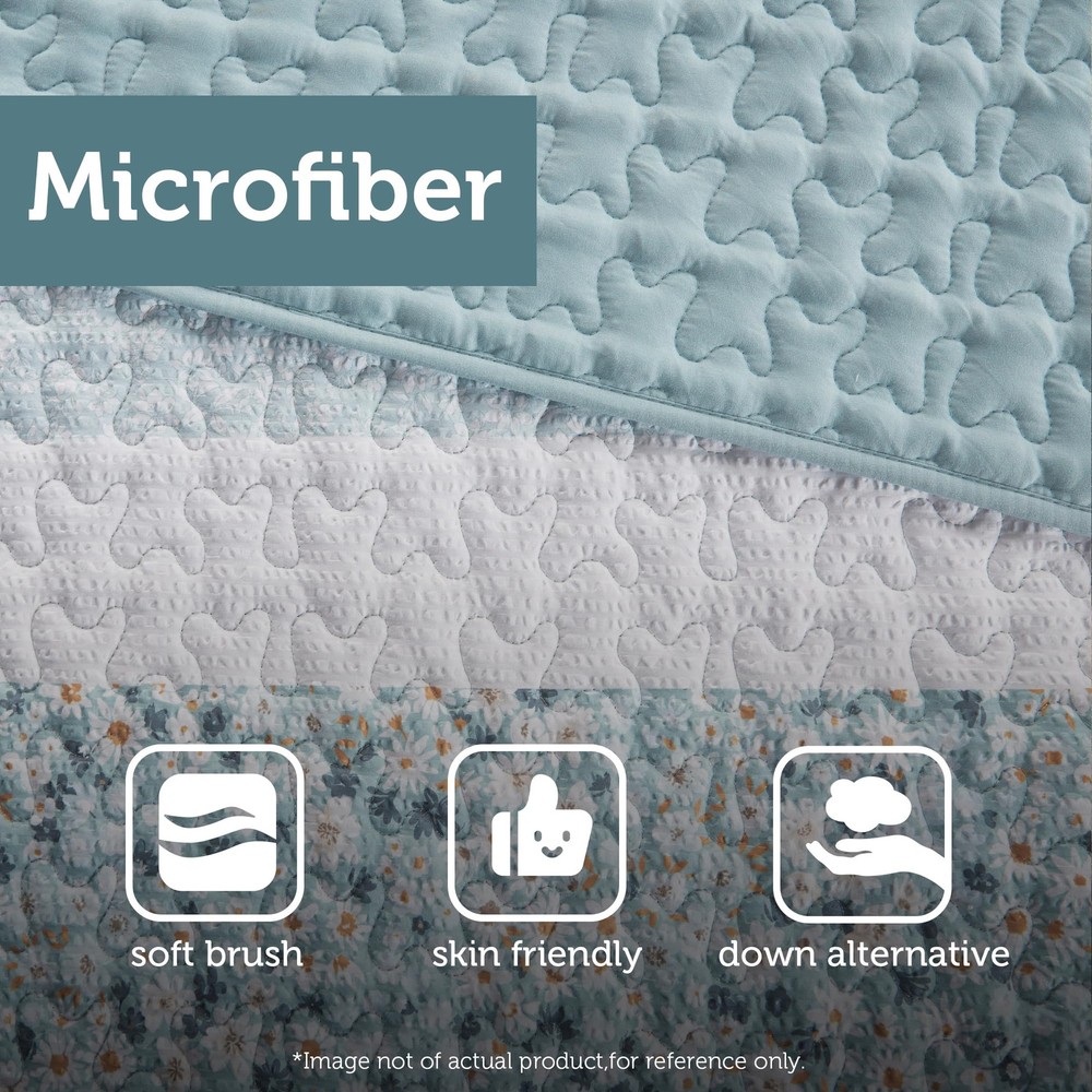 Love how this lightweight quilt set instantly brightens up my bedroom—the soft seersucker texture and pretty florals give it such a cozy, fresh farmhouse feel. The microfiber is breathable yet warm enough for year-round use, and the extra pillow adds a charming touch. So happy with the vibrant aqua and green tones—it feels like a perfect spring refresh! Washes well and looks even better in person. Definitely a great buy!