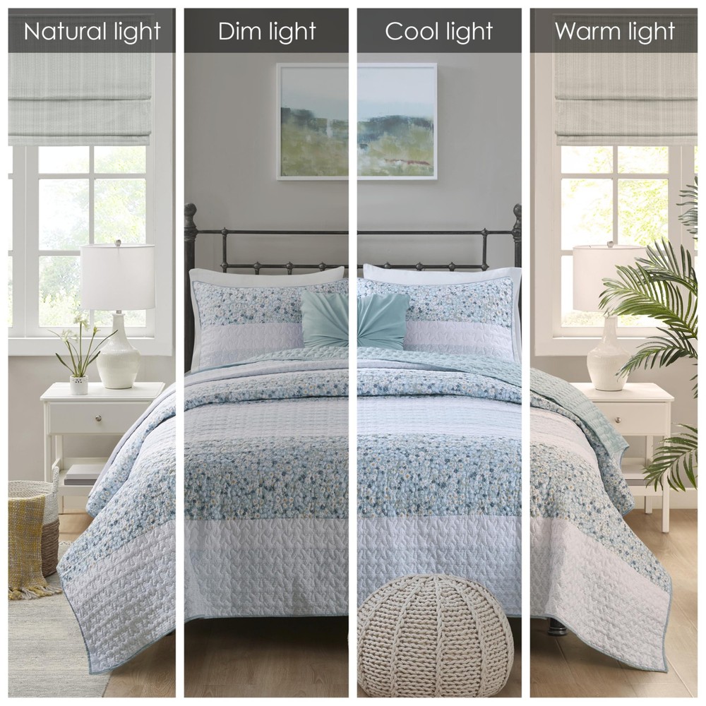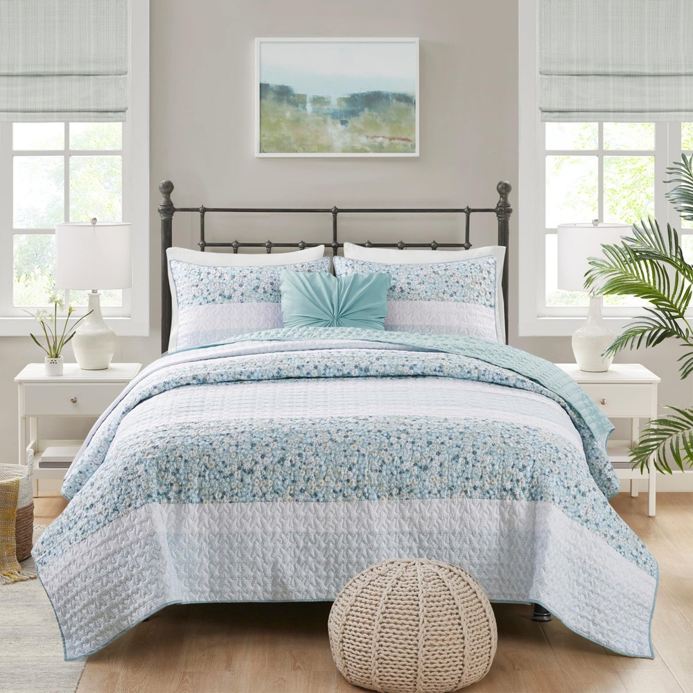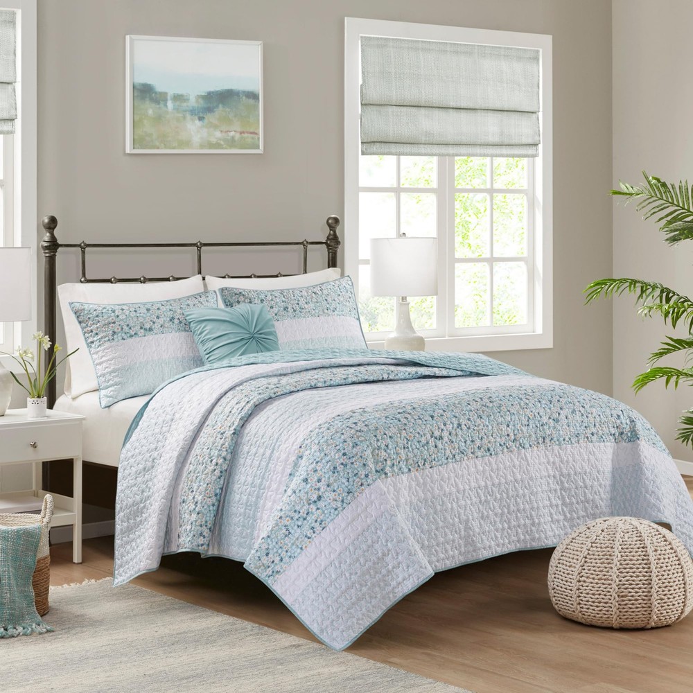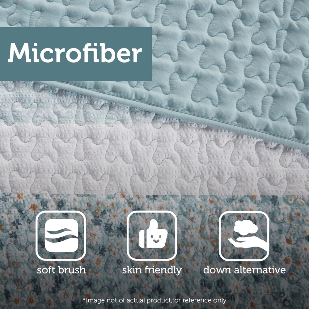 Bedroom Refresh: Revitalize your bedroom with the Caralie shabby chic coverlet Set. Seersucker texture, floral & botanical print create a cozy, inviting French Country ambiance. Includes coordinating shams and throw pillow Pure Comfort: Indulge in luxuriously soft brushed microfiber and skin-friendly down alternative fill, hygienically treated for lasting freshness All Season Bedding - This versatile comforter is designed to keep you cozy and comfortable in any season. Lightweight & soft to keep you cool during summer nights, yet with ample warmth to provide comfort through colder winter seasons Set include: 1 Quilt: 96"W x 90"L, 2 Standard Shams: 20"W x 26"L, 1 Throw Pillow: 18"W x 18"L Easy Care - Machine washable. Use large capacity washer and dryer for best results. Cold/delicate cycle, low/no heat dry. Use fabric steamer for wrinkles & fluff up items as needed