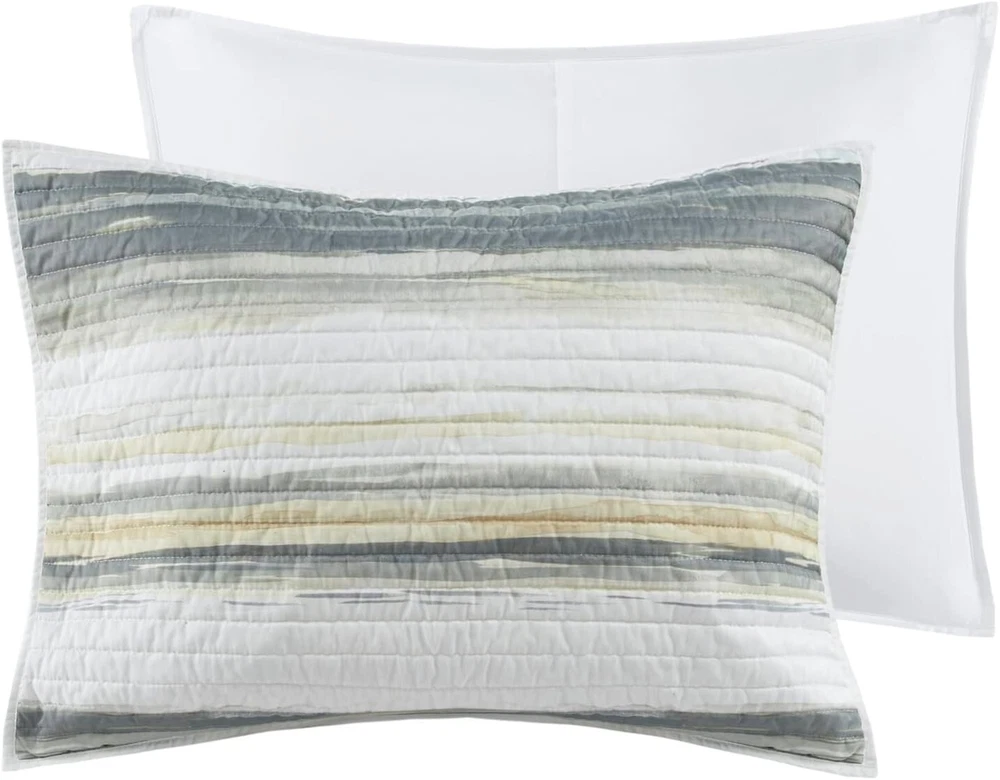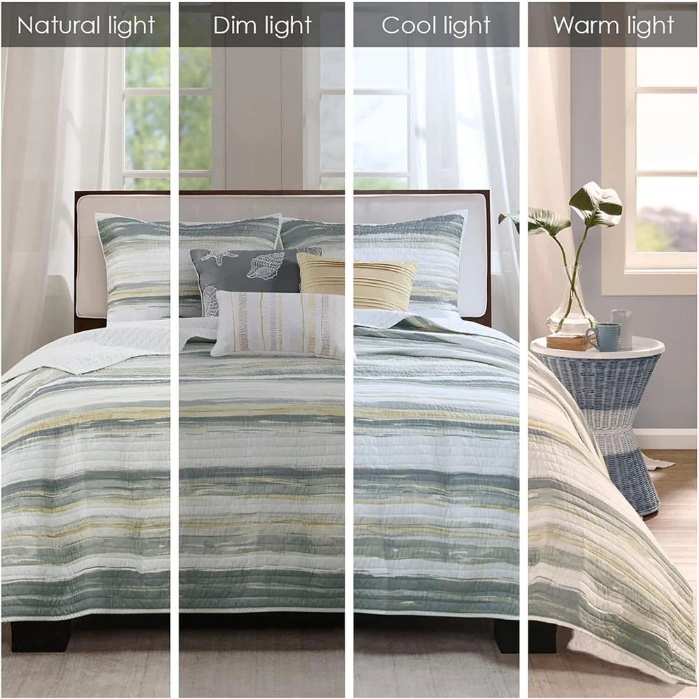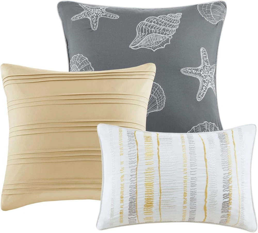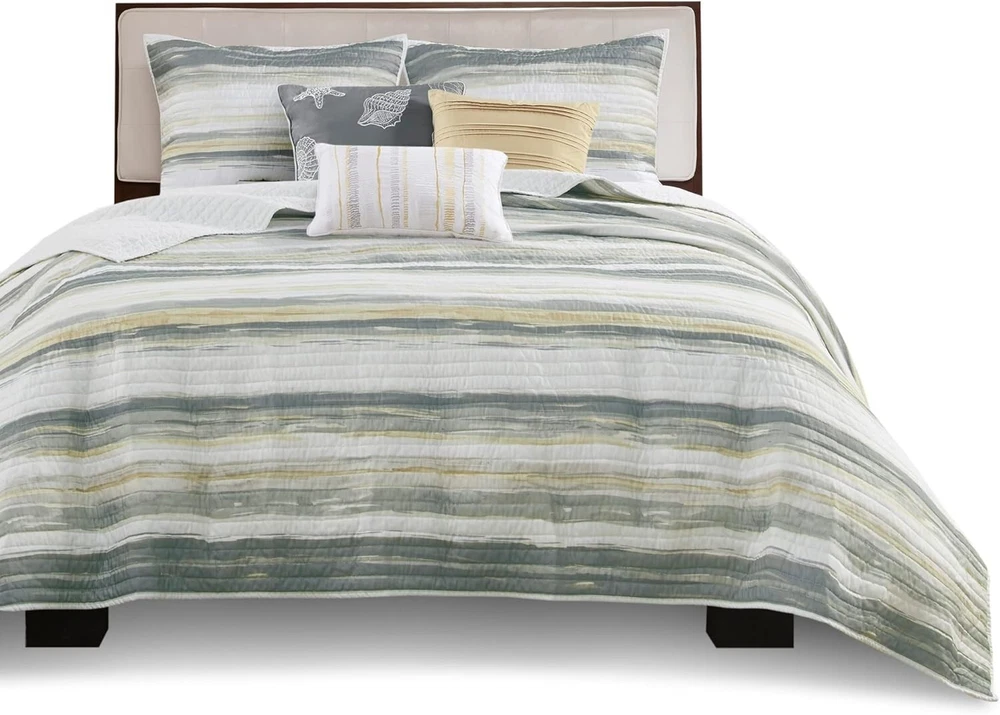 Queen Quilt Set Yellow Gray Striped Coastal Nautical Tropical Beachy Summer 6Pc This Queen Quilt Set is a nautical watercolor set that brings a sunny coastal vibe to your bedroom. Its yellow and gray stripes evoke warm shores and tranquil elegance. Reversible with a solid design, it offers chic, versatile styling. Soft microfiber and decorative pillows create a cozy, inviting retreat. Additional Product Features: - Includes one 90"W x 90"L coverlet, two 20"W x 26"L shams, three pillows - Polyester microfiber with 90% cotton/10% other fibers fill for comfort - Features watercolor stripe pattern with solid color reverse - Three decorative pillows (16"x16", 12"x18", 18"x18") with embroidered seashells - Machine washable or spot clean for easy care and maintenance - Ideal for Queen beds, perfect for adult bedrooms - Pre-washed, quilted design adds coastal, contemporary flair year-round Transform your space with coastal charm—grab this nautical Queen Quilt Set today!