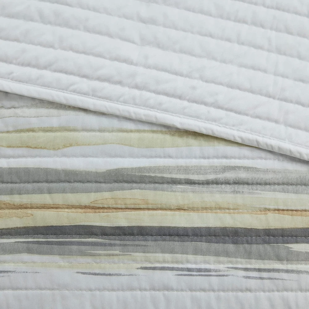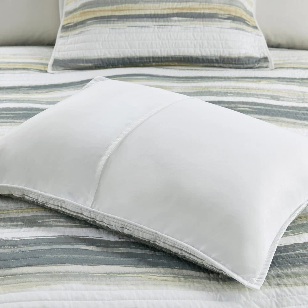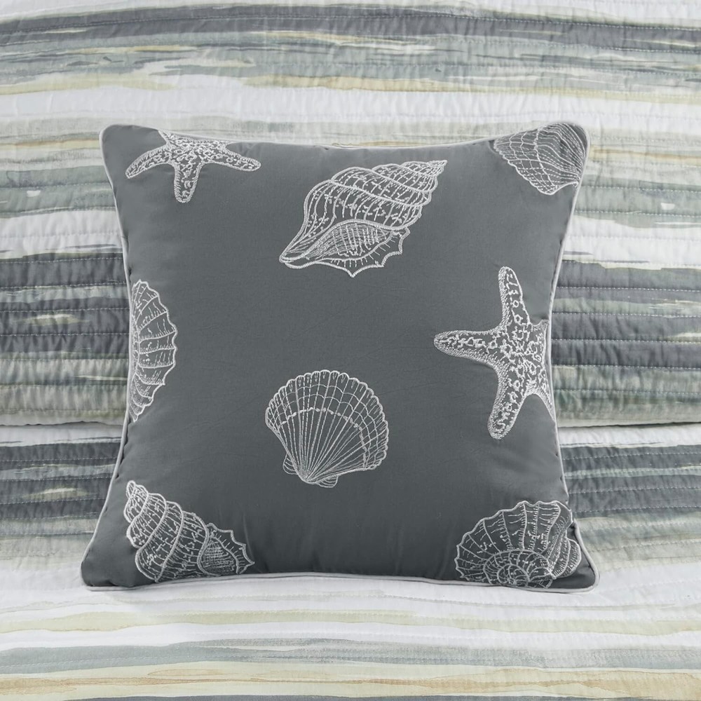 Queen Quilt Set Yellow Gray Striped Coastal Nautical Tropical Beachy Summer 6Pc This Queen Quilt Set is a nautical watercolor set that brings a sunny coastal vibe to your bedroom. Its yellow and gray stripes evoke warm shores and tranquil elegance. Reversible with a solid design, it offers chic, versatile styling. Soft microfiber and decorative pillows create a cozy, inviting retreat. Additional Product Features: - Includes one 90"W x 90"L coverlet, two 20"W x 26"L shams, three pillows - Polyester microfiber with 90% cotton/10% other fibers fill for comfort - Features watercolor stripe pattern with solid color reverse - Three decorative pillows (16"x16", 12"x18", 18"x18") with embroidered seashells - Machine washable or spot clean for easy care and maintenance - Ideal for Queen beds, perfect for adult bedrooms - Pre-washed, quilted design adds coastal, contemporary flair year-round Transform your space with coastal charm—grab this nautical Queen Quilt Set today!