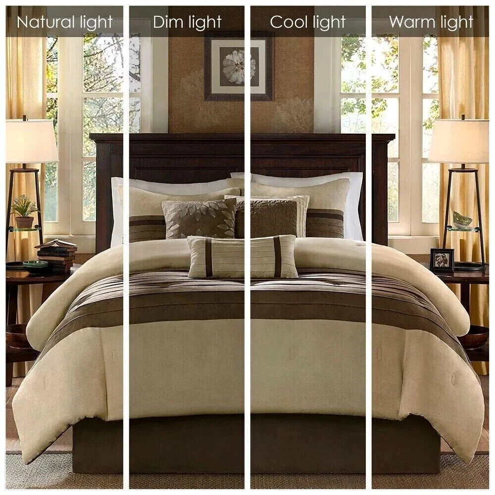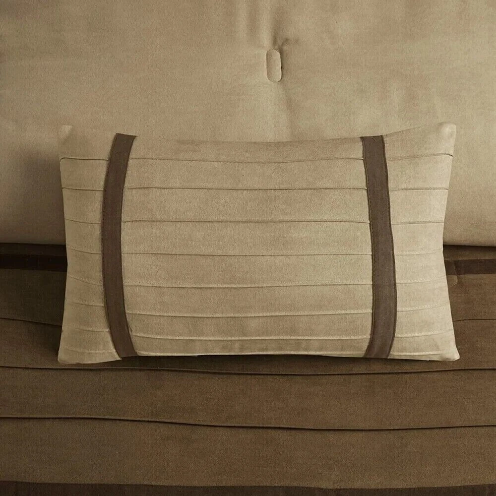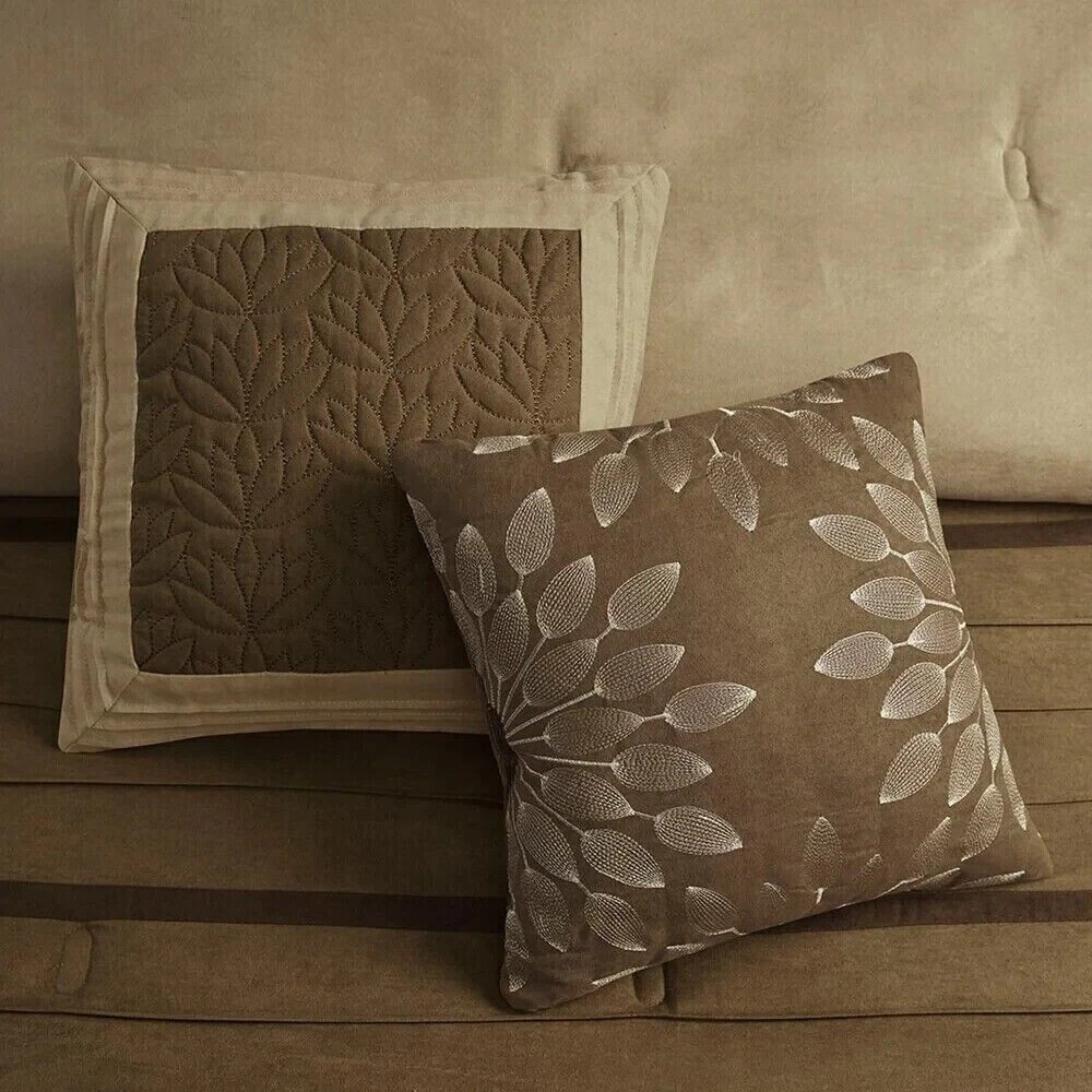 Queen Size Bedding Comforter Set Modern Farm Rustic Neutral Brown Faux Suede 7Pc This Queen Size Bedding Comforter Set will add a classic touch to completely makeover your master bedroom. The set consists of (7) seven-pieces that allow you to decorate effortlessly. A matching comforter, bed skirt, two shams and the three accent pillows are sure to give your bedroom a whole new look. Additional Product Features: Includes: One comforter, one bedskirt, two shams, three pillows Style: Solid Color: Natural/Brown Fabric detail: Woven Pattern: Natural Material: 100% Polyester microsuede Bedskirt drop length: 15 inches Care instructions: Machine washable Queen Comforter: 90” wide x 90 inches long Bedskirt: 60 inches wide x 80” long 2 Shams: 20 inches wide x 26 inches long Queen Size Bedding Pillow Dimensions: • 16 inches wide x 16 inches long • 18 inches wide x 18 inches long • 12 inches wide x 20 inches long The digital images we display have the most accurate color possible. However, due to differences in computer monitors, we cannot be responsible for variations in color between the actual product and your screen. Give your bedroom a whole new look with the addition of this Queen Size Bedding