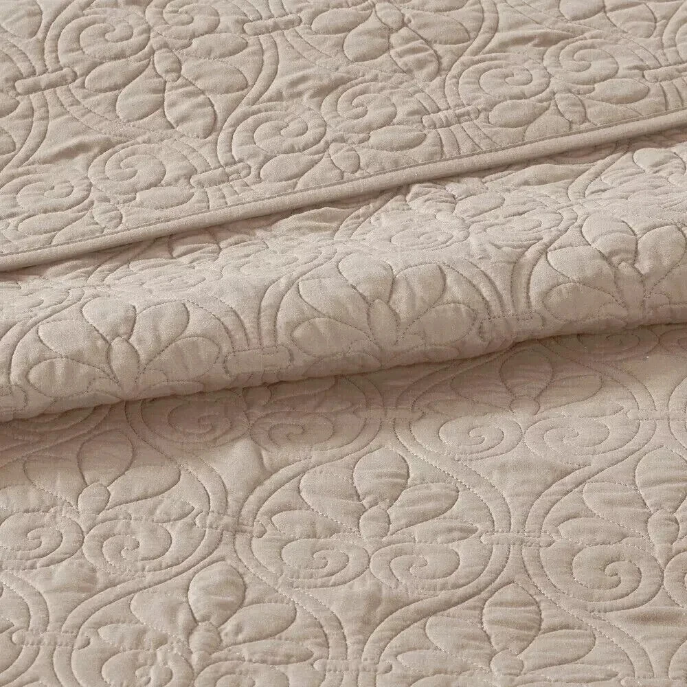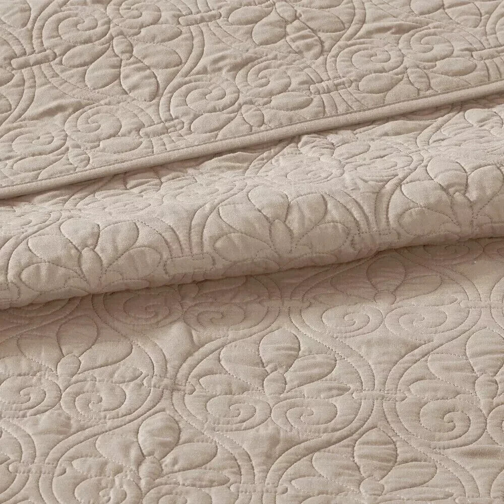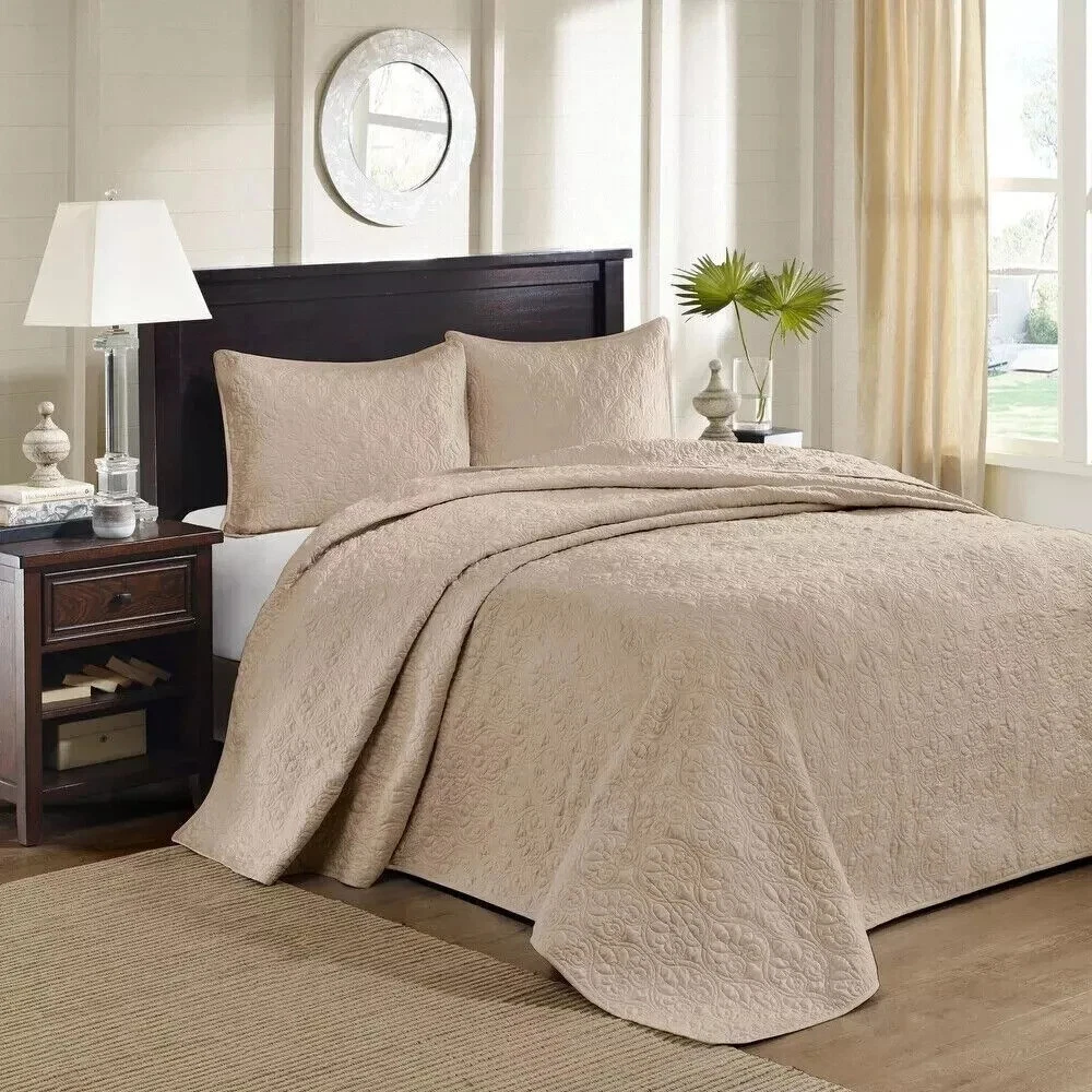 Queen Size Bedding Oversized Bedspread Quilt Set Khaki 3 Pc Elegant 120x118 This Queen Size Bedding 3pc oversized bedspread is a soft, luxurious and eye-catching oversized bedspread set that features one elegant bedspread and two shams. The classic stitch pattern pairs easily with your existing decor and is sure to add a new decorative element to your bedroom. Additional Product Details: Includes 1 bedspread, 2 shams Pattern: Quilted Bedspread materials: 100-percent poly microfiber with all over quilting Filling material: Cotton Machine washable Bedspread: 102 inches wide x 118 inches long Shams: 20 inches wide x 26 inches long Color Khaki The digital images we display have the most accurate color possible. However, due to differences in computer monitors, we cannot be responsible for variations in color between the actual product and your screen. Give your bedroom a makeover with our oversized Queen Size Bedding