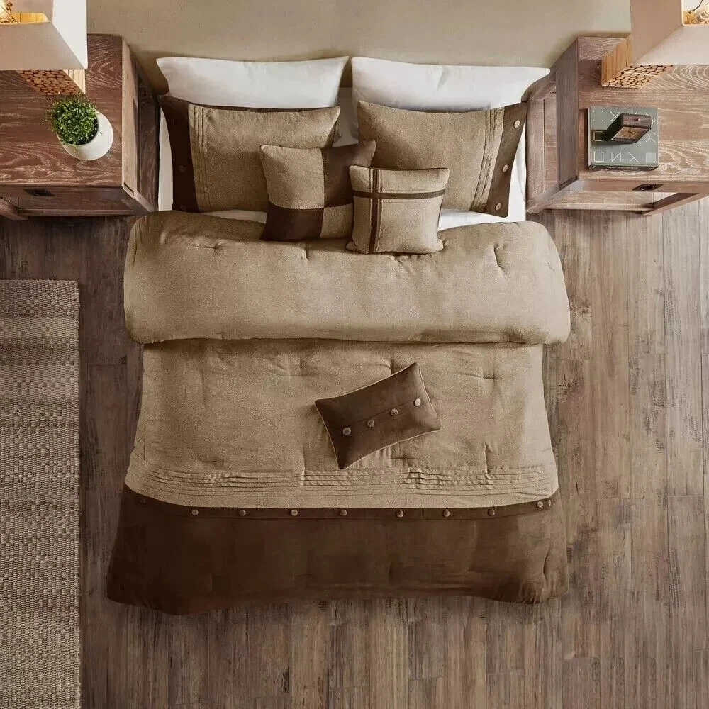 Queen Size Comforter Set Brown Rustic Cabin Lodge Farm All Seasons Bedding 7Pc This Queen Size Comforter Set is a rustic lodge set that transforms your bedroom into a cozy cabin retreat. Its brown and beige tones radiate warm rustic charm. Pieced faux suede with decorative pillows offers versatile lodge style. Soft microsuede and hypoallergenic fill ensure lasting comfort. Additional Product Features: - Includes one 90"W x 90"L comforter, two 20"W x 26"L shams, bedskirt, three pillows - 100% polyester microsuede with hypoallergenic polyester fill - Features pieced design with tonal stripes and decorative buttons - Brown and beige hues enhance cabin or casual decor - Machine washable for easy care and maintenance - Bedskirt (60"W x 80"L x 15"D) completes the rustic look - Ideal for Queen beds, perfect for adult bedrooms The digital images we display have the most accurate color possible. However, due to differences in computer monitors, we cannot be responsible for variations in color between the actual product and your screen. Queen Size Comforter Set Customer Reviews: "This is a great comforter set. I never wanted to get out of bed in the morning. :) " " This is one of the softest and beautiful comforters I've purchased in a long time.! " " We Love this set! Warm and snugly! Couldn’t ask for more. " Create a warm cabin vibe—grab this 7 Piece Queen Size Comforter Set today!