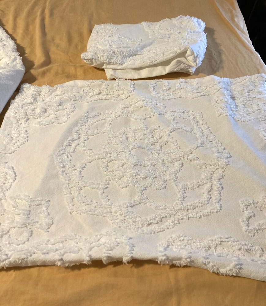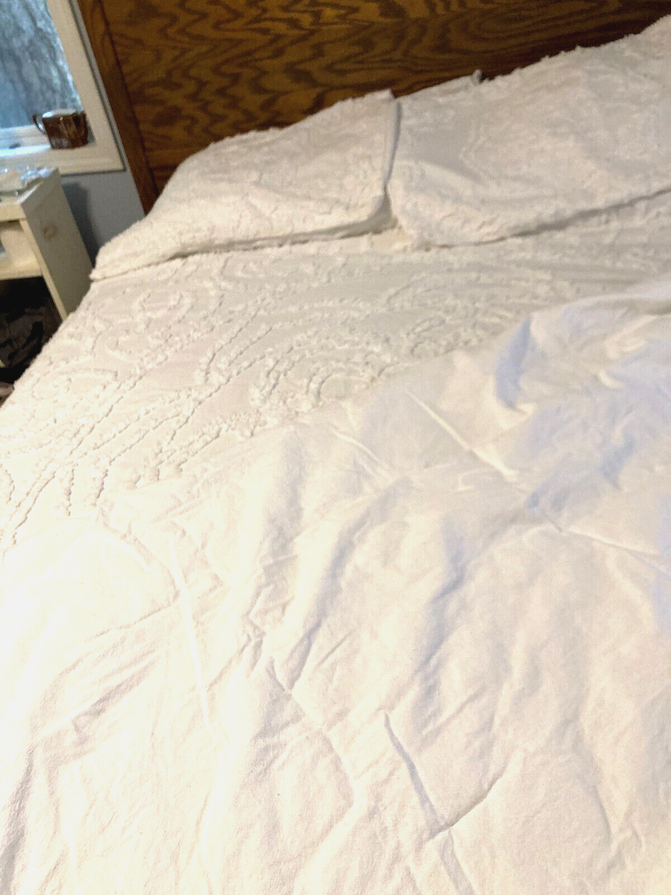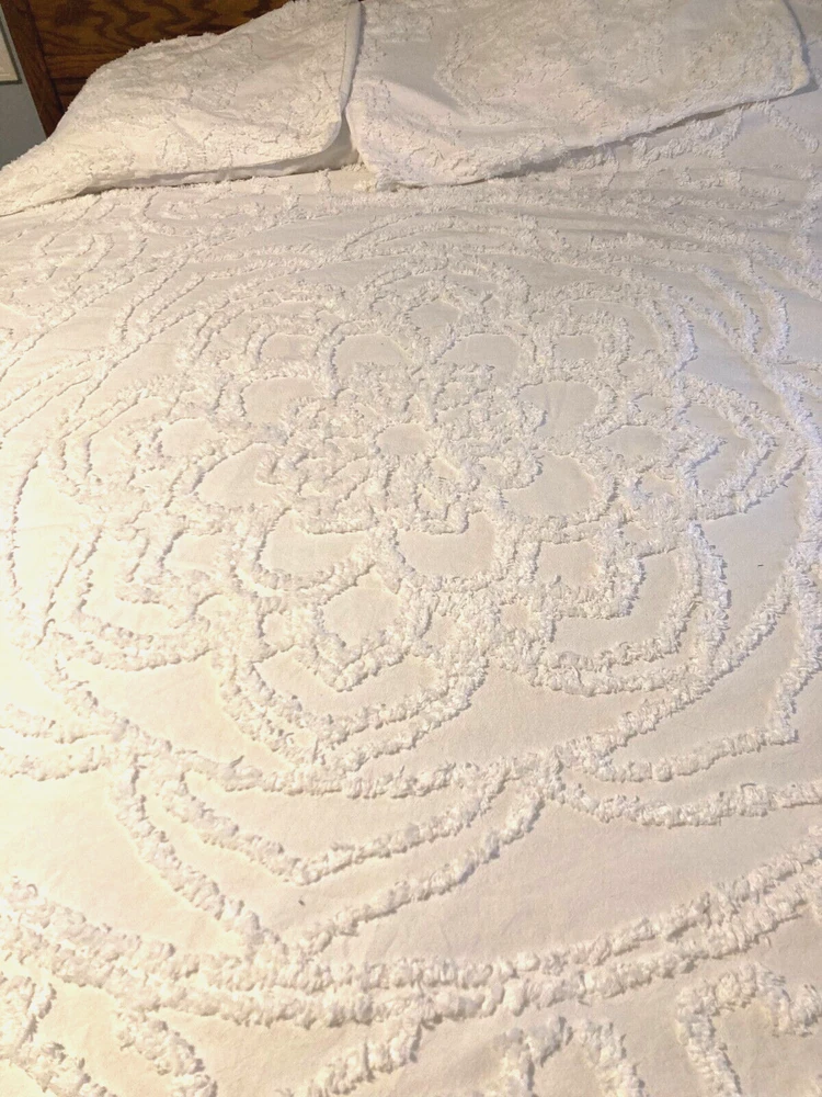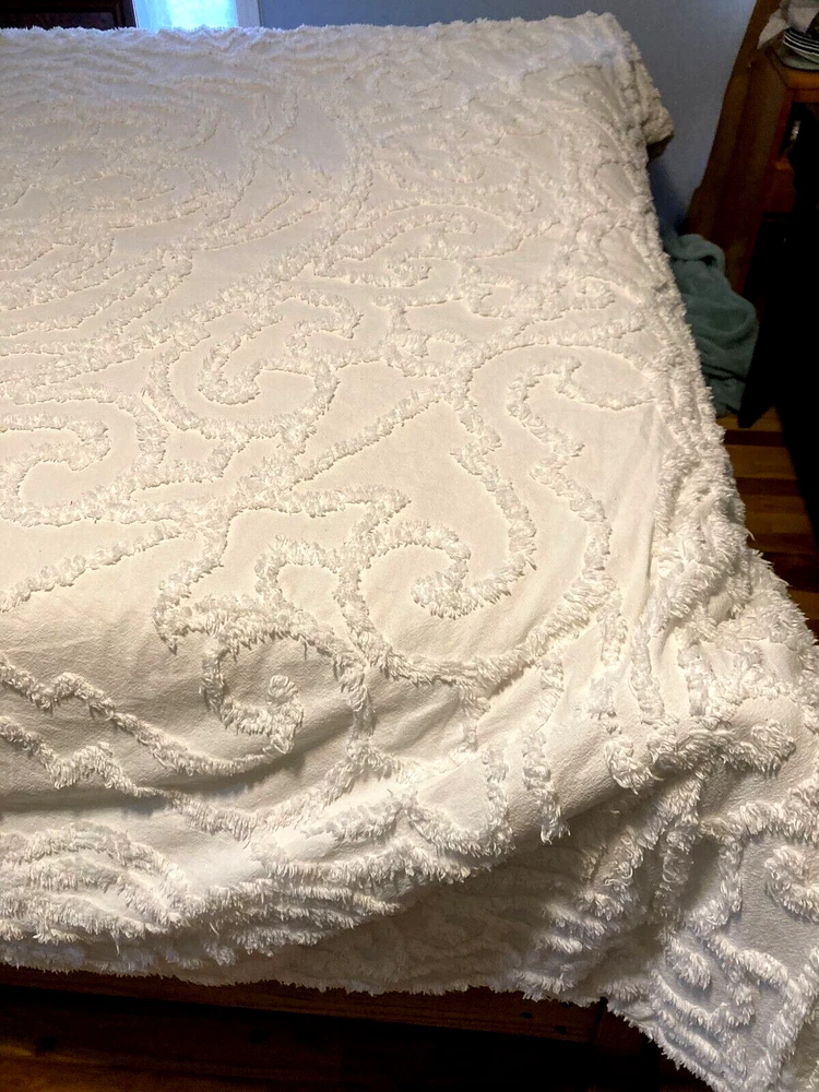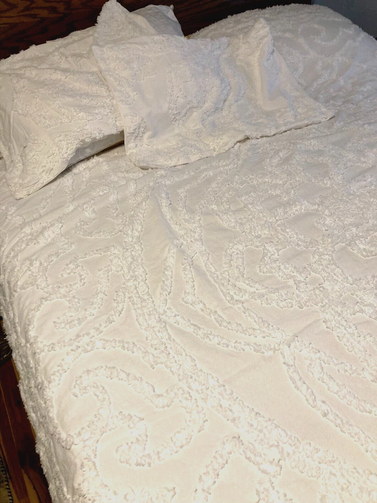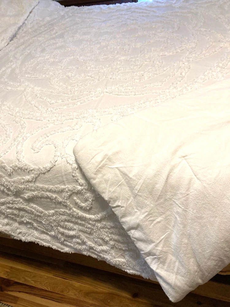 Fun puffy comforter with loosely drawn chenille design in a white on white pattern.. The texture of the chenille against the moderately heavy cotton backing present a luxurious and cozy statement. Made in India. Measures 90" x 90" per label and tape measure.