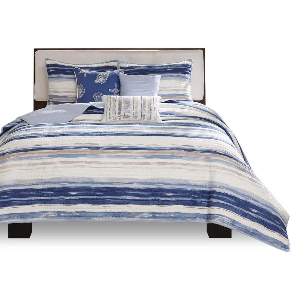The Marina coverlet set provides a modern take on the coastal stripe. It's watercolor motif, accented with shades of Navy and aqua, provides the calming feel of the ocean in your space. Three decorative pillows use embroidered seashells and fabric manipulation to pull this look together. Set includes: 1 coverlet, 2 King shams, 3 decorative pillows Cover: 100Percent polyester filling: 90Percent cotton/10Percent other fiber Machine washable Measurements: 104-by-94-inch coverlet, 20-by-36-inch King shams, 18-by-18-inch square pillow, 16-by-16-inch square pillow, 12-by-18-inch Oblong pillow