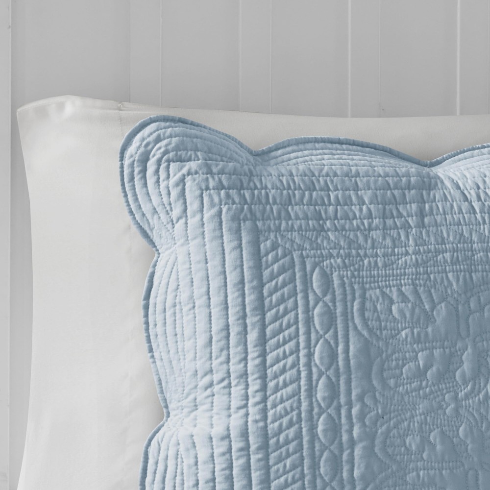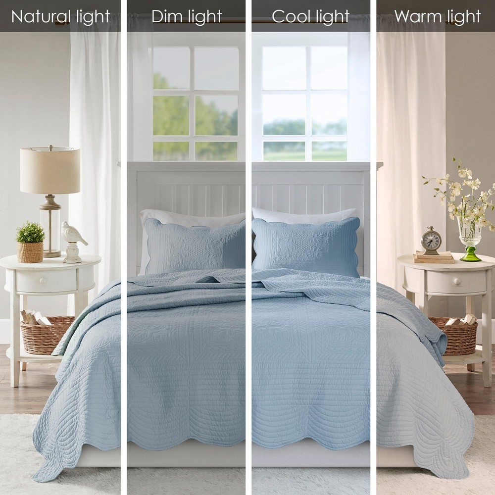 The Tuscany 3 Piece Scalloped Edge Coverlet Set is perfect as a layering piece or as an alternative to your comforter for a charming country look. The coverlet and shams flaunt a classic stitch pattern with scalloped edges that add an elegant touch to your bedroom. This coverlet is filled with a breathable cotton filling and features a soft microfiber face, giving your bed a cozy cottage look. Cottage Quilt Set: Elevate your décor with charming coastal elegance quilt, featuring embossed damask quilting & a scalloped edge. Oversized coverage for added comfort & complete with matching shams, it's perfect for a charming update Superior Softness - Tuscany coverlet prewashed cotton for incredible softness with cotton fill enhanced breathability and comfort for a cozy night sleep LUXURIOUSLY COMFORTABLE: Crafted from soft prewashed cotton, our lightweight king size quilt is perfect for summertime comfort or as an extra layer during colder months for added warmth and style Set include: 1 Quilt: 108"W x 96"L, 2 King Shams: 20"W x 36"L CARE INSTRUCTIONS - Machine washable. Use large capacity washer and dryer for best results. Cold/delicate cycle, low/no heat dry. Fluff up items as needed. Steam iron for wrinkles