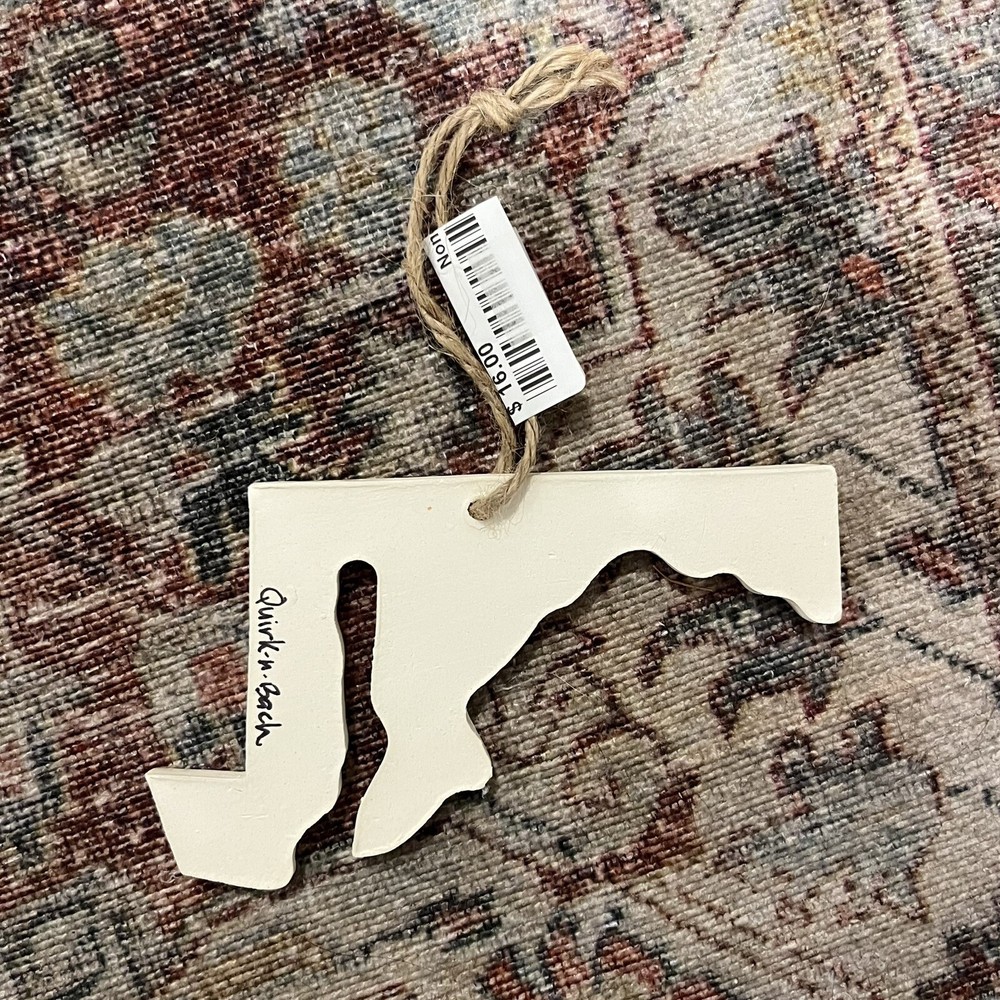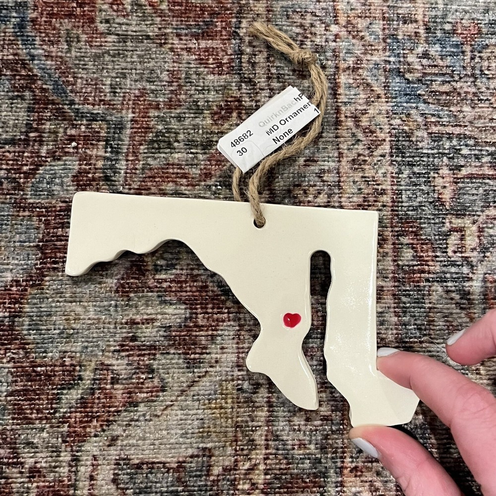 Brand new, never been used. Tags still attached Ceramic Maryland state shaped ornament with heart pained approx. where Annapolis/Baltimore is located Twine attached for easy hanging on tree