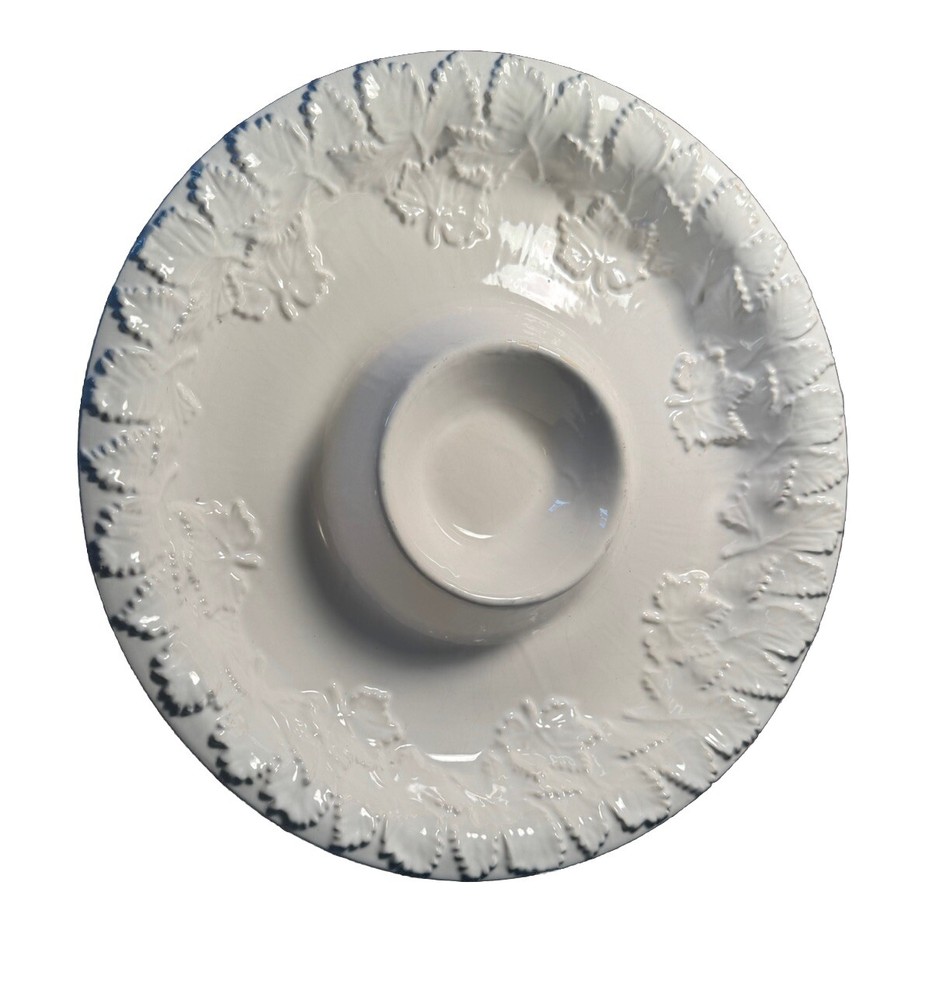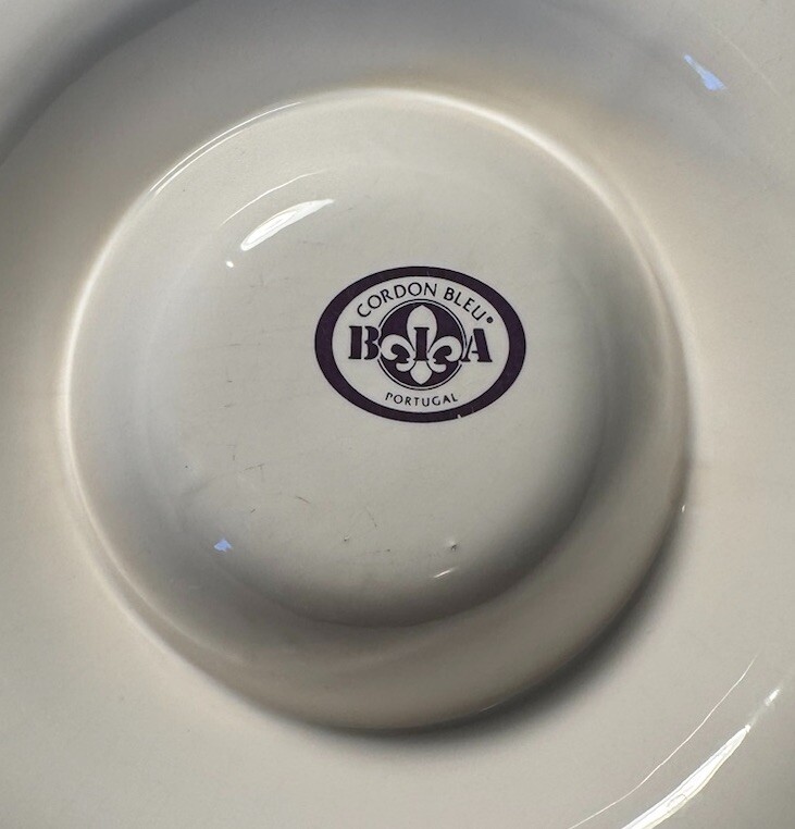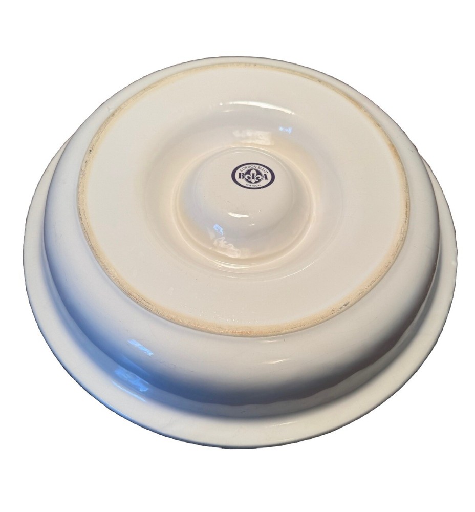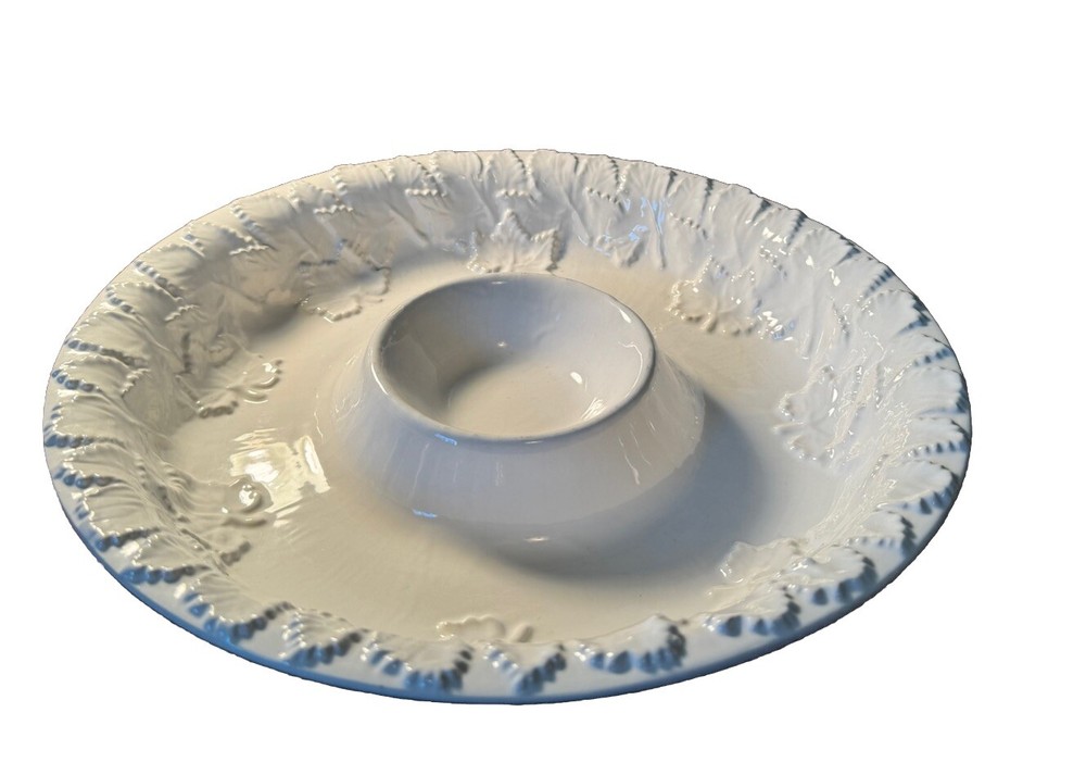 This large round chip and dip bowl by BIA is a rare find for any collector. The Cordon Bleu pattern, made of shiny white ceramic, features an embossed raised leaf design that adds a touch of elegance to any table setting. The bowl measures 13.38 inches in diameter and stands at 2.5 inches tall, weighing 3lbs 12 oz. Perfect for serving chips or dip, or vegetables and dip this chip dip bowl is a must-have for any fan of Portuguese cuisine. Manufactured in 199O’s, this bowl is a unique addition to any kitchen or dining room. The BIA brand is known for its high-quality ceramic products, making this bowl a durable and stylish choice for any home. It is in very good condition without any cracks or scratches!