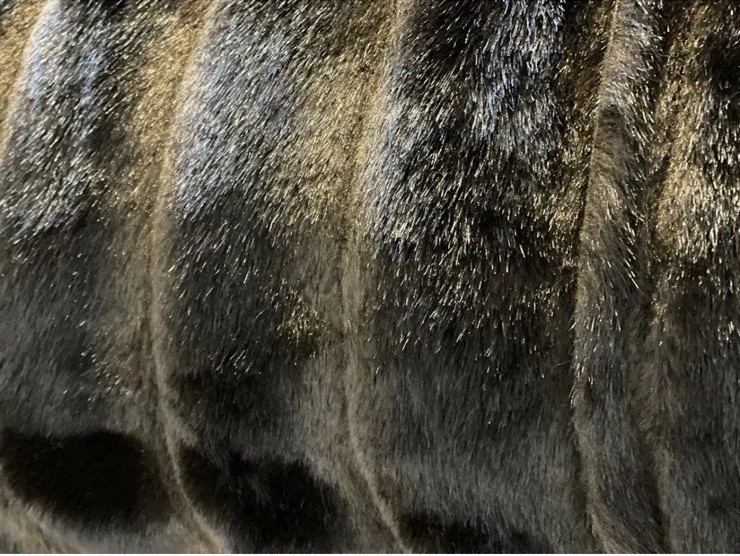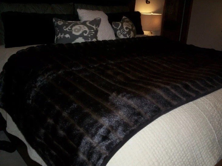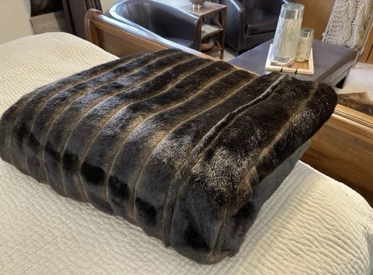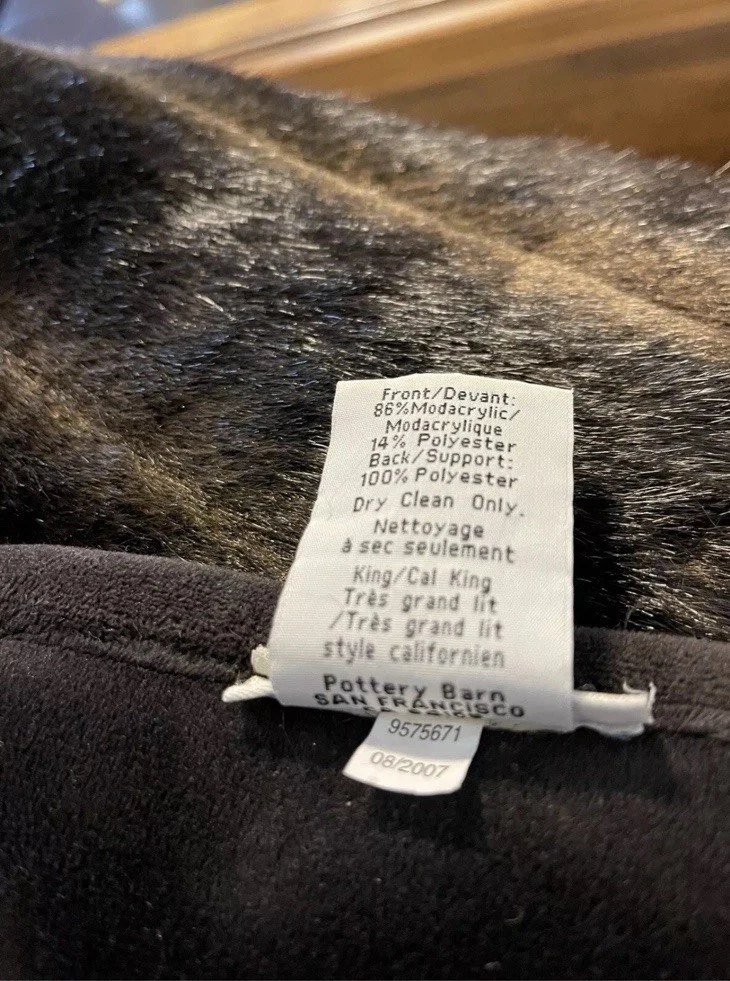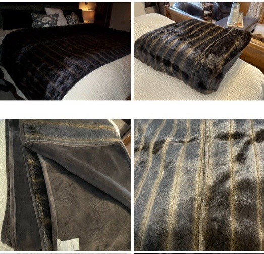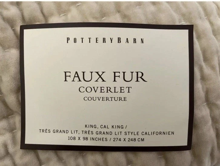 Ultra Rare Pottery Barn Faux Fur King size coverlet. This is NEW out of packet and used for display only; was staged at the end of a guest room bed. Never slept on or under :) This is dark espresso brown accented with rich cognac carmel color channeling and reversing to a luxurious espresso velvet like backing. This is quite heavy and I use flat rate shipping. To achieve this king size, Pottery Barn has sewn three pelts together. I will and do refund any shipping amount in excess of $10 to your shipping location. Smoke and pet free Please read my 100% POSITIVE FEEDBACK. I am long time seller on EBay and am happy to answer any questions PRIOR to purchase. I only ship to the continental United States. I do not accept returns. No offers will be accepted. Dry clean only. Never put any kind of fur in a dryer.