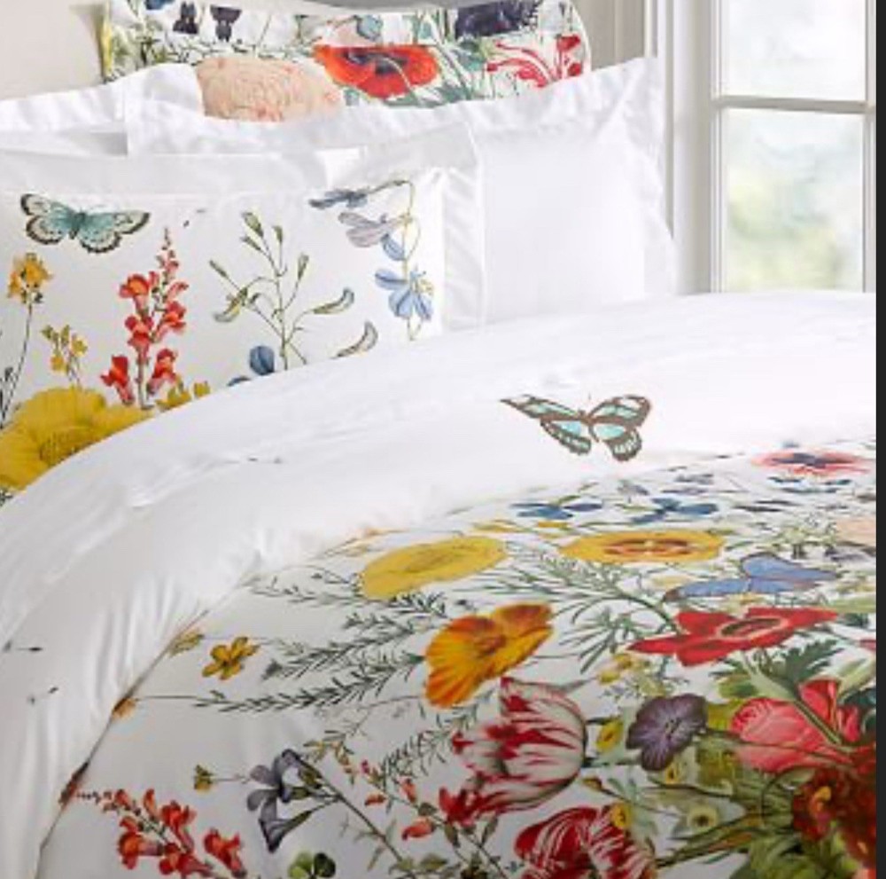 *** RARE FIND *** Pottery Barn Flora Duvet - Organic Floral - King/Cal King Duvet Cover. 100% Cotton. Sateen smooth finish. Beautiful RIGHT NOW. Ethereal, Sophisticated Floral pattern a so amazing!!! ConstructionMade from 100% cotton.. Duvet features a hidden button closure with inner ties to keep insert in place. Shams feature a zipper closure. CareWash before first use. Machine wash in warm water; gentle cycle. Only use non-chlorine bleach, if needed. Tumble dry on low heat; remove promptly. Warm iron as needed. *** A NOTE ABOUT BUY IT NOW *** The Buy It Now price is only available when there are no bids. Once a bid has been placed, the Buy It Now price disappears, and now the item will be sold to the highest bidder - even if that price is higher then the original Buy It Now price. This is not our policy, it is an eBay policy we cannot change So, be aware - if you want the item, consider Buy It Now