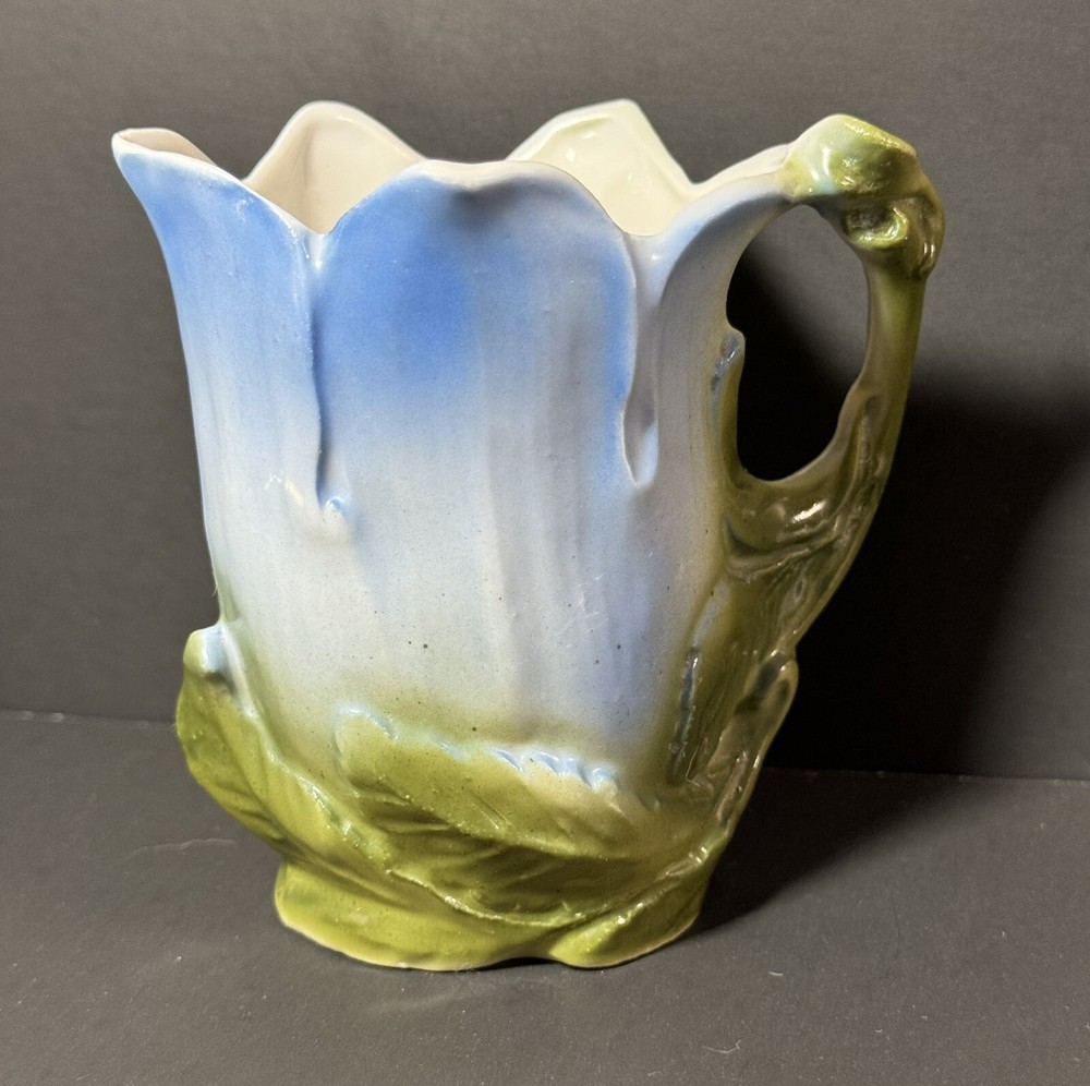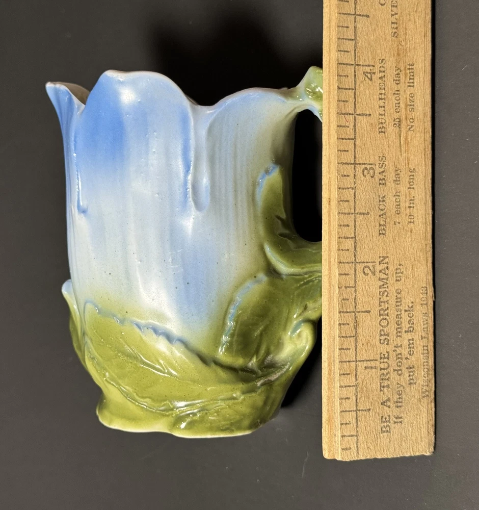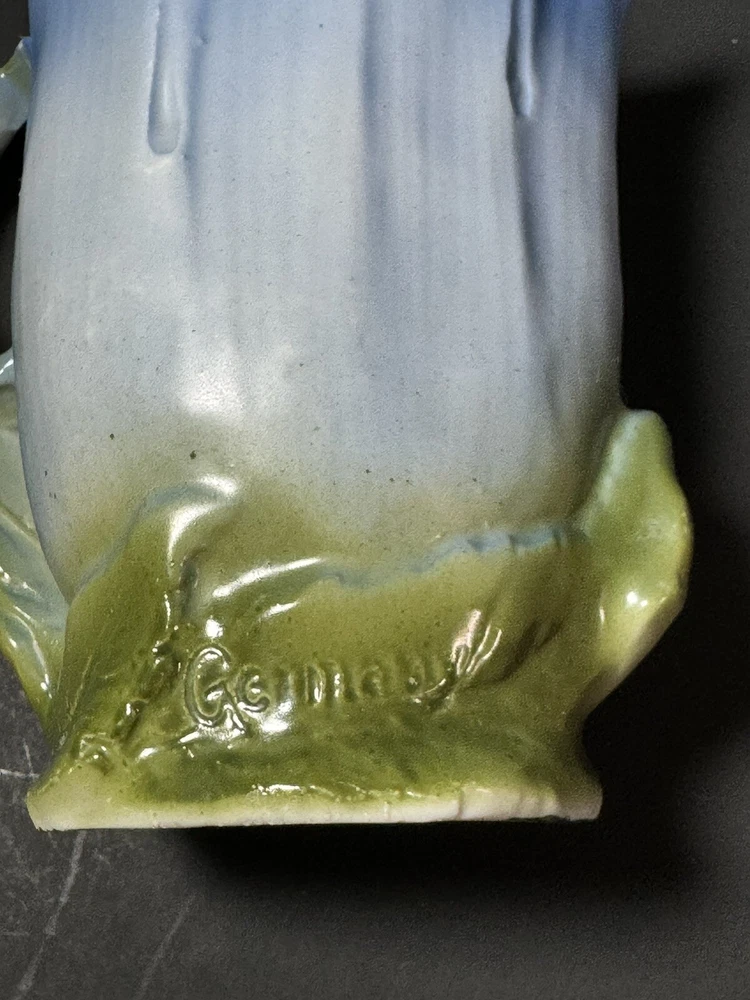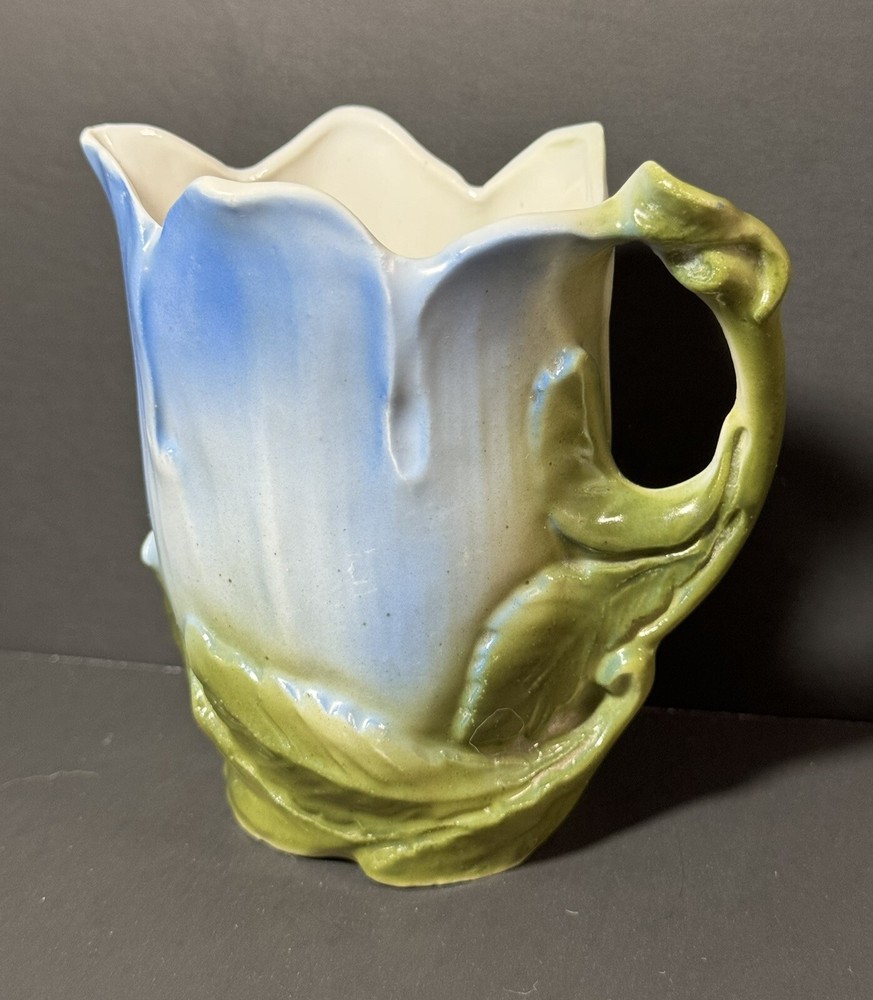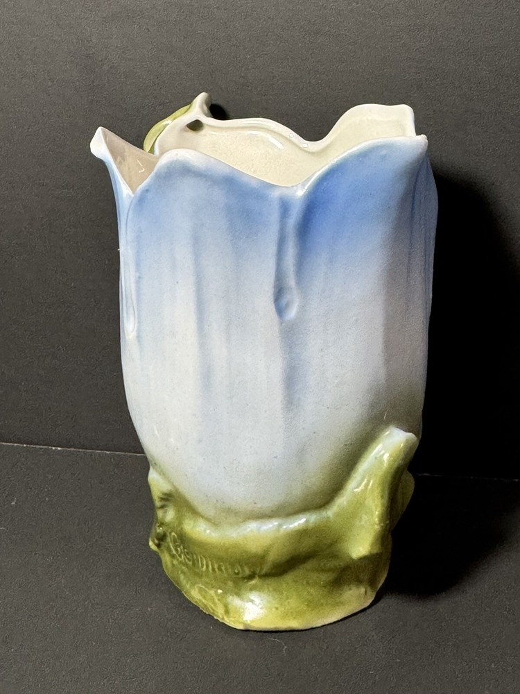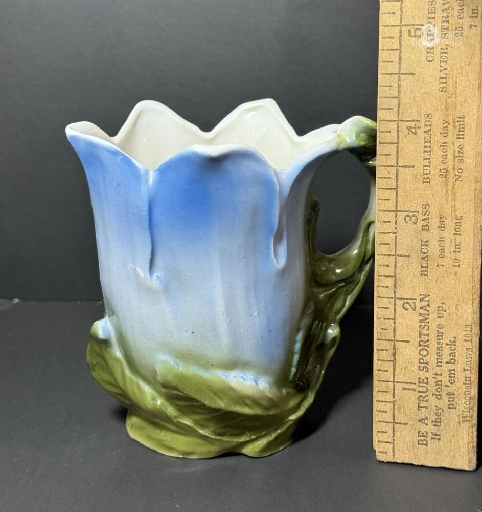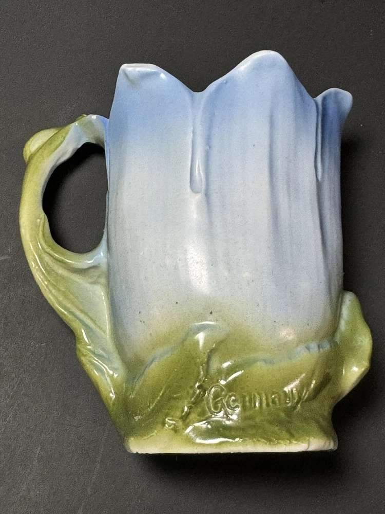 An extremely RARE late 1800’s Floral shaped Ewer or Mug in Bisque porcelain. Impressed on the bottom front with GERMANY. Looks like a Franz or Royal Bayreuth piece, but I wasn’t able to find an identical one like this anywhere! So, I will let the buyer decide the manufacturer of this piece! In excellent condition, with no chips, cracks or paint loss. This tulip or flower shaped mug was often called a Ewer, and used as a decorative vase to hold flowers. It is definitely a unique piece of bisque porcelain, made approximately in the late 1800’s. Measures about 4 1/4” High with a top diameter of 3 1/4” and a bottom diameter of 2 3/8”. A beautiful periwinkle blue color for the flower with shaped petals and green leaves formed around the bottom with a vine or branch shaped handle. A gorgeous piece for any collector! Please look at all my photos as they part of my description and used to show the quality and condition of my items.