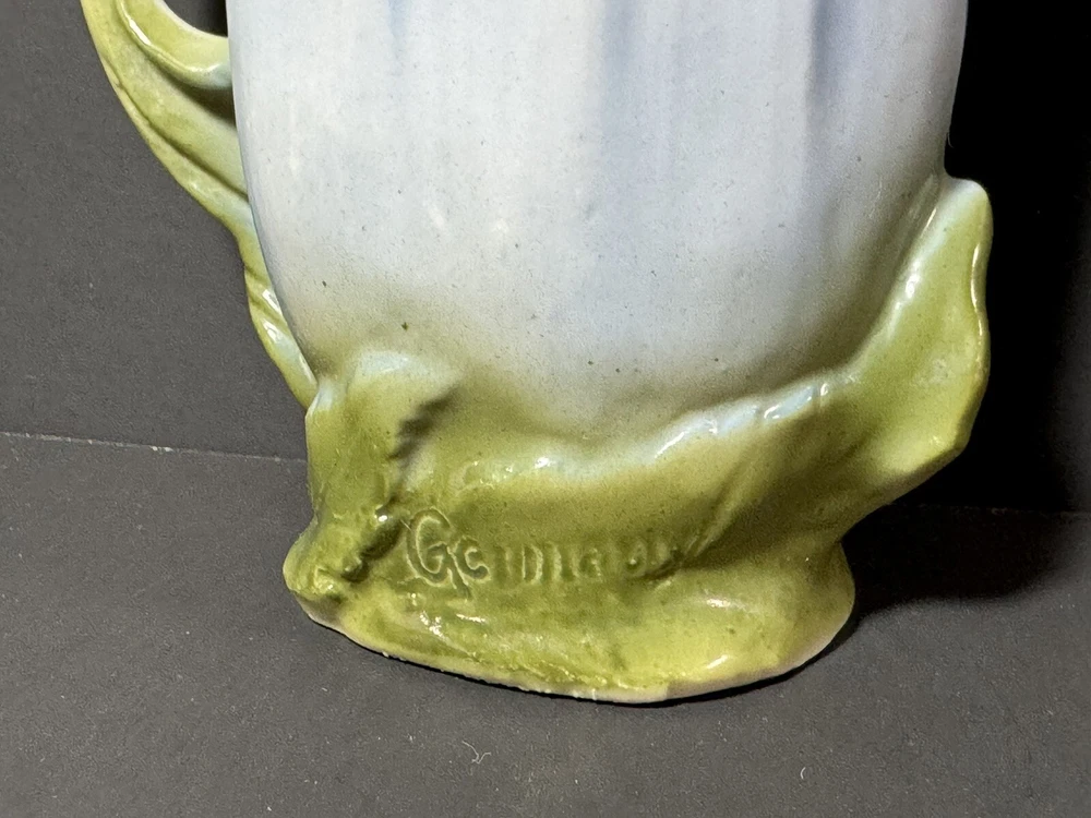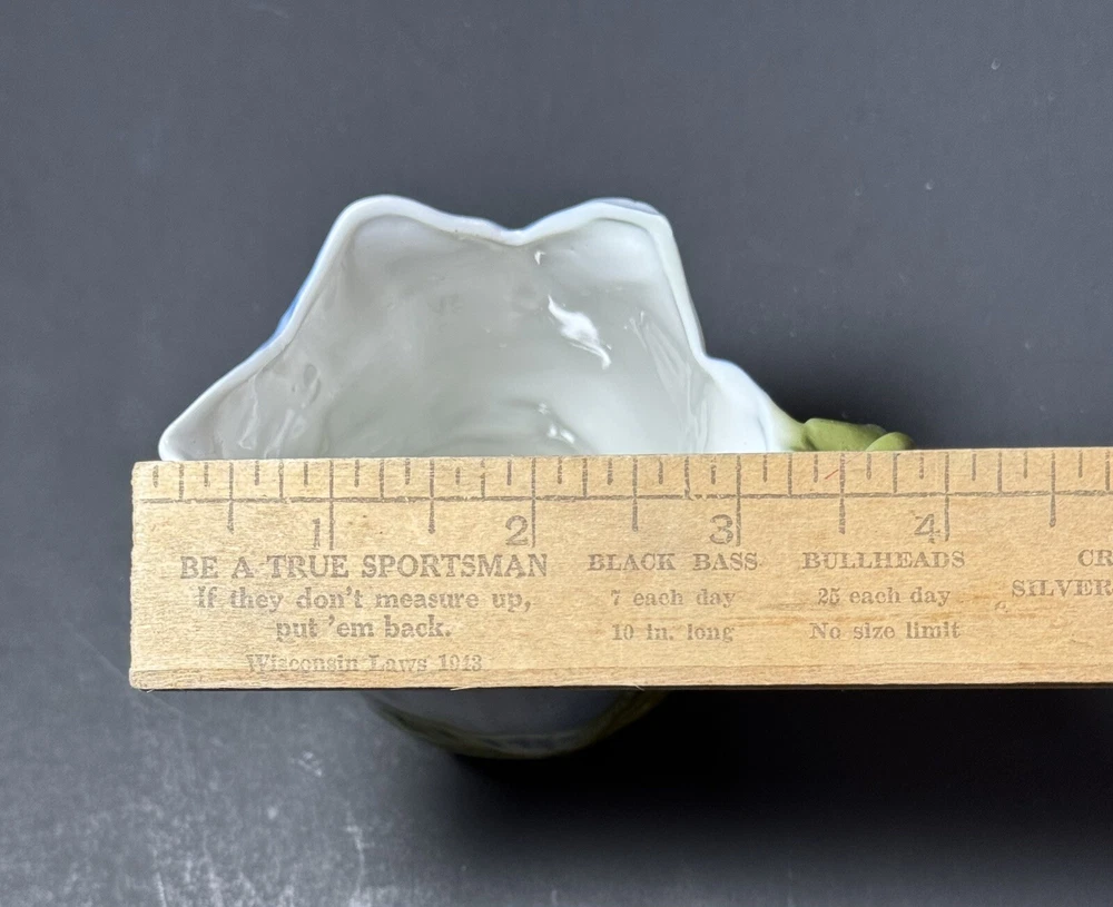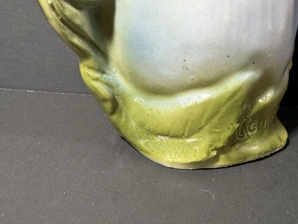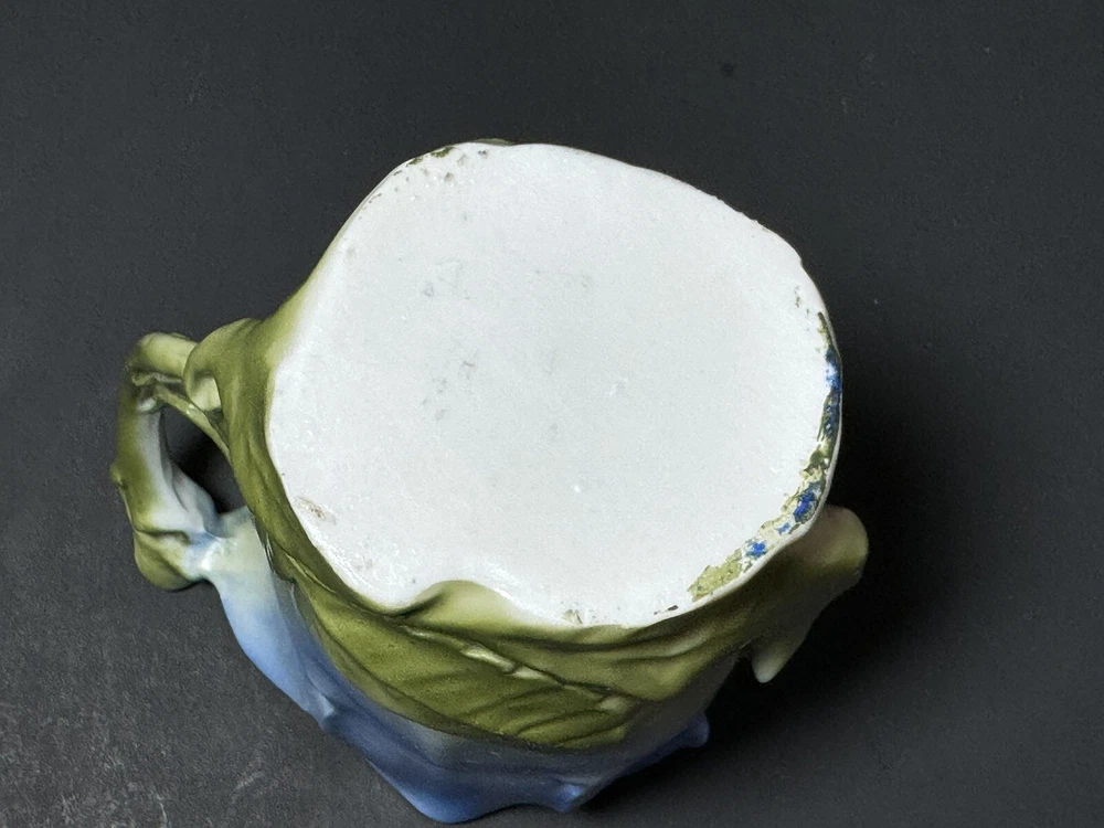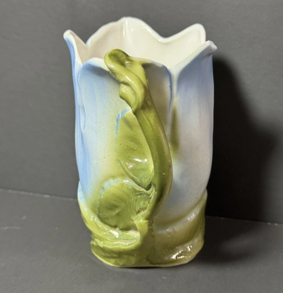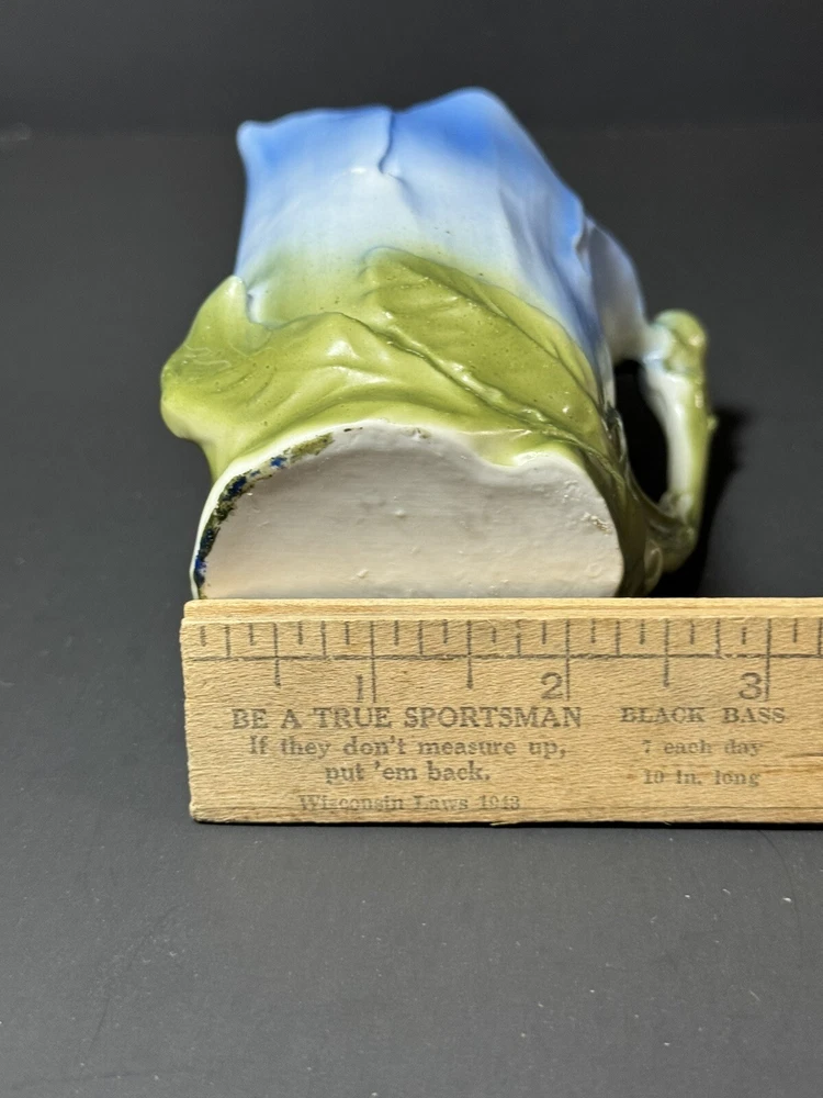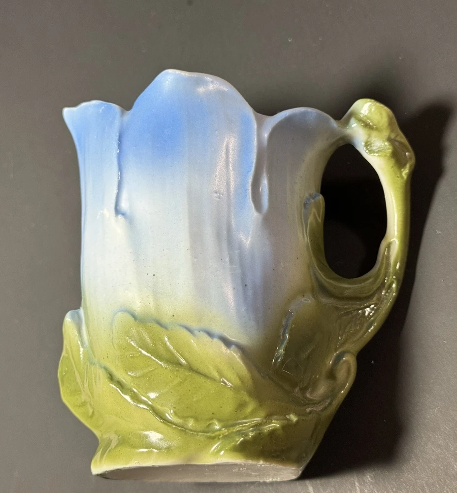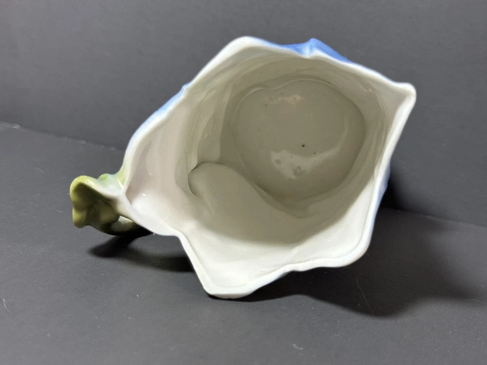 An extremely RARE late 1800’s Floral shaped Ewer or Mug in Bisque porcelain. Impressed on the bottom front with GERMANY. Looks like a Franz or Royal Bayreuth piece, but I wasn’t able to find an identical one like this anywhere! So, I will let the buyer decide the manufacturer of this piece! In excellent condition, with no chips, cracks or paint loss. This tulip or flower shaped mug was often called a Ewer, and used as a decorative vase to hold flowers. It is definitely a unique piece of bisque porcelain, made approximately in the late 1800’s. Measures about 4 1/4” High with a top diameter of 3 1/4” and a bottom diameter of 2 3/8”. A beautiful periwinkle blue color for the flower with shaped petals and green leaves formed around the bottom with a vine or branch shaped handle. A gorgeous piece for any collector! Please look at all my photos as they part of my description and used to show the quality and condition of my items.