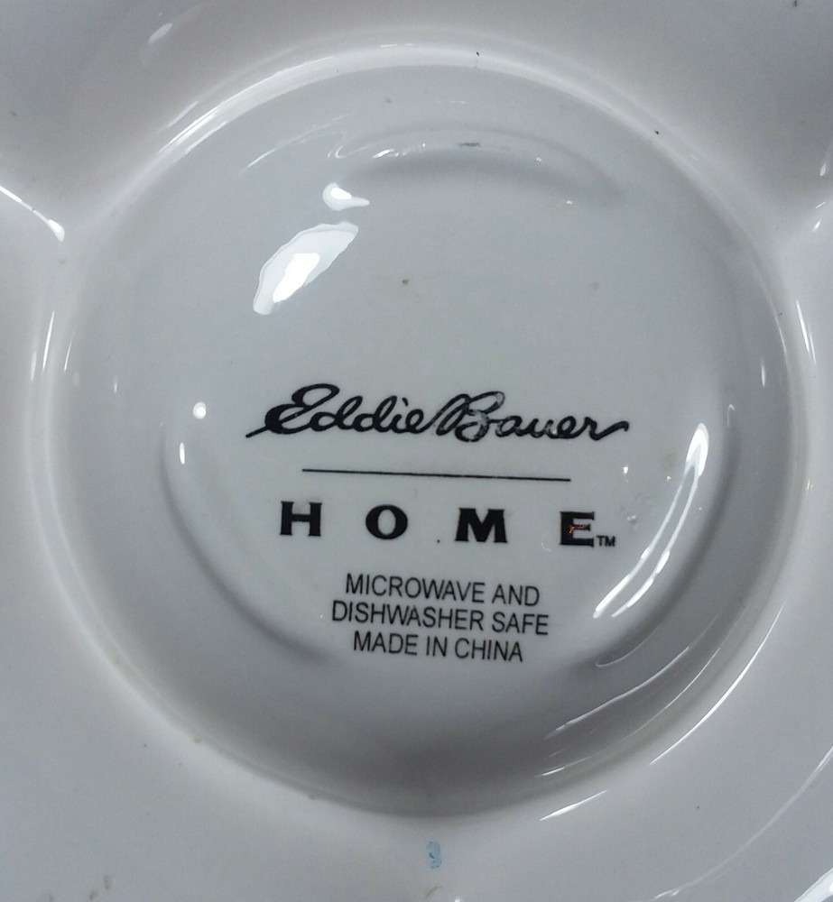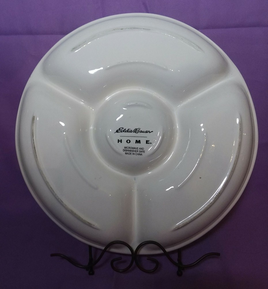 RARE large Eddie Bauer sectioned chip and dip serving platter. The platter is royal blue and is decorated with white sail boats in each section with a white lighthouse in the center dip compartment. It measures 13 inches across and 1 1/2 inches tall. Each side compartment measures approximately 10 inches in length at its widest and 4 inches wide at its widest from inside to inside. The center dip compartment measures approximately 4 inches across inside to inside. It is used but is in pristine condition with no chips, cracks or damage of any kind. It is stamped on the back "Eddie Bauer Home Microwave and Dishwasher Safe Made in China". This is a great piece of tableware that is so versatile it can be used anywhere from pool side to lake side for entertaining or for everyday use. If you see an item that you are interested in be sure to select the (Watch icon) to receive special discount offers on your favorite treasures!!! You can also select the "Make offer" button to offer me a price! You might just get that item at a super great deal! I am always willing to negotiate!!!
