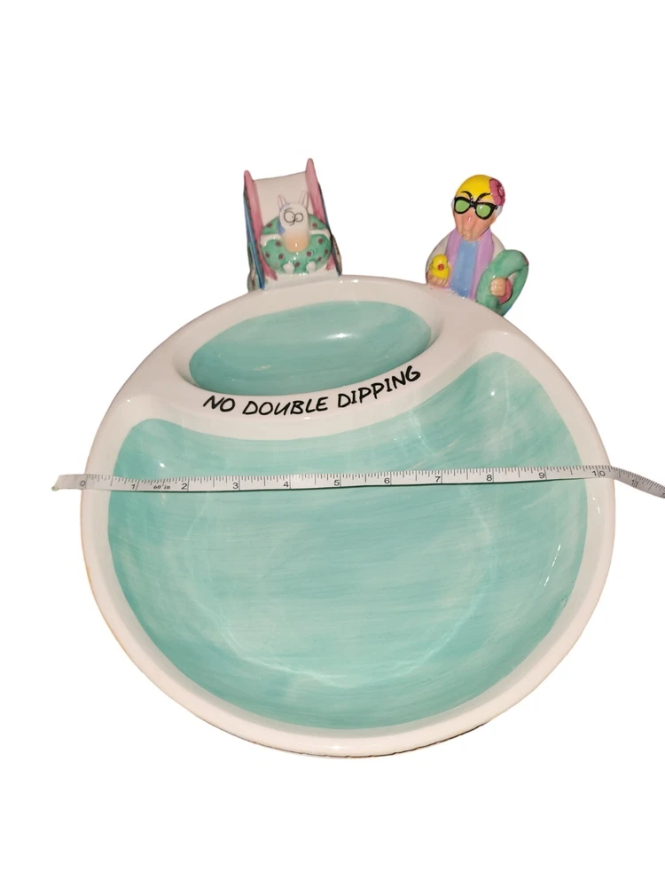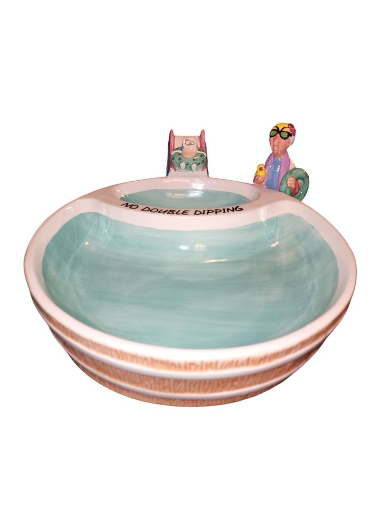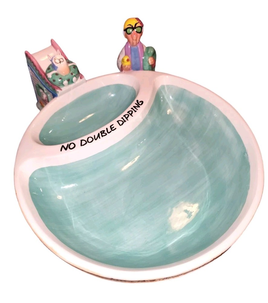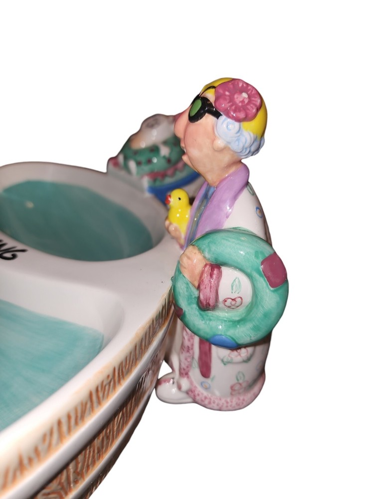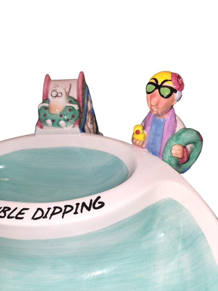 RARE Maxine by J. Wagner "No Double Dipping" Large Pool Themed Chip & Dip Bowl Maxine is back! And she brings her trusty dog, Floyd, along to watch & make sure there is No Double Dipping! This large chip & dip serving bowl is in the shape of a large round pool, divided into the large chip area & small dip area. Attached is Maxine in her bath robe & swim cap, ready for a "dip". At the back is the ladder & slide where you'll find Floyd, already half way down. The piece is a substantial size & measures 13.5"X10"X5", the bowl portion is 10"X10"X2" Marketed originally by Hallmark in the 1980-90's. Signed on the bottom by the creator of Maxine, cartoonist J. Wagner This piece is significantly rare. I found only 3 others anywhere online. Made of ceramic with a glossy paint finish Preowned with only 2 small chips noted to the back, one at the top & one at the bottom of the left ladder rail. From a smoke free, pet friendly home