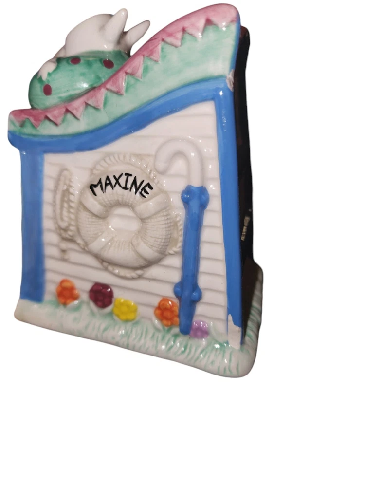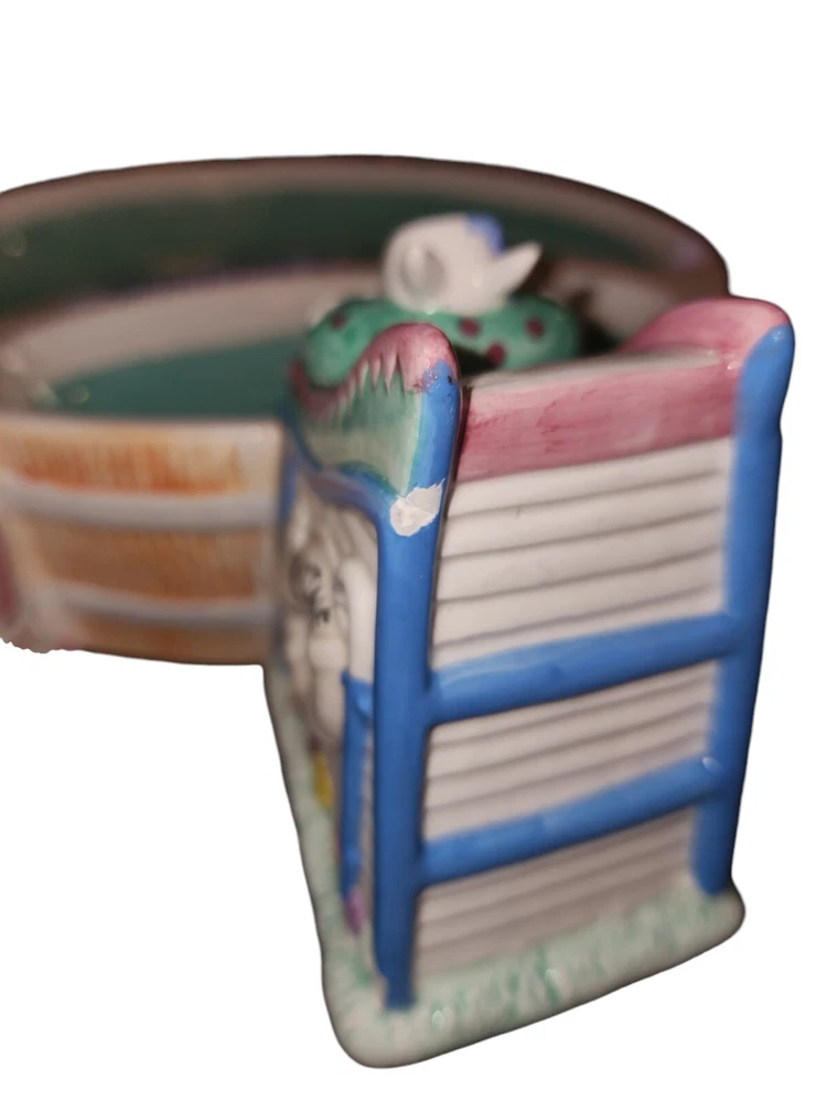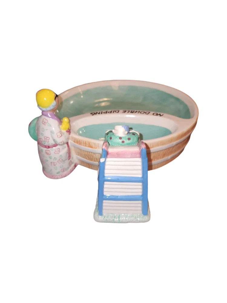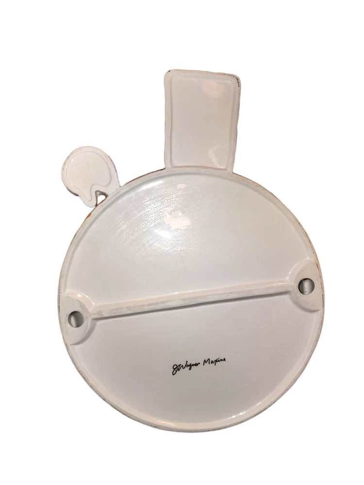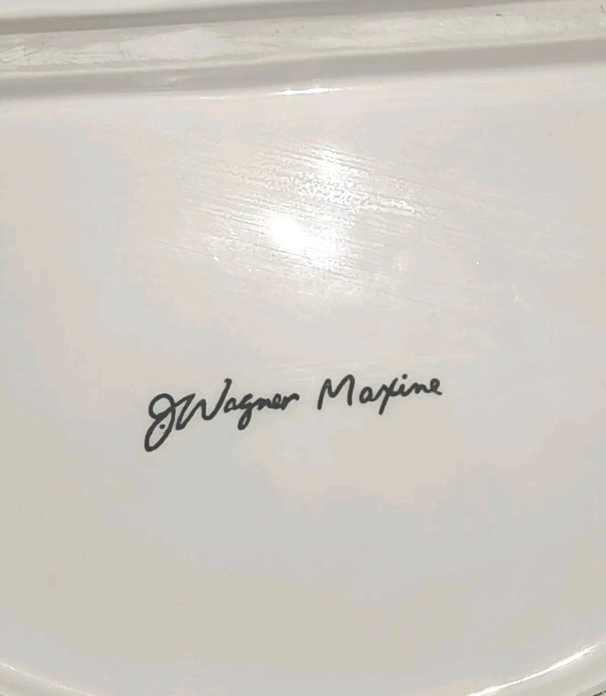 RARE Maxine by J. Wagner "No Double Dipping" Large Pool Themed Chip & Dip Bowl Maxine is back! And she brings her trusty dog, Floyd, along to watch & make sure there is No Double Dipping! This large chip & dip serving bowl is in the shape of a large round pool, divided into the large chip area & small dip area. Attached is Maxine in her bath robe & swim cap, ready for a "dip". At the back is the ladder & slide where you'll find Floyd, already half way down. The piece is a substantial size & measures 13.5"X10"X5", the bowl portion is 10"X10"X2" Marketed originally by Hallmark in the 1980-90's. Signed on the bottom by the creator of Maxine, cartoonist J. Wagner This piece is significantly rare. I found only 3 others anywhere online. Made of ceramic with a glossy paint finish Preowned with only 2 small chips noted to the back, one at the top & one at the bottom of the left ladder rail. From a smoke free, pet friendly home