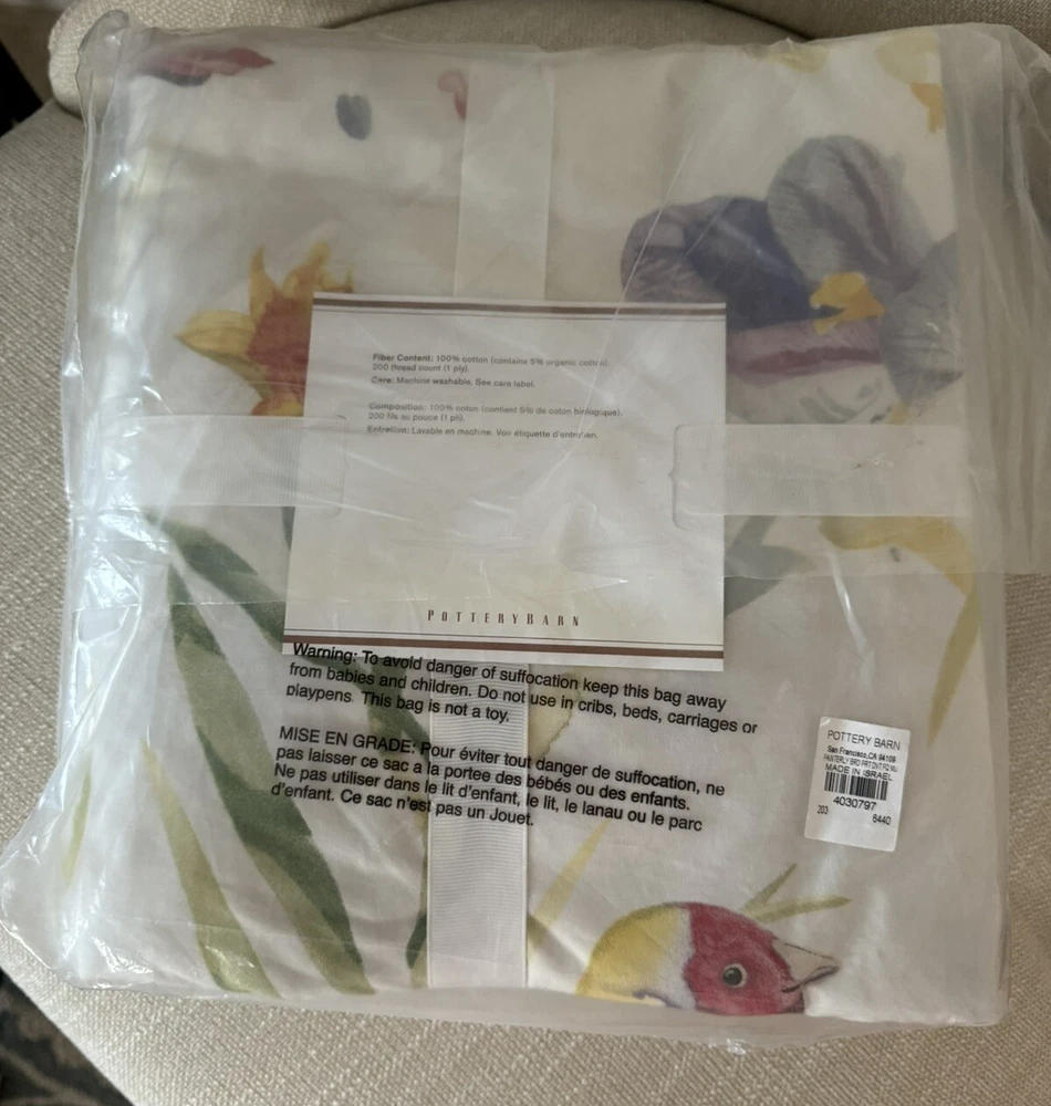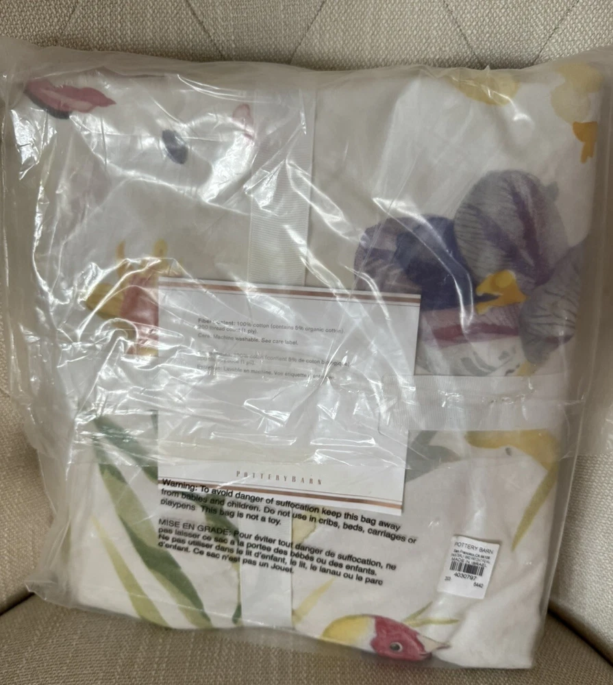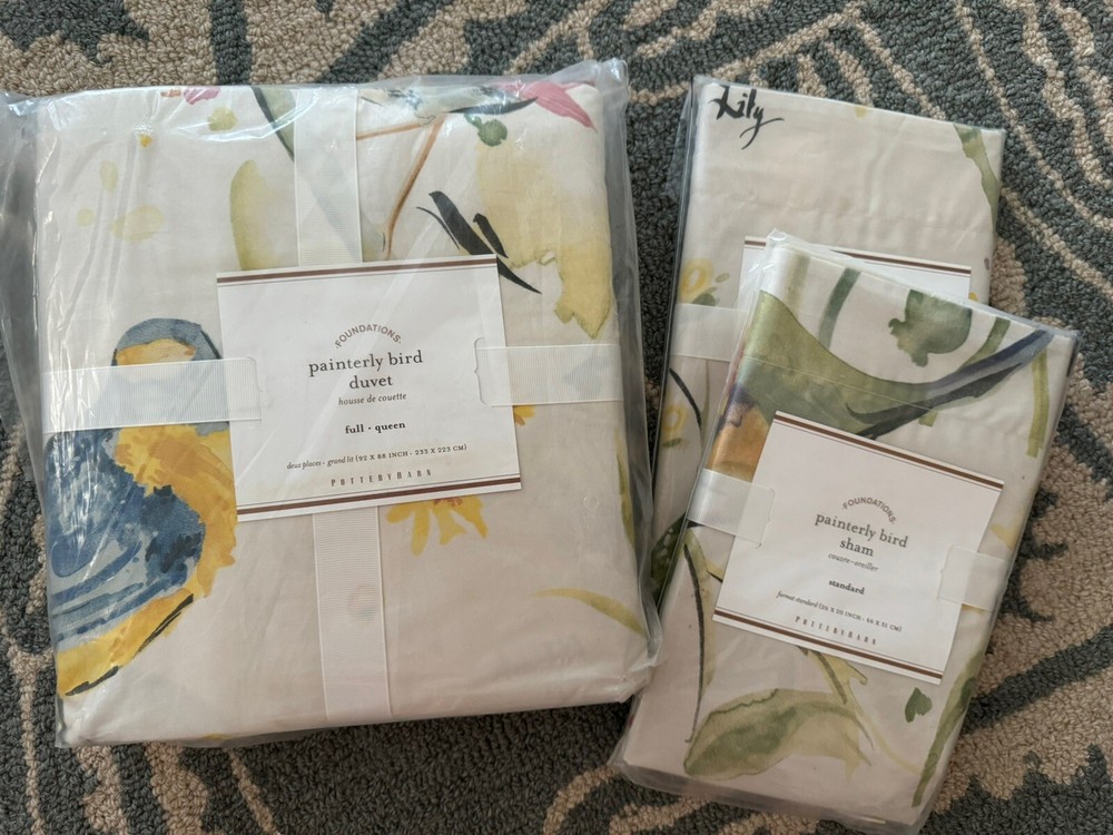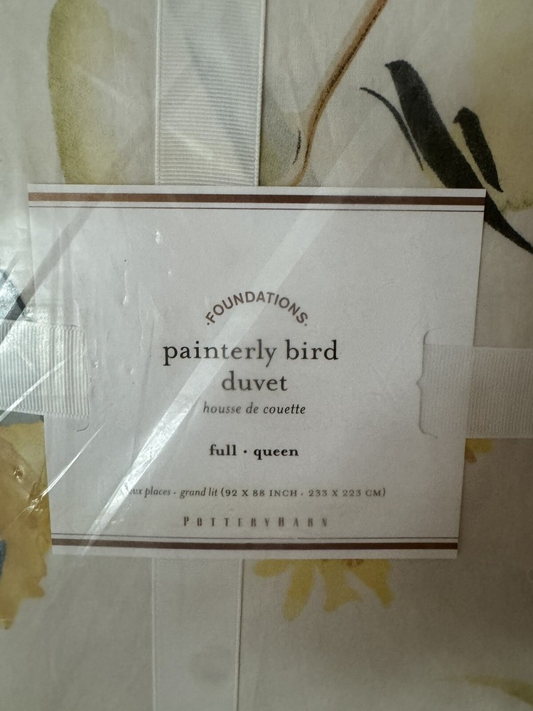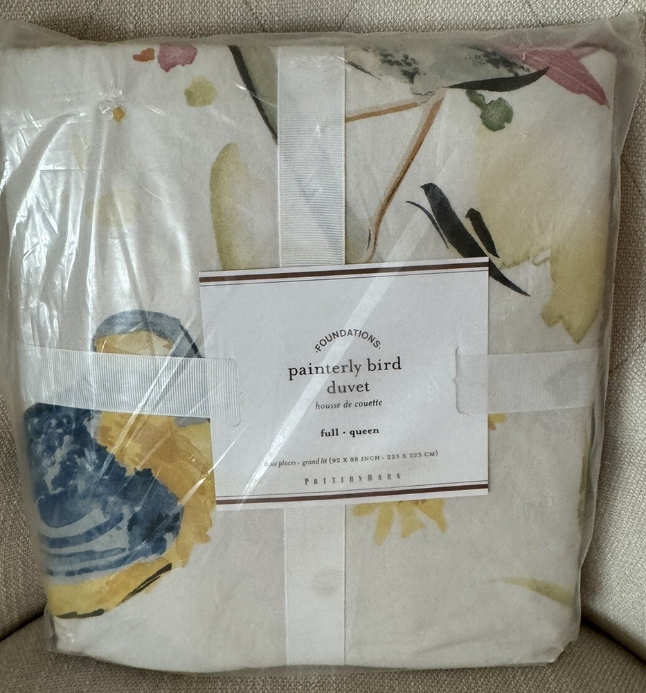 Brand New With Tags Pottery Barn ~Painterly Bird~ Full/Queen-Size Duvet Cover and Two Standard Pillow Shams. Made of 100% cotton. Reverses to same pattern. Duvet features a hidden button closure with inner ties that keep insert in place. Machine wash. Imported. Please let me know if you have any questions or would like additional pics. Also, please ask all questions prior to bidding as I do not normally accept returns, unless I have made a mistake while listing the item. At this time, I am only able to ship to confirmed US addresses... Item comes from a clean, non-pet and non-smoking home. Thanks for taking the time to view this great item, and Happy Shopping!